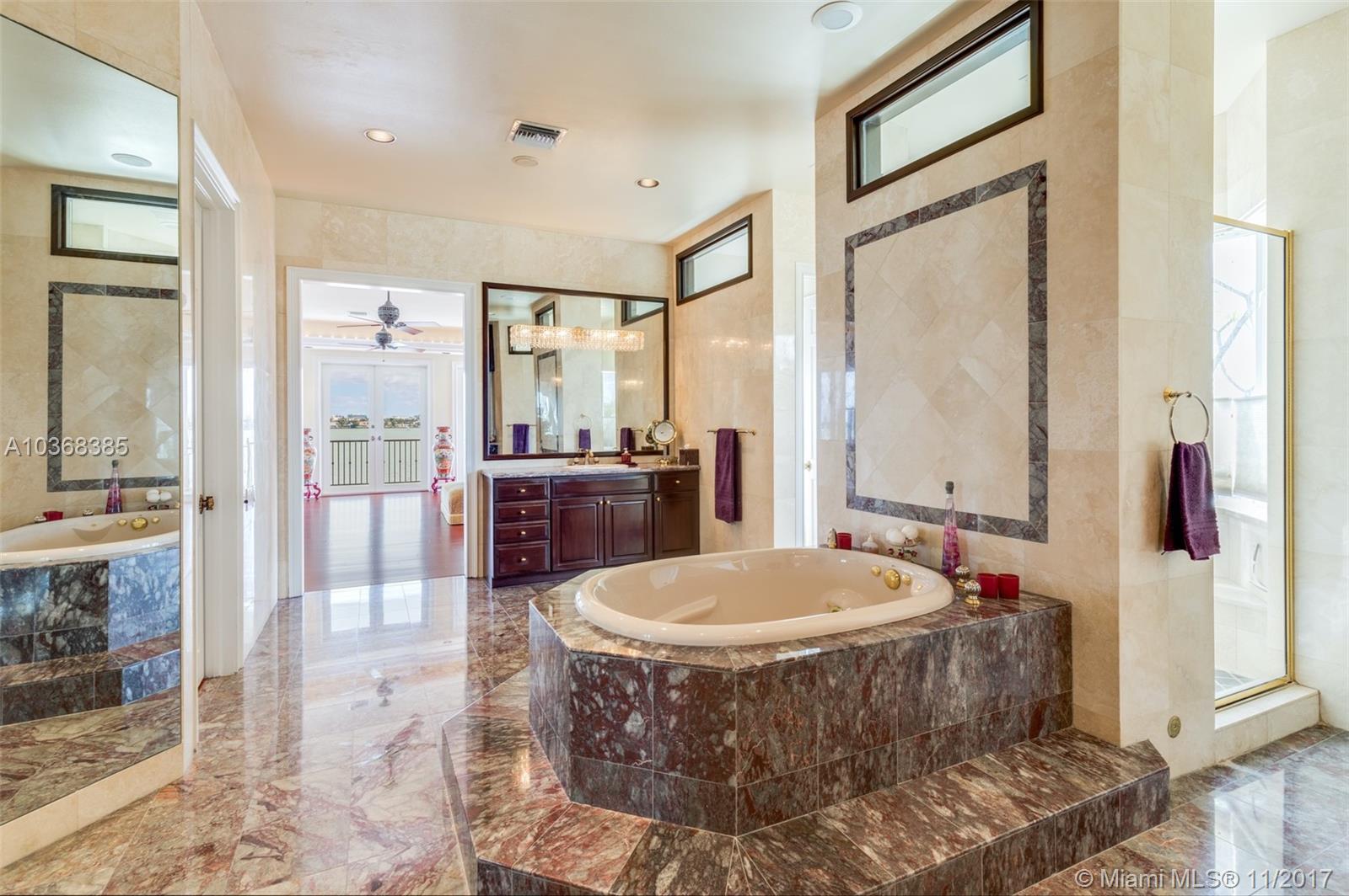 Waterfront Mediterranean Oasis in the heart of Key Stone Island featuring 102 Ft on the open Bay. Sophisticated design featuring grand entry w direct unobstructed water views, impeccable marble floors, volume ceilings, high impact windows & doors, gourmet kitchen w/double wall oven, double refrigerator, gas stove. Master suite bathroom w his & hers everything! Walk- in closets for each. Private terrace w stunning views. Heated pool & spa overlooking new dock. Great for entertaining! Separate guest room w private entry, formal butlers pantry, wet bar, 3 car garage--