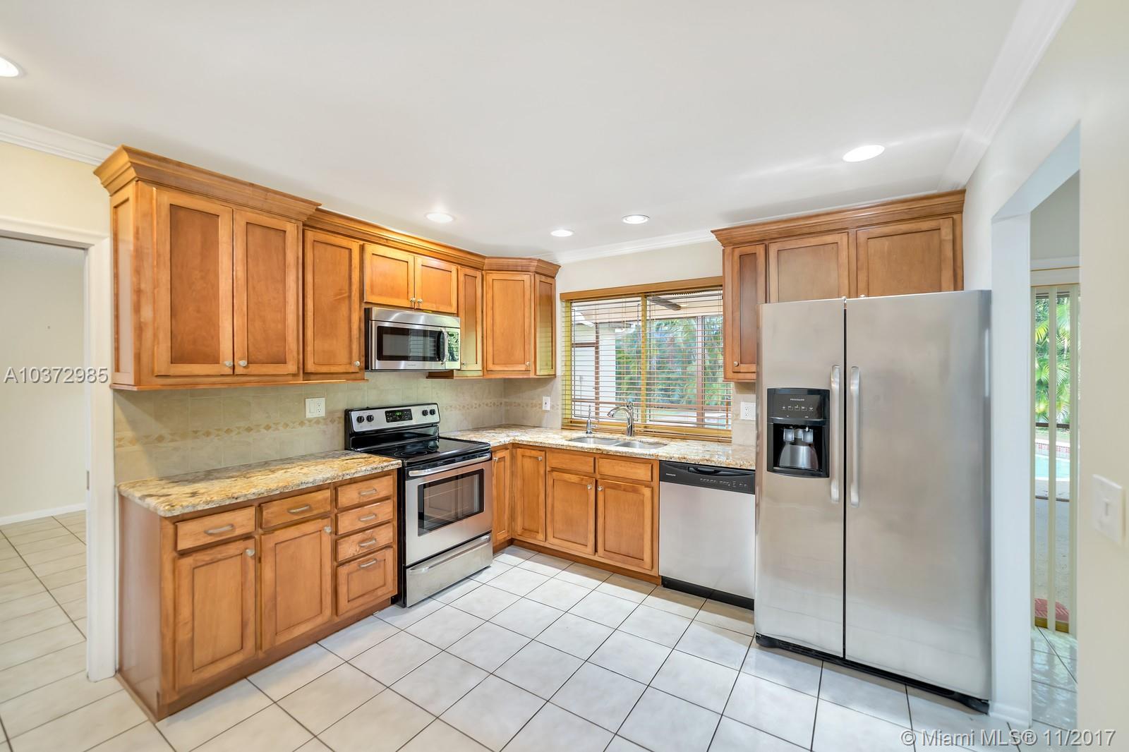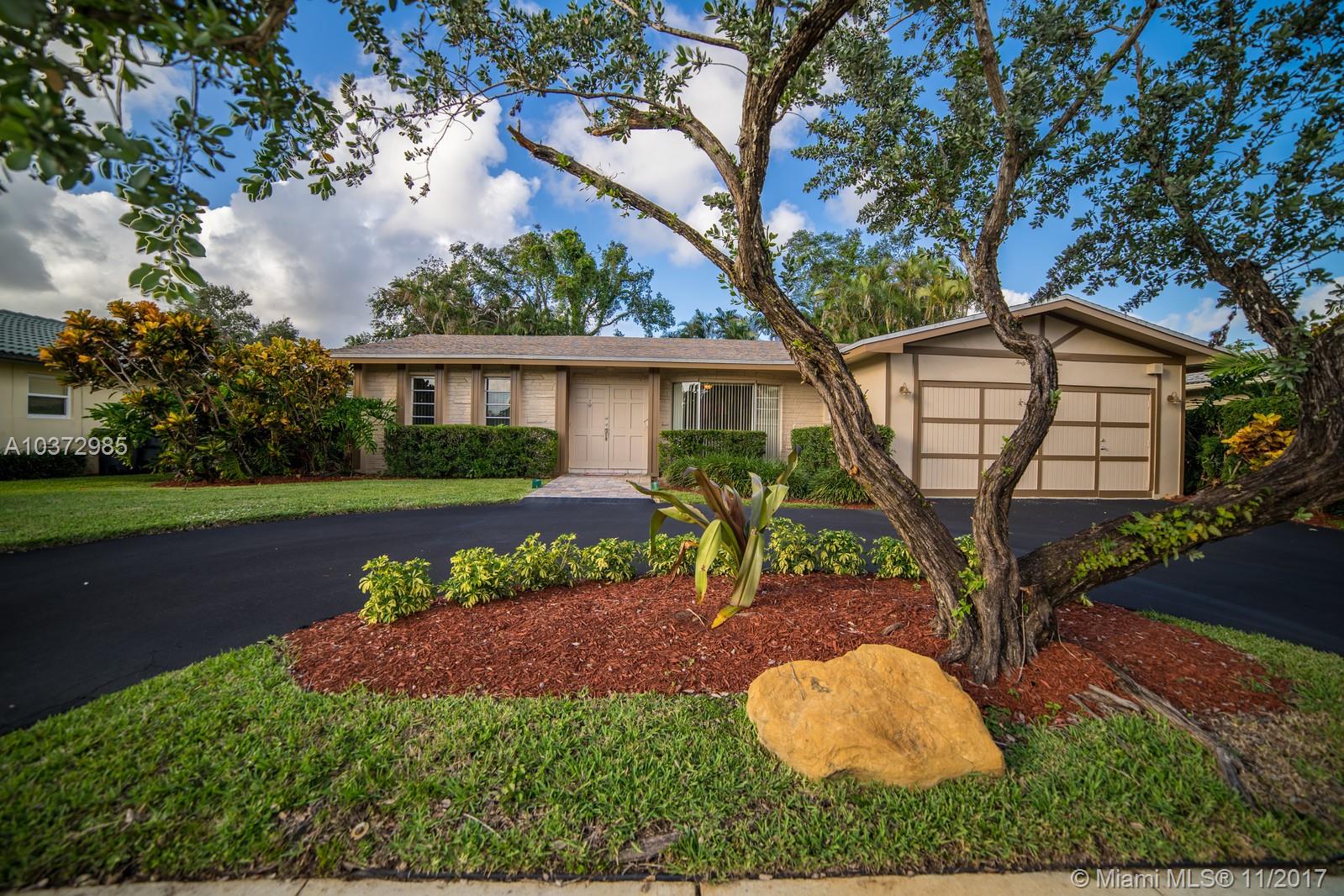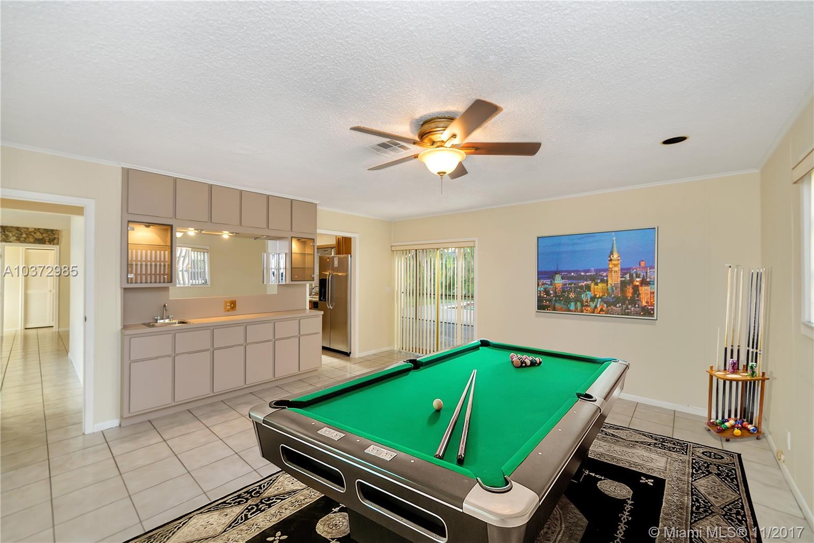 Great Family home in move in condition. Freshly pained inside and out. Lovely neutral tile floors throughout and wood flooring in bedrooms. Updated kitchen with granite counters and stainless steal appliances. Garage converted to large play room with 1/2 bath and storage area. Interior laundry room. Built in bar in family room. Huge screened patio overlooks open pool and private back yard. Walk to houses of worship and shopping center. Sold as-is with right to inspect. Hurricane shutters and security system.