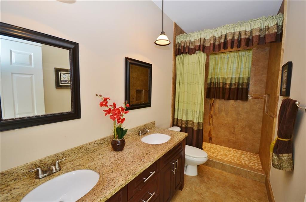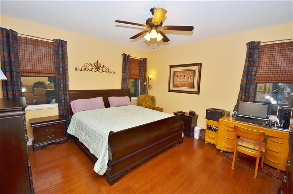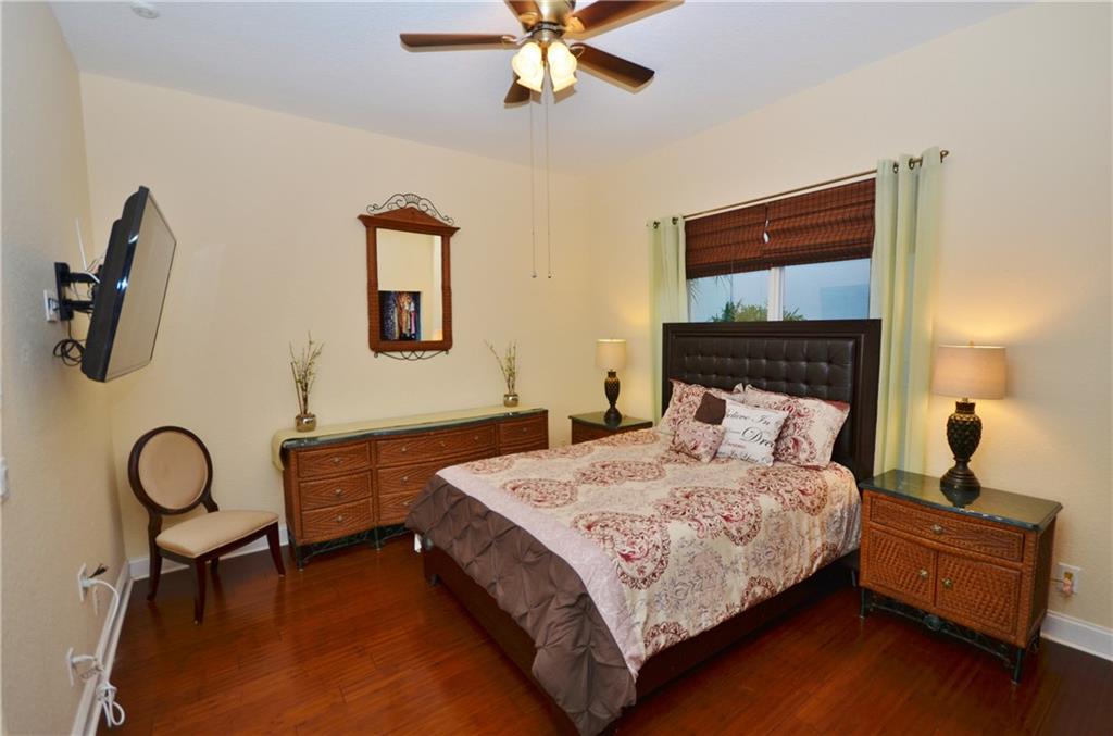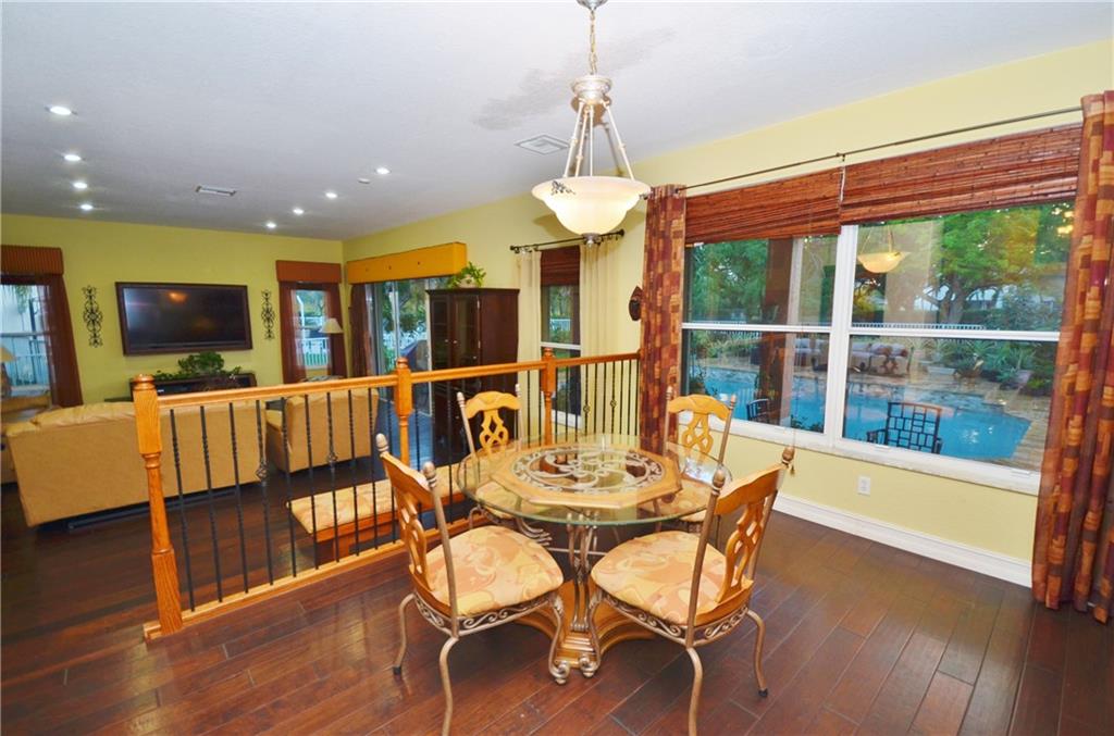Wow!! Enter this expansive 5 bedrooms+ 6th for den or bedroom, full bath nearby, & 2 full sized master suites, with endless possibilities! From the gorgeous REAL WOOD flooring throughout, stunning totally renovated kitchen, with virtually every possible feature, upgraded baths & a grand wrought iron staircase. Custom closets in most bedrooms, recessed lighting, & epoxy garage floor, are only a few features. Travertine Patio & inviting pool & huge yard, & even accordion shutters! Guard gated & Rec Center