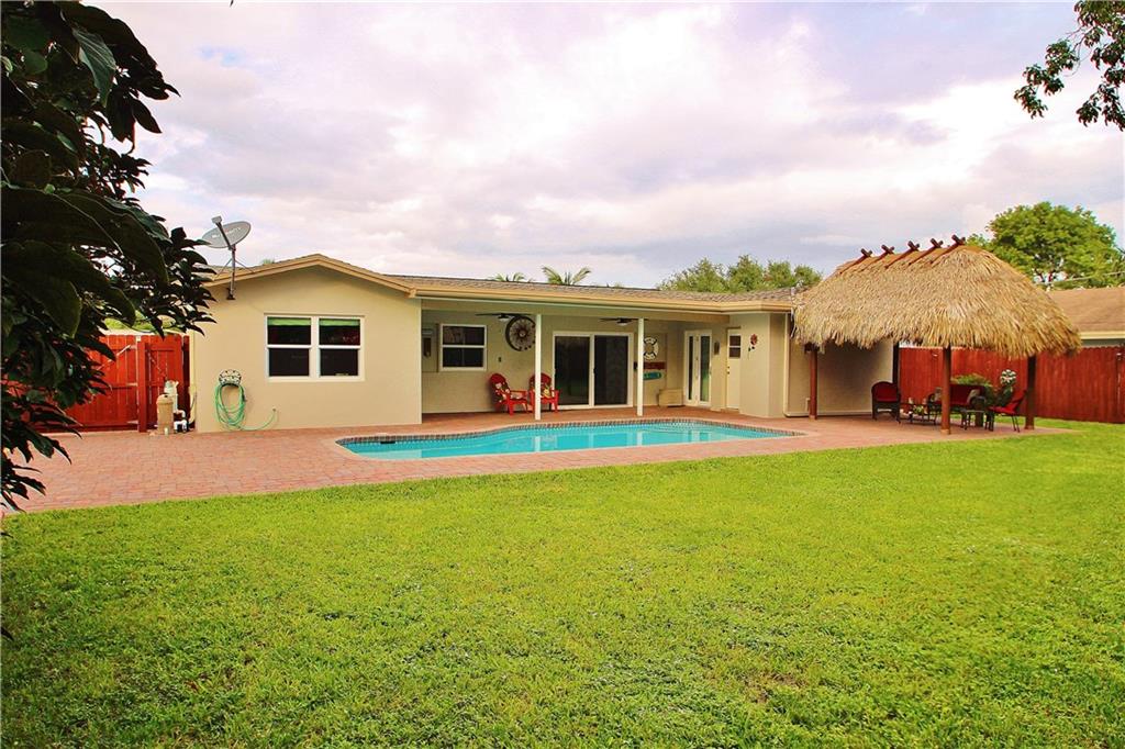 Wow what a rare opportunity to get an awesome "Home" on a Huge, Over Sized Lot in a great location!!. Lovely Open concept Kitchen with Wood Cabinets, Granite Counters & Window onto the Pool/Garden. 30k on Impact Windows, Huge 10,000+ Sq Ft Fenced, Lot, Huge pool with lots of paver area and a large Tiki Hut, Nice Laundry Room, 2yrs on H2O Heater/1 Car Garage/Crown Molding/Gutters/Sprinkler System/Great Roof. Living Room Sliding Doors flow out onto covered Porch Area...