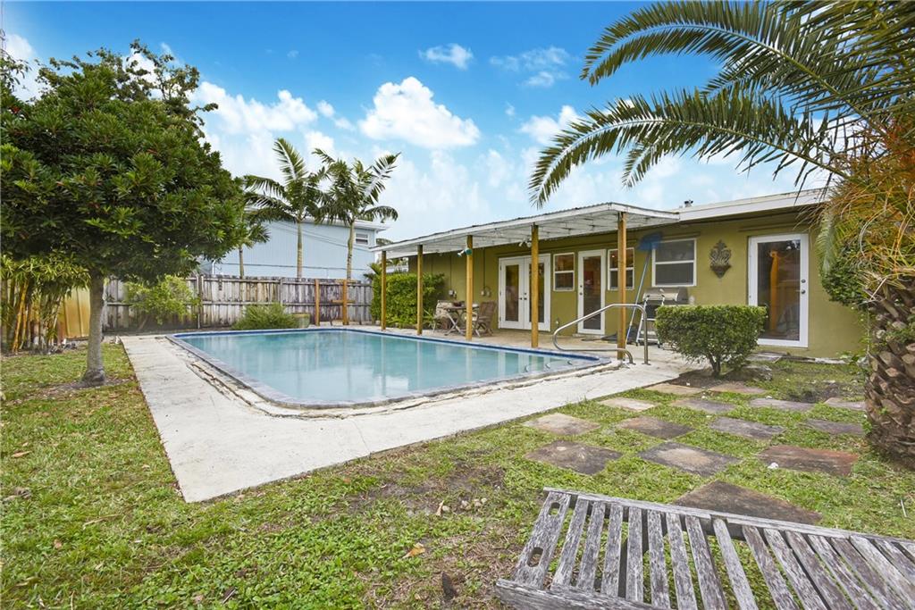 Middle River Manor home with 3-bed, 2-bath pool & carport semi-updated. Large wide open space for kitchen, dining & living room with vaulted ceilings in every room. Kitchen with gas range cooking island, granite, stainless, cherry wood cabinetry, newer appliances. Tile floors throughout. Separate laundry utility room. AC nearly new. Backyard fenced with mature landscaping, covered patio and pool. Pool needs decking to be done. Conveniently located between Wilton Manors & Fort Lauderdale Beach & Downtown.