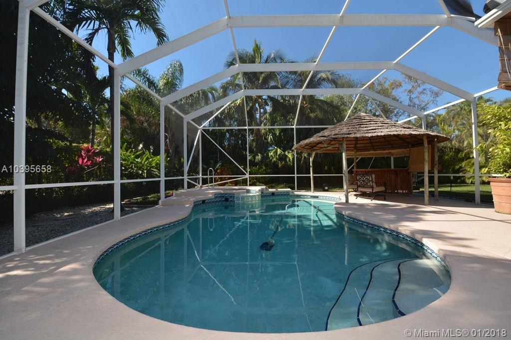 This home is waiting for you! 3 way split bedroom plan, 4 bedrooms & 3 full baths, 3 car garage, situated on a huge professionally landscaped & very private Cul-de-Sac corner lot . Enjoy your very own private resort, solar/ electric heated salt water pool & spa, multi colored LED pool lighting, chlorine generator, HE pool pump with wireless remote & auto controls, Tiki-Hut Bar with TV, refrigerator for entertaining family & friends, huge back yard, screened patio, Newer kitchen, updated stainless steel appliances & wine cooler, granite countertops, updated baths, wood & tile floors, custom built in closets, freshly painted interior & exterior, Impact doors and accordion shutters, energy efficient LED lighting, newer hot water heater, 24 hour guard gated private community.