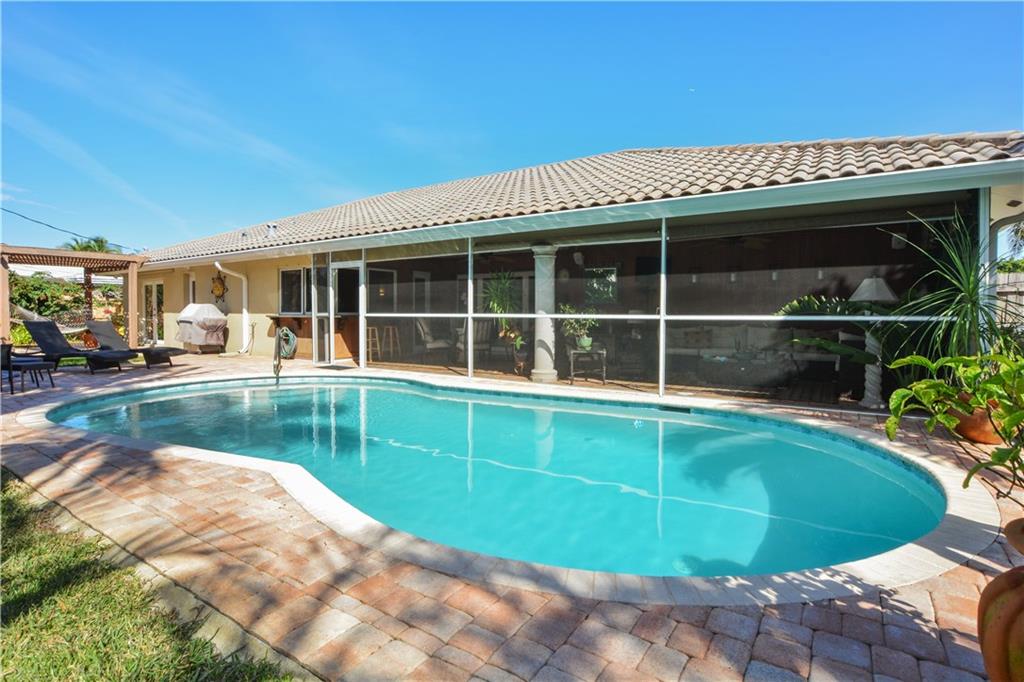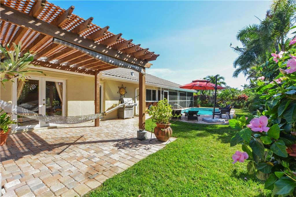 Beautifully designed inside and out this 3BR/2BA/2CG/Pool home positioned on a quiet street offers a desirable split bedroom floor plan. The foyer entry flows seamlessly to living and dining rooms and opens to a sunny kitchen with center island. A large outdoor living room offers easy access to the sun drenched pool and manicured gardens. Nothing to do here but enjoy the South Florida lifestyle. Perfect for entertaining. Don’t miss this one!