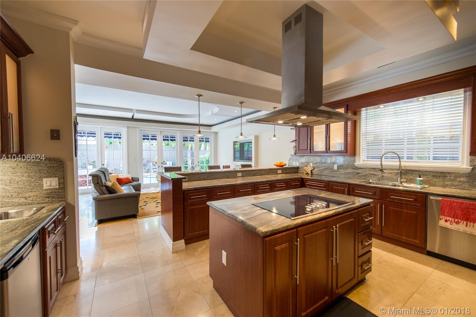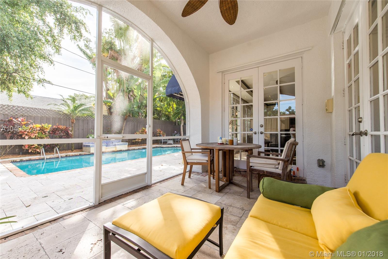 Lovely European-inspired home in lush South Coconut Grove. Dramatic double-height ceilings and clerestory windows create light-filled living spaces w/ a blend of classic and contemporary architectural features. Renovated in 2009. Expansive formal living & dining rooms overlook tranquil pool surrounded by travertine terrace. Elegant custom kitchen w/ wood cabinetry, granite countertops, top-of-the-line stainless appliances, center island & bar seating. Oversized master suite features separate sitting area, 2 walk-in closets, private terrace & luxurious master bath with spa tub. 3 bedrooms 2 baths + den/office upstairs and 1st floor guest suite. Close to the Grove village center’s galleries, boutiques, cafes and bayfront parks & marinas. Minutes to downtown, MIA, Key Biscayne & the Beaches.