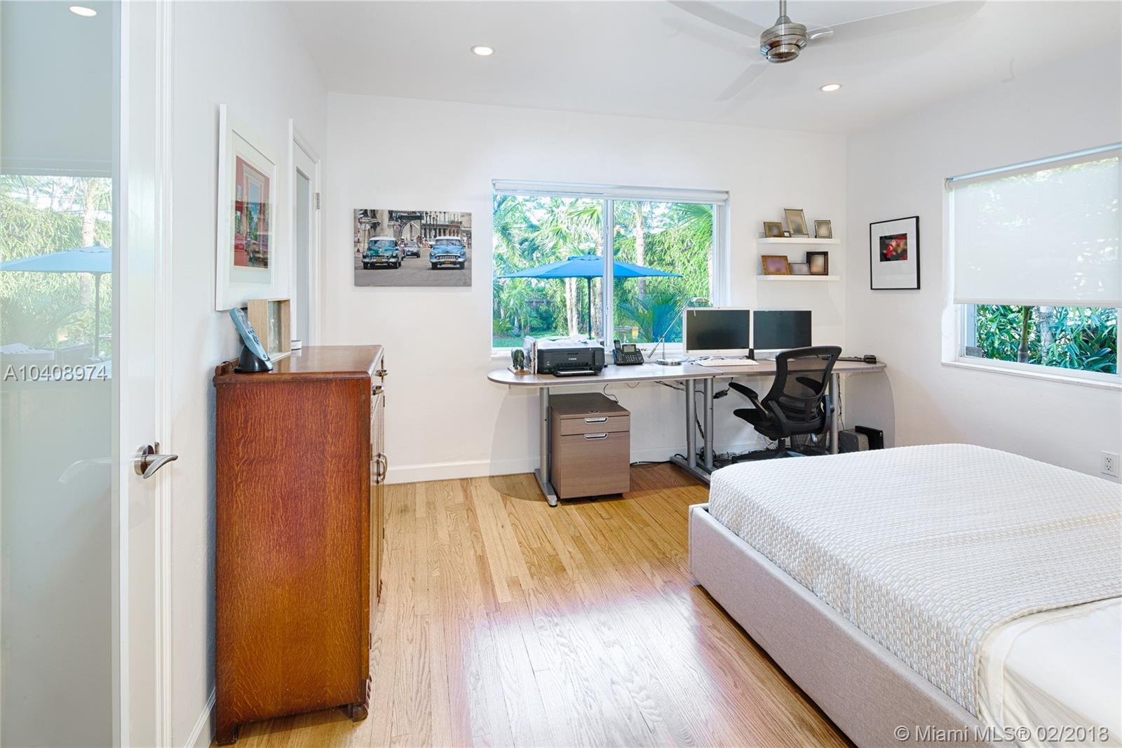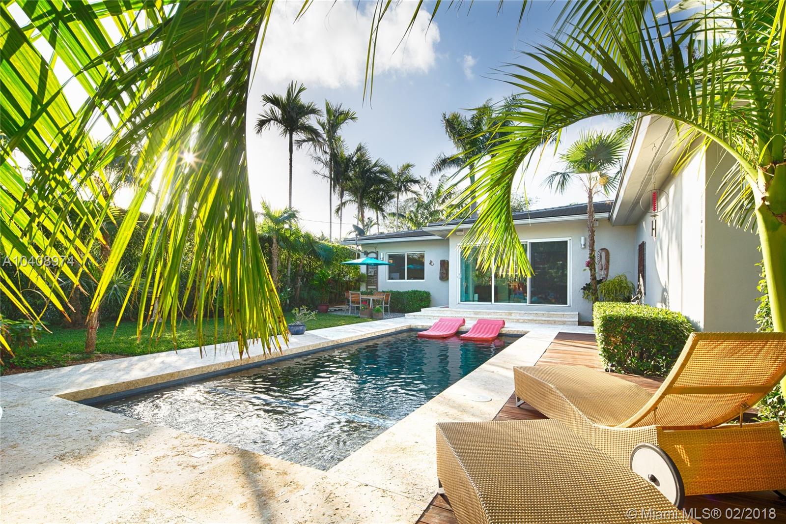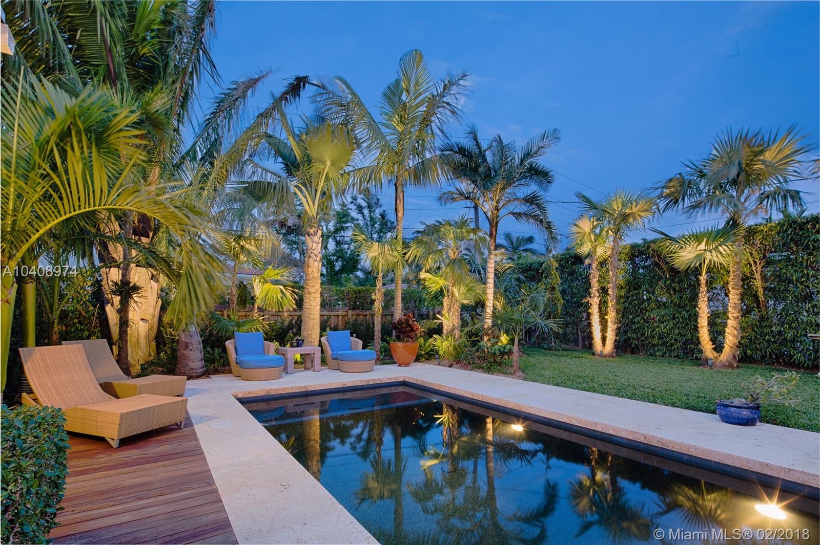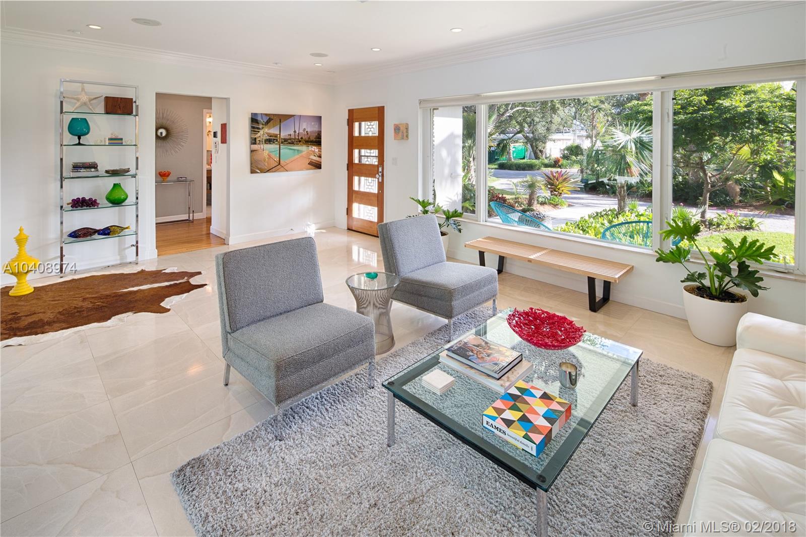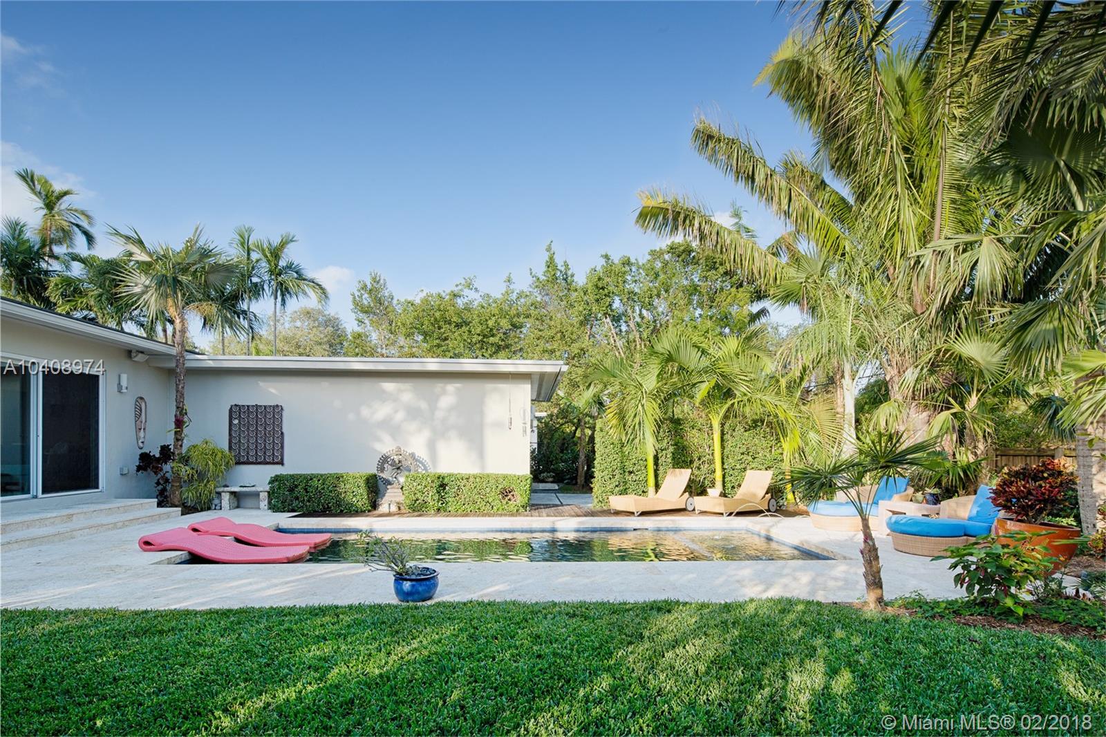 This Exquisitely updated Midcentury inspired home is just a block from Biscayne Bay, carefully modernized to achieve a new level of luxury living in Miami Shores. This 3 bedroom/2 bath home exudes tropical elegance with a botanical garden inspired landscape and Café Imperial limestone floors. Stunning views through large sliding doors transform the space into a true in/outdoor living experience. A boutique Hotel inspired saltwater/heated pool flanked by Philippine shell stone, and Ipe decking. Custom contemporary kitchen has generous white quartz island with top of the line Thermador stainless steel appliances. New roof with warranty, newer Trane AC with warranty, impact glass windows, hardwood flooring, Eco-R30 insulation, 2 car garage with rear entry access, FEMA certified property.