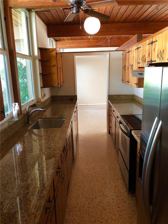 Charming mid century at its best! Corner lot, spacious 2/2 with an office, designed by legendary William Vaughn. Featuring terrazzo floors, granite counters, impact glass, pine woodwork, many great out door areas, covered parking, pavers all in a gardner like setting. This home has a new roof and is turn key! Don't let the thick vegetation fool you! Truly a rare find!