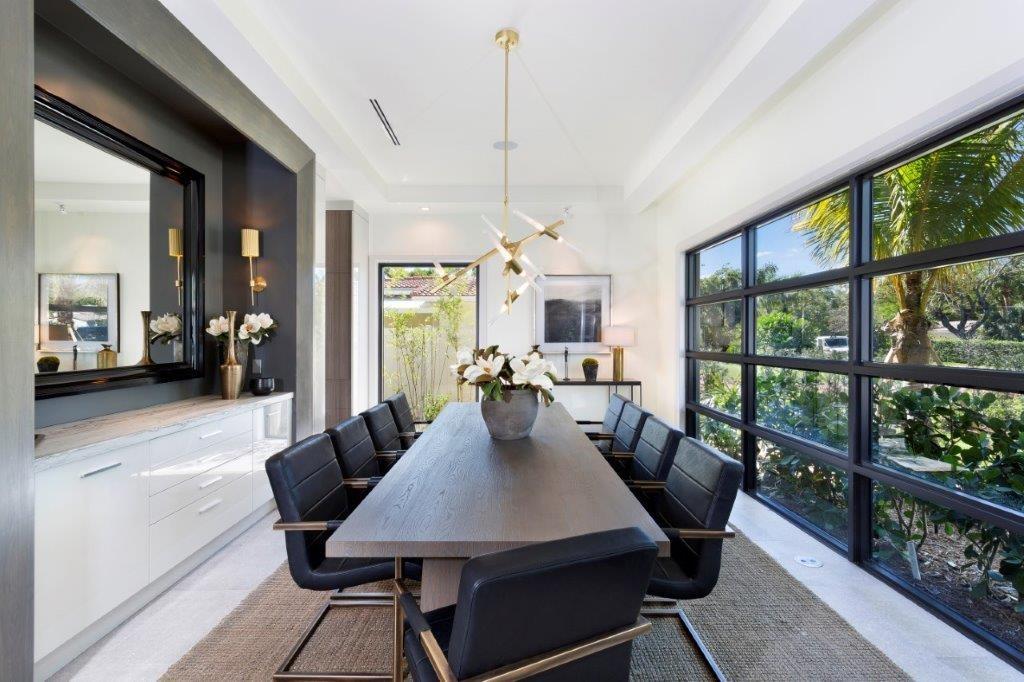 The circular paver drive, leading to a fenced courtyard entry to this open contemporary design, is defined on either side by islands of lawn, low shrubs and graceful palms trees. A privacy fence surrounds the sides and rear perimeter, ensuring an oasis of tranquility. An open rear courtyard off of the living room features a gas-heated pool and elevated spa served by an outdoor shower and cabana bath. A conversation/lounging area beyond the spa is delineated by its slightly elevated wooden deck. The long covered loggia off the family room includes a built-in gas grill for dining alfresco.