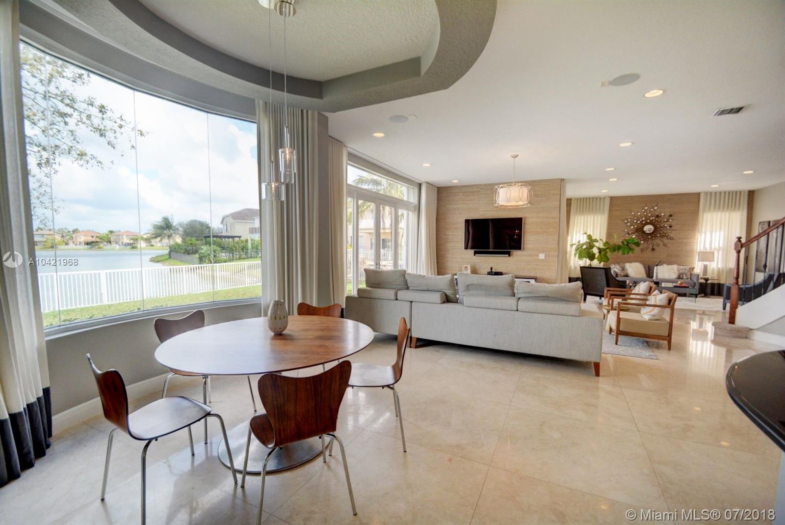MAGNIFICENT LAKEFRONT, designer perfection 5143 total square feet, 3'x 3' Crema Marfil marble flooring throughout first floor, upgraded granite kitchen with butler’s pantry, stainless steel appliances, double ovens, custom linen drapes adorn living room and family room areas, 8 foot tall glass French doors lead to the backyard with waterfront views, accordion shutters and impact windows, new lighting, freshly painted, 2 newly remodeled bathrooms, huge master bedroom suite with outside balcony, extra-large walk-in closet with built-ins, master bath with whirlpool tub, glass enclosed double head shower, formal dining room, fenced yard. Located inside Riviera Isles Resort-Style community, 24/7 guard gated. Amenities include: tennis & basketball courts, fitness center, lagoon-style pool.