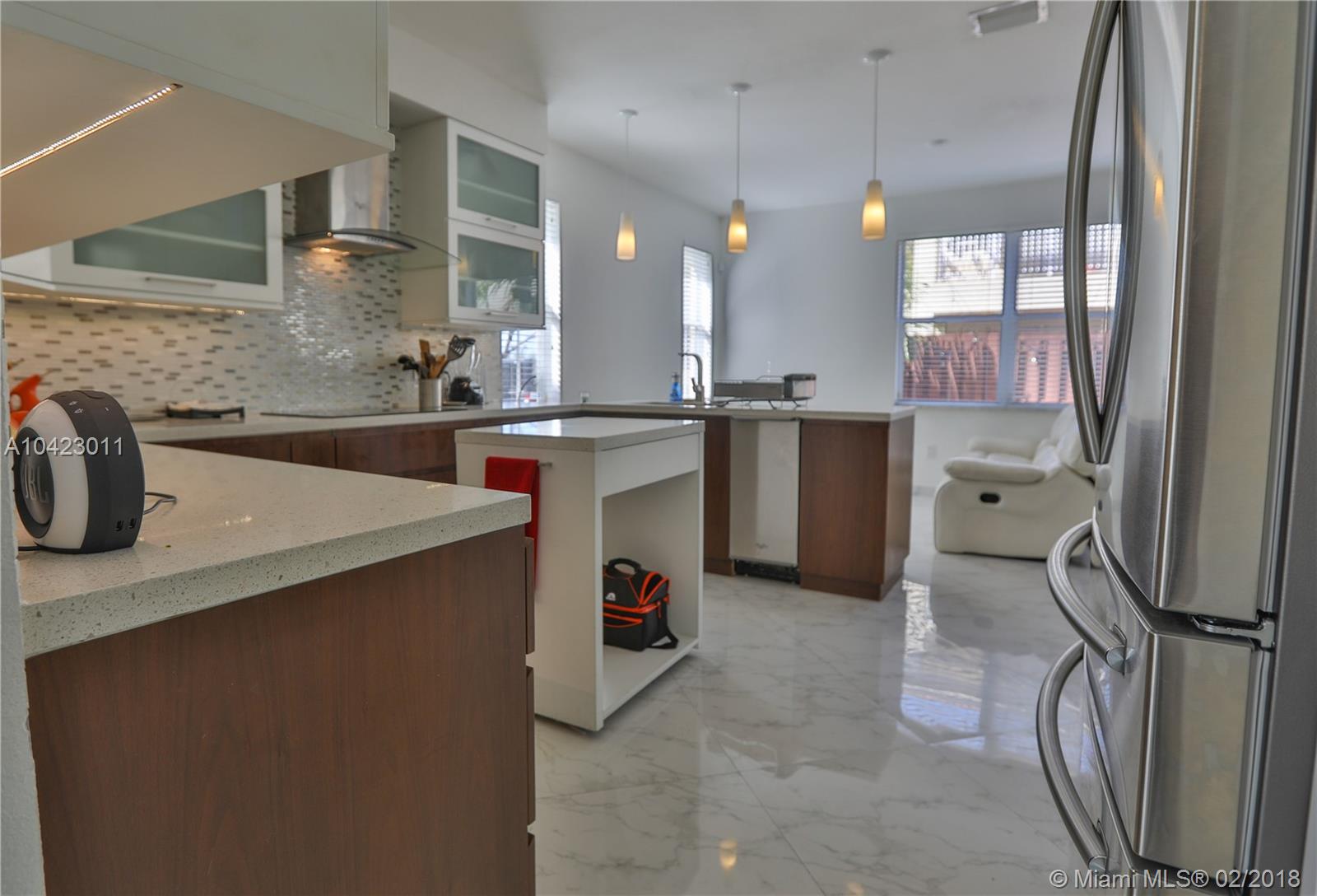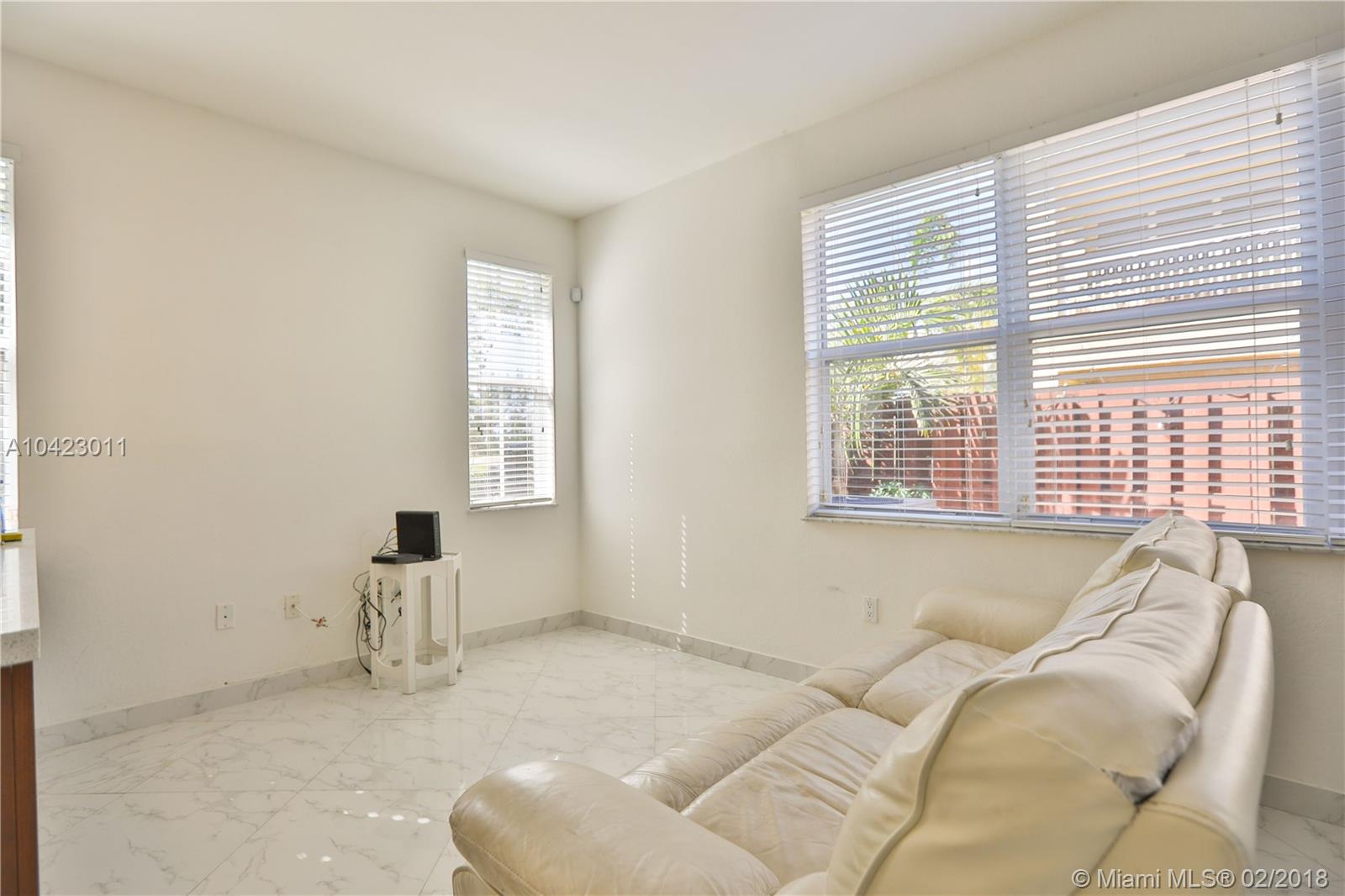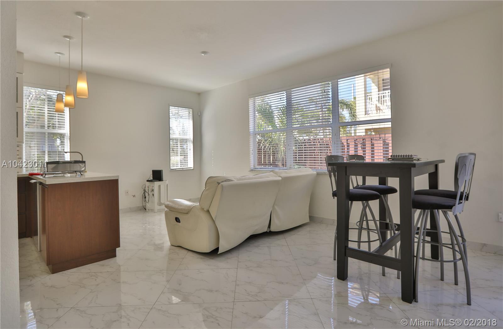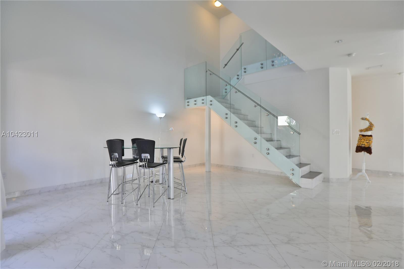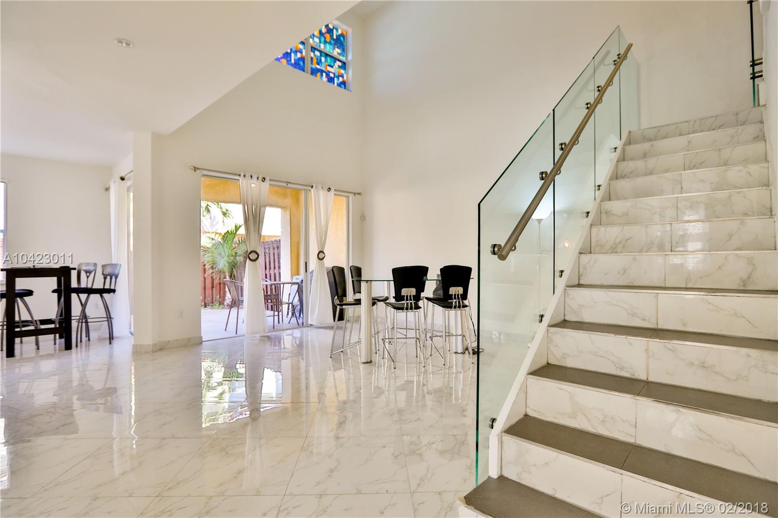 Enjoy Modern Elegance in this 4 Bedroom 3.5 Bath home in the highly desirable are of Doral. Completely upgraded with Porcelain tile throughout & carpet in bedrooms. Contemporary design includes a master bedroom downstairs, 1/2 bath for your guests, dining room, living room, laundry room, one car garage & covered terrace leading to your tiled fenced in patio. Gather in the completely remodeled kitchen with designer Italian cabinets, top-of-the-line stainless steel built-in appliances, & Granite counter tops. The family room boasts 20 foot high volume ceilings with a glass & stainless steel staircase that lead you upstairs to 3 additional bdrms including a spacious master bdrm with 2 large closets, Cedar wood Sauna & private balcony. Plenty of available parking and minimal association fee.