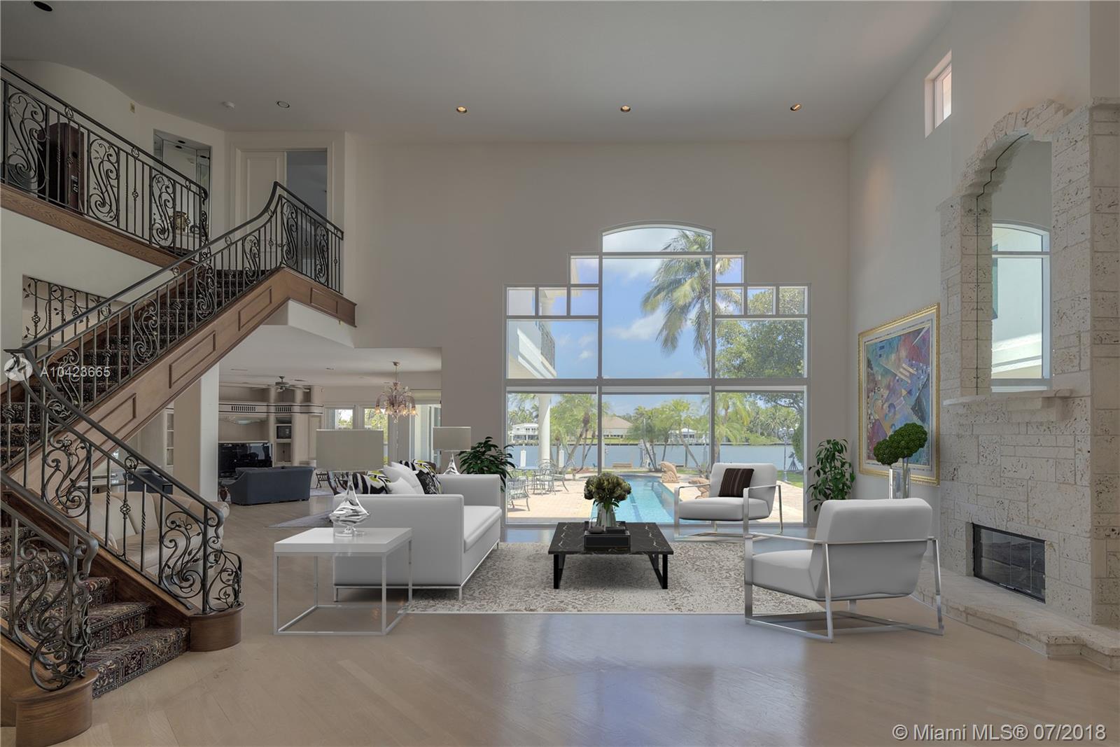 This is a rare opportunity to own a large, one of-a-kind, 100 ft waterfront masterpiece, perfectly located on a lushly landscaped oversized 23,400 SF Lot with over 6000 SF. Property features: Soaring ceiling heights, 5 bed 6.5 baths, 3 rooms are ground level - 2nd floor extra large master suite with huge loft area , additional detached room and bath, 2 car garage , porte cochere entrance , pool side bath, Generator , Impact glass and doors , Hardwood floors thru out, a stylish pool area with 80ft Dock and Boat lift up to 14,000 lbs, AND Gorgeous water views everywhere! Open House Saturday June 9th, 11AM-2PM.