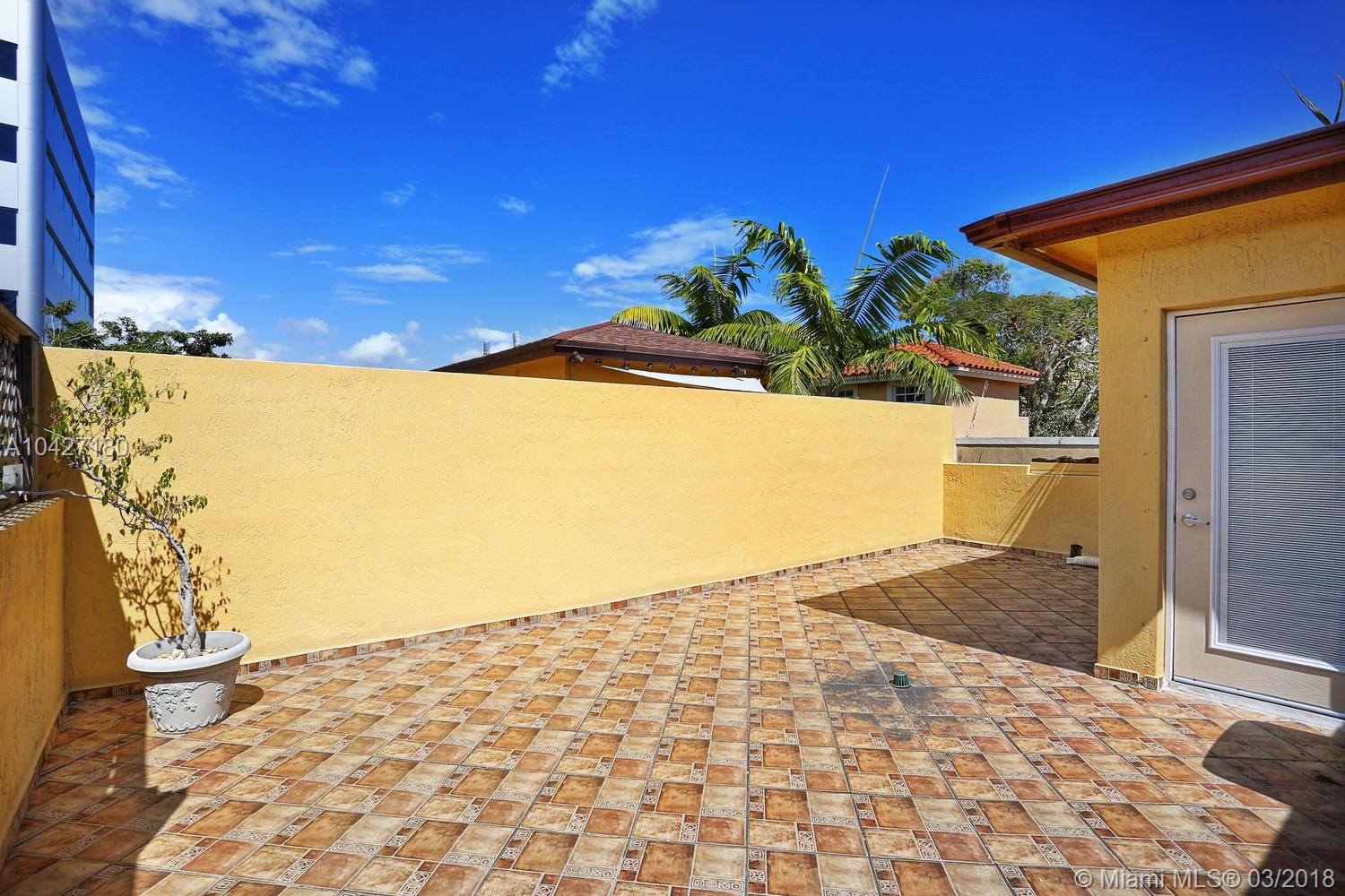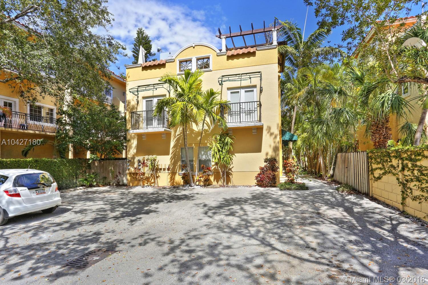 Very well maintained Coconut Grove town home located on a tree lined, low traffic street. Private patio on the first floor. Private, secluded, roof top terrace on the third floor. Open floor plan. Lots of natural light. High ceilings. Full size, front load washer and dryer. Storage/pantry under the stairs. Two nice size rooms with full bath on the second floor. New carpeting in both bedrooms. Nice size closet space in both bedrooms and linen closet in the hallway. New light fixtures. Freshly painted. Low maintenance fee of $175/month (paid quarterly) that covers the exterior insurance and all of the common area maintenance (gardening, common area lights, gate, phone entry, legal, accounting etc). Gated and secured parking for two assigned spaces. Steps from Downtown Coconut Grove.