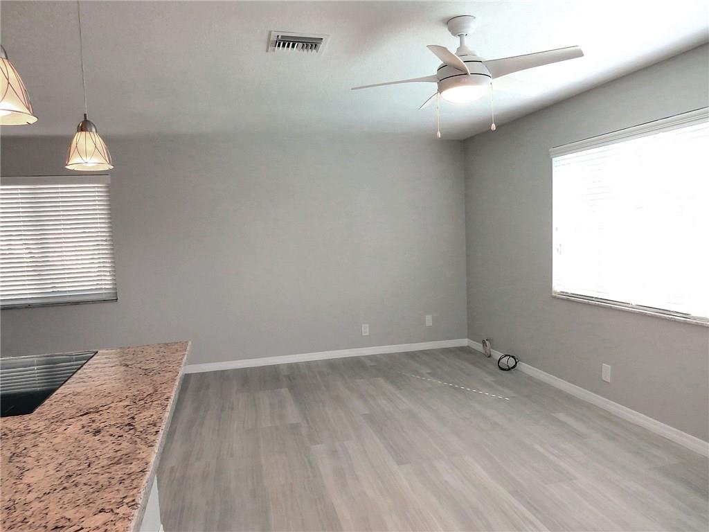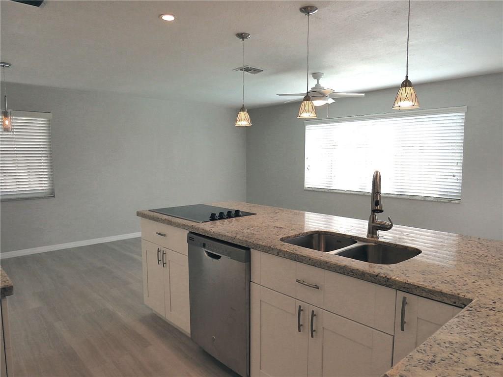 Only one neighbor, cul de sac and two canals. Freshly painted, knockdown on all walls, updated throughout, vaulted ceiling in living and dining room. All new flooring through out New white kitchen cabinets, granite counters, new stainless steel appliances. Eat in kitchen opens to large family room.Both bathrooms updated,new vanities, new toilets. new blinds and curtains. New roof.
