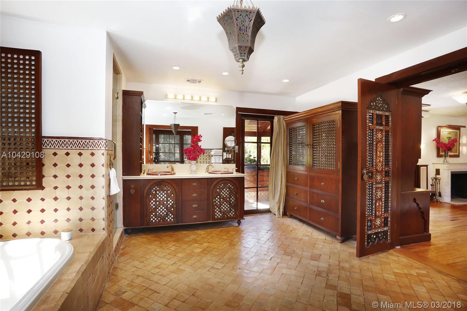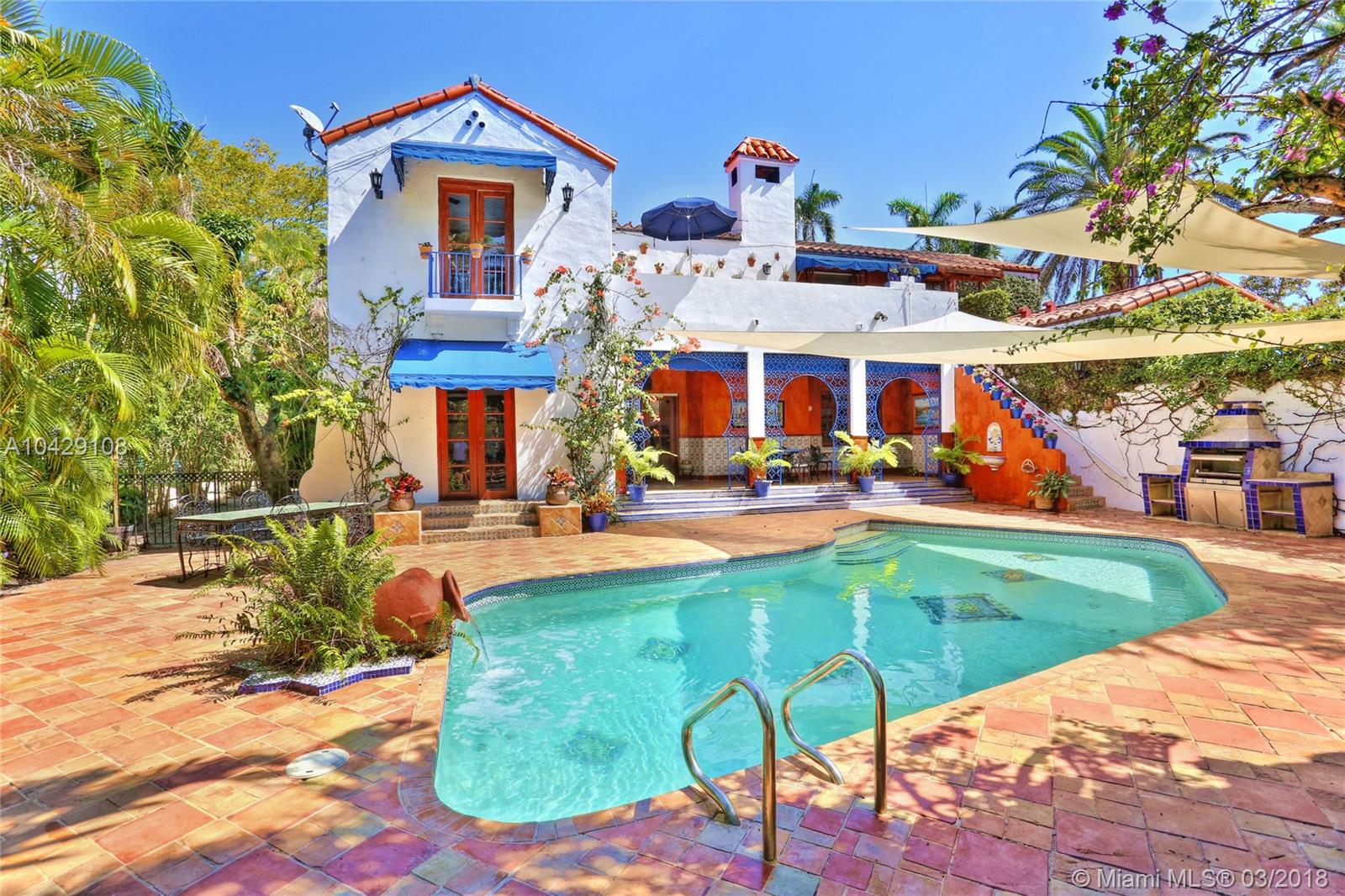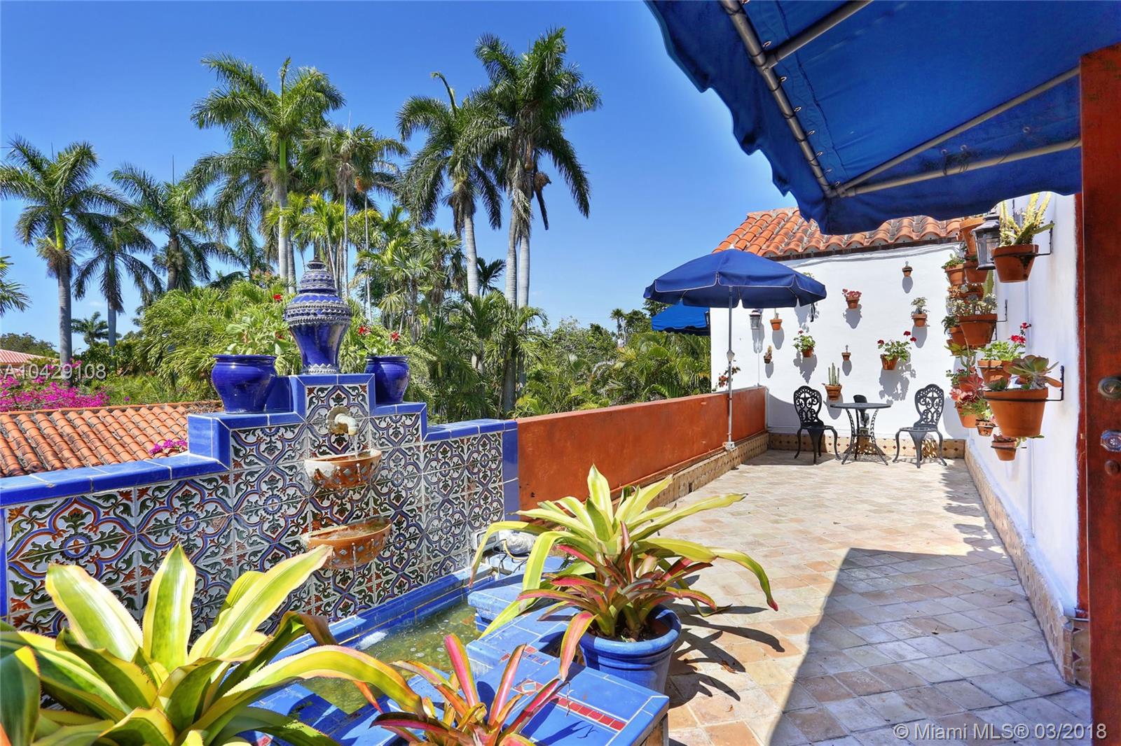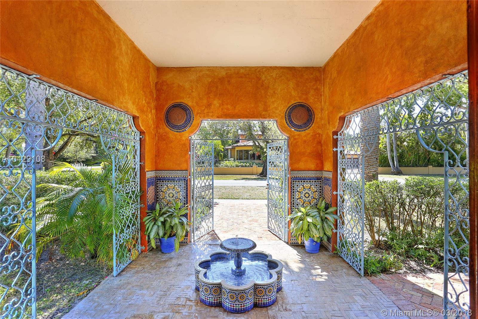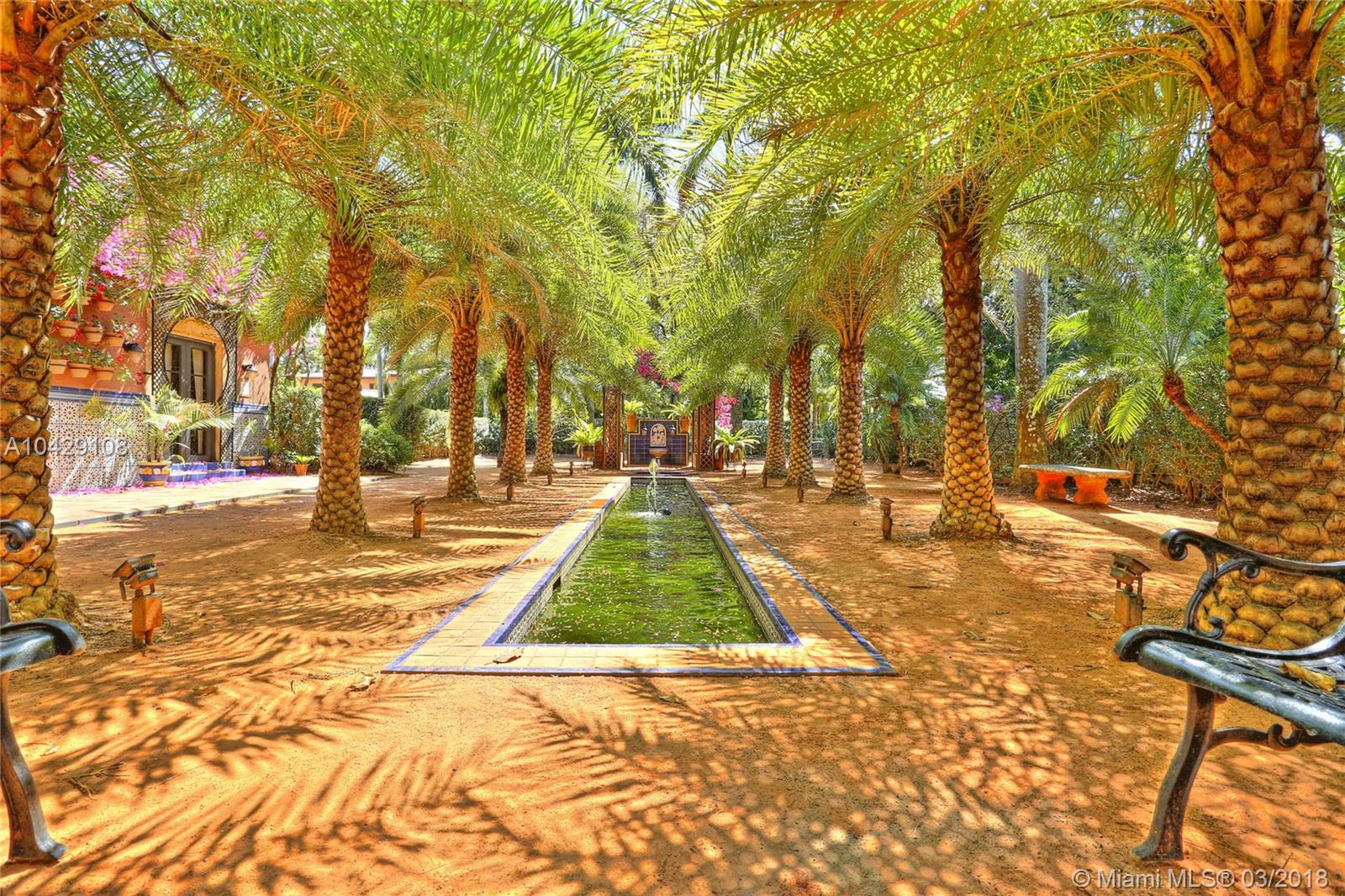 Timeless Mediterranean Villa with elegant Moroccan details on a corner half acre. Courtyard entry to the light filled sunroom with arched windows and fountain. Beautiful living room with high beamed ceilings, carved fireplace and adjoining dining room. Staircase with wood scrollwork leads you upstairs. Master suite with fireplace, wood floors, & private terrace with fountain overlooking the pool. Carriage house for guests nested among the award-winning Andalusian garden with pond, gazebo and fountain. Designed by acclaimed pioneering architect Martin Luther Hampton.