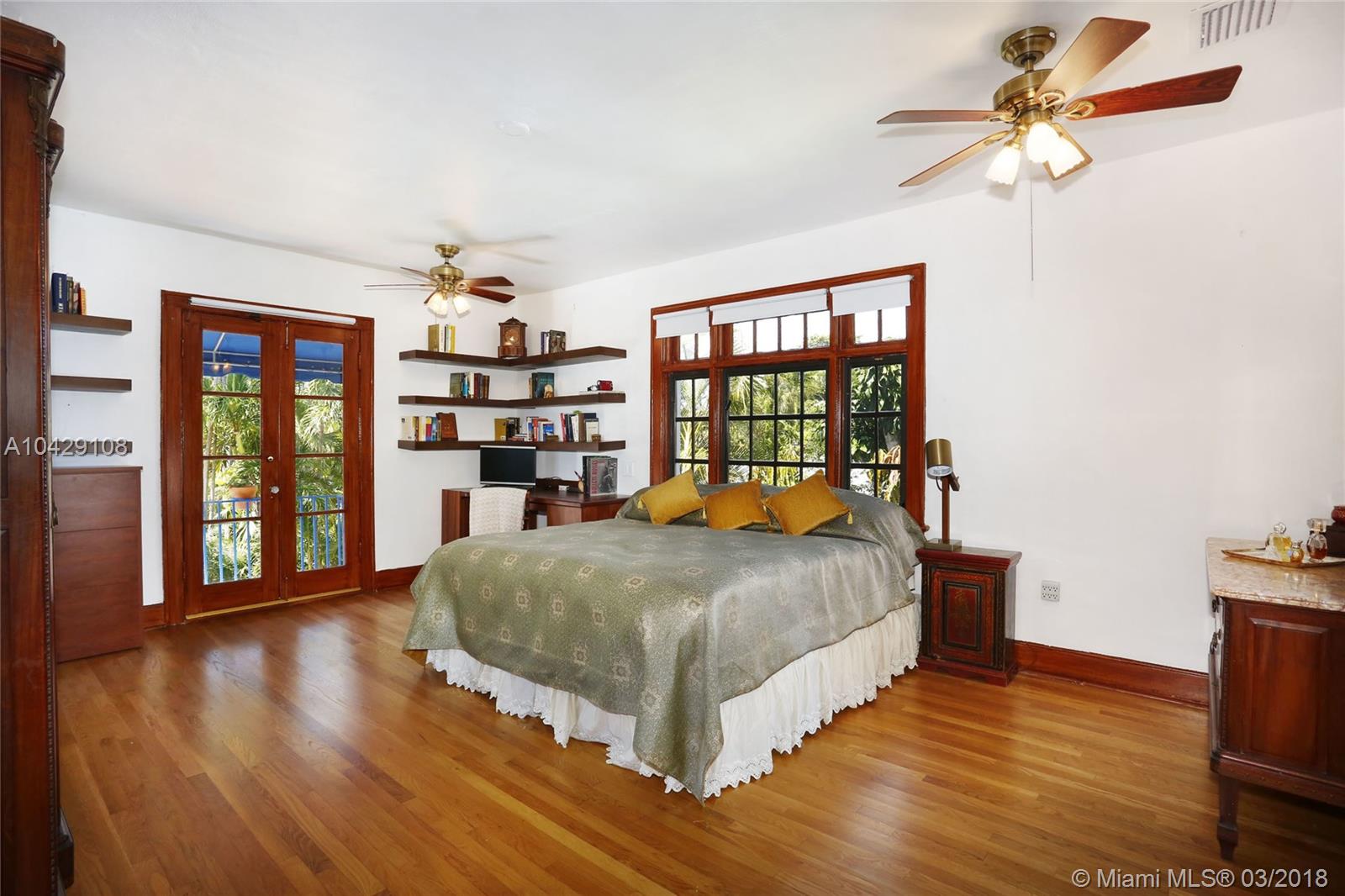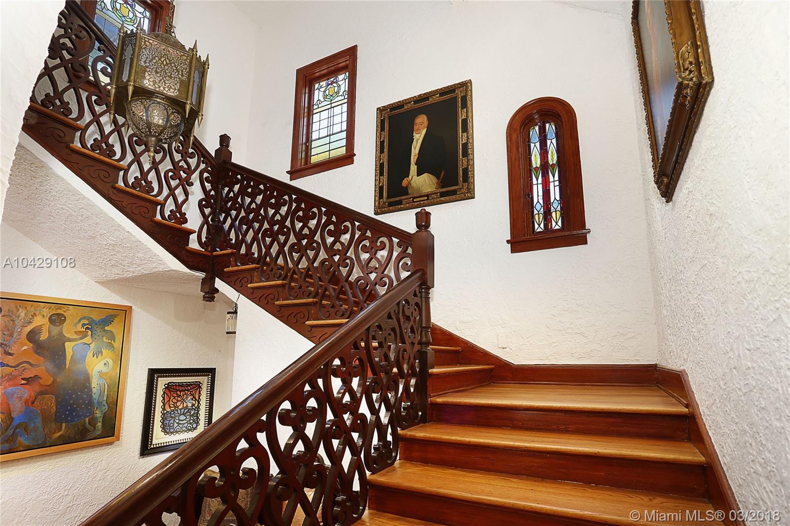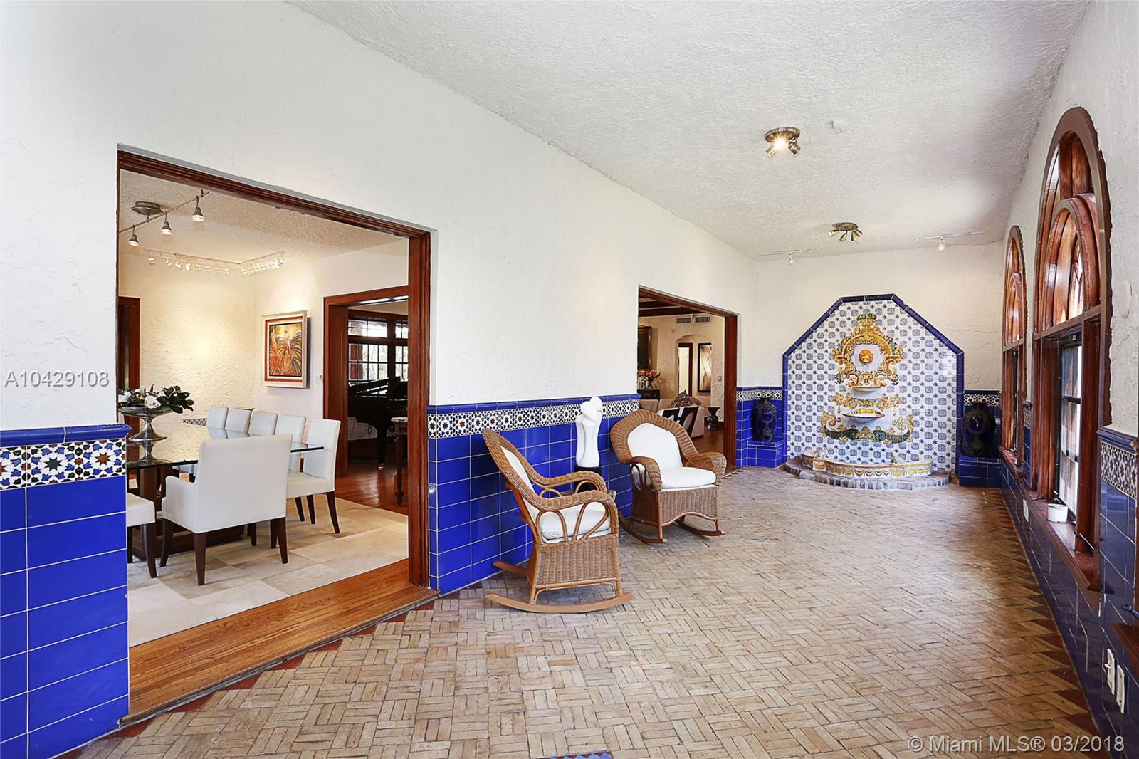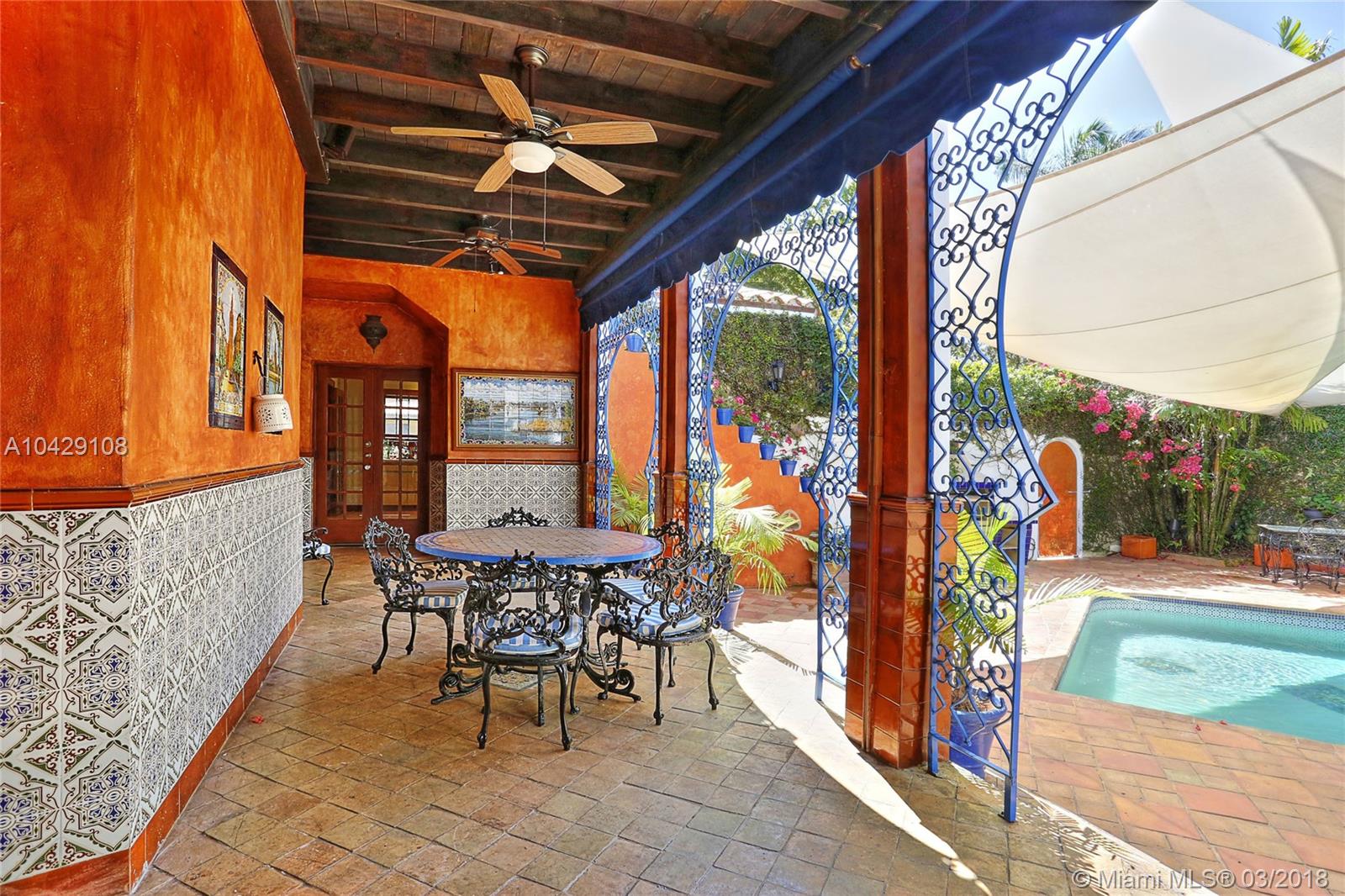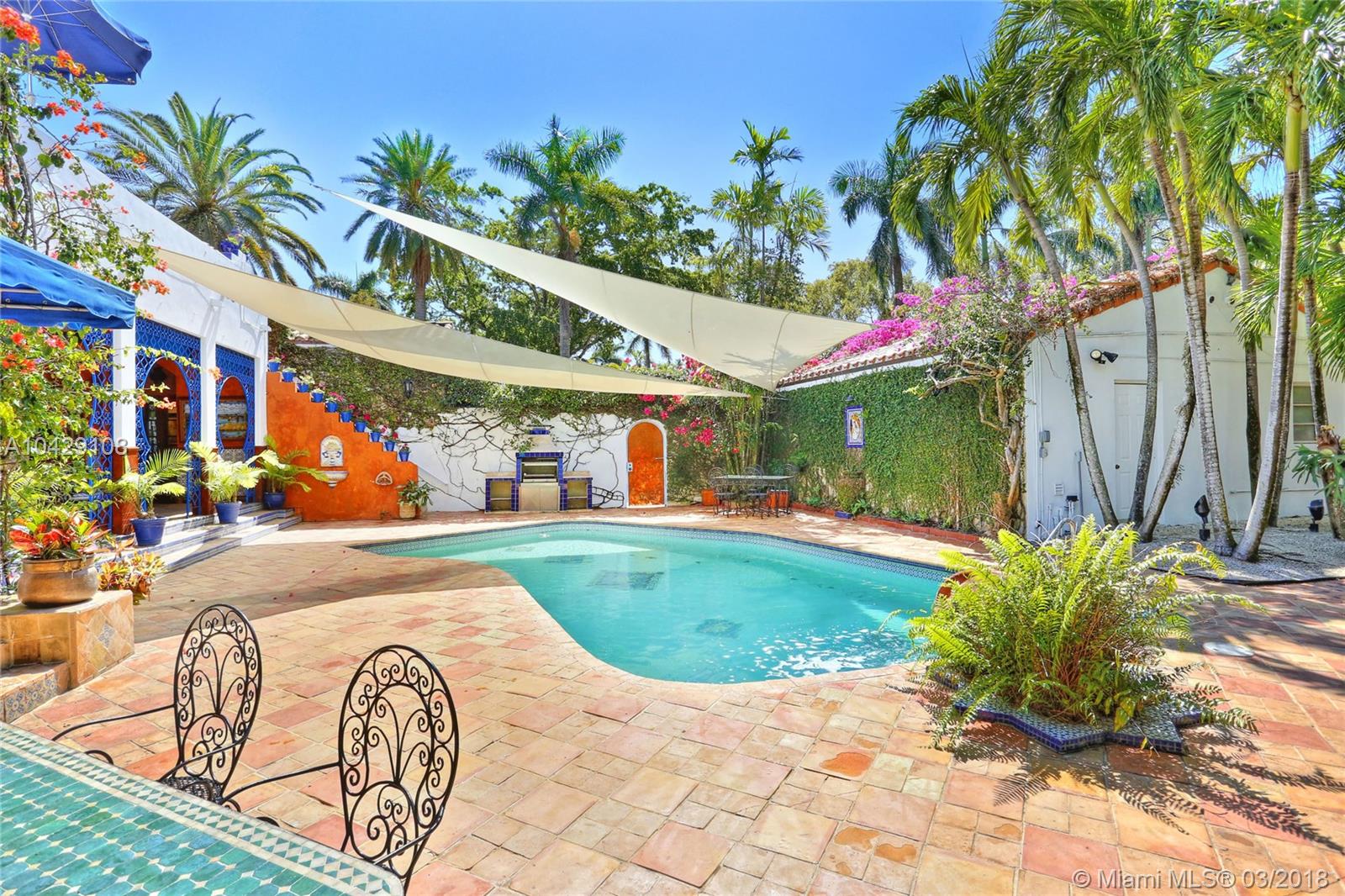 Timeless Mediterranean Villa with elegant Moroccan details on a corner half acre. Courtyard entry to the light filled sunroom with arched windows and fountain. Beautiful living room with high beamed ceilings, carved fireplace and adjoining dining room. Staircase with wood scrollwork leads you upstairs. Master suite with fireplace, wood floors, & private terrace with fountain overlooking the pool. Carriage house for guests nested among the award-winning Andalusian garden with pond, gazebo and fountain. Designed by acclaimed pioneering architect Martin Luther Hampton.