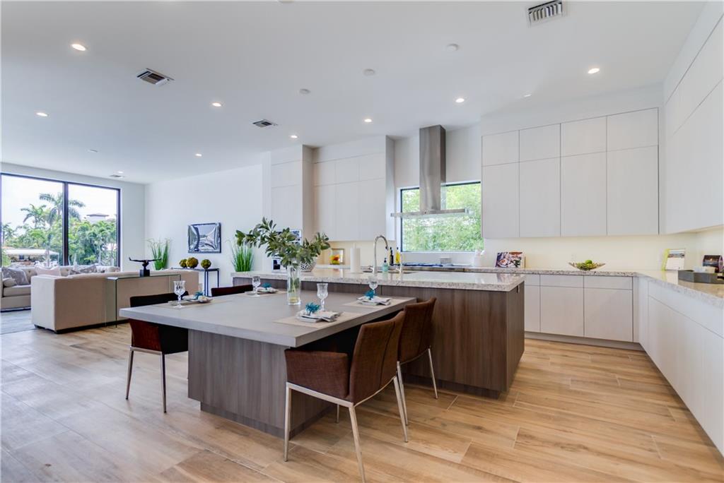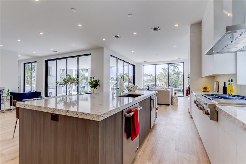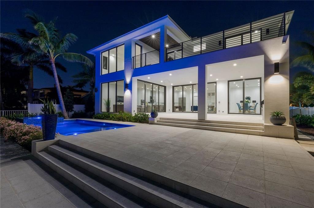 Just Completed! This Stunning Transitional Home located in the Rio Vista Isles is a must see! 5 Bedrooms 5 1/2 Bathrooms, Large open floor plan with premium finishes. Custom made cabinetry, vanities and fantastic large wood looking porcelain title throughout the home. Huge covered patio w/ outdoor kitchen, beautiful custom shell pavers in the backyard, pool has pebble finish and Infinity hot tub, 70Ft concrete dock, the house is wired for home automation, Elevator, 50 yr. Metal roof and Lush landscaping