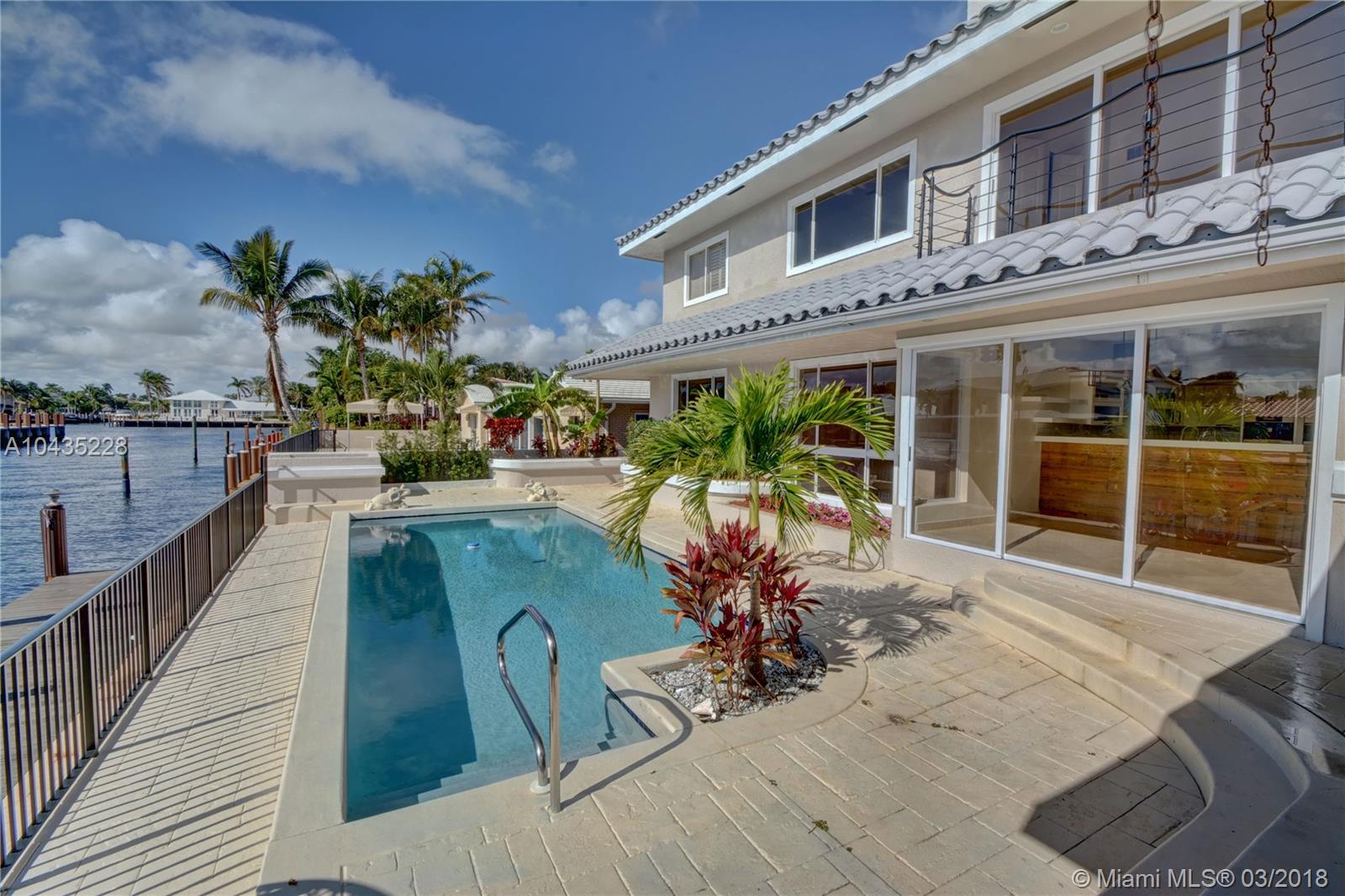 Exquisite 4bdrm/3.5bath + Loft Waterfront Pool home.Soaring ceilings w/ skylights and lots of natural light. Marble & Wood floors throughout.Luxurious designer finishes in the beautiful details of the custom doors, tray ceilings and crown mouldings.Gourmet kitchen w/SS Miele appliances, wine cooler, built in Espresso Machine and Subzero refrigerator. Master Bathroom Suite is marble galore with his and hers walk-in closets and Jacuzzi tub. Two (2) one-year-old 5 Ton A/C Units.Backyard entertaining oasis with a summer kitchen featuring a BBQ grill, beautiful pool with covered patio and much more. Majestic water views from the 2nd floor balcony, Dock and pool area. Voluntary HOA.Walking distance from Fort Lauderdale Beach! No Details spared–Must See!!!
