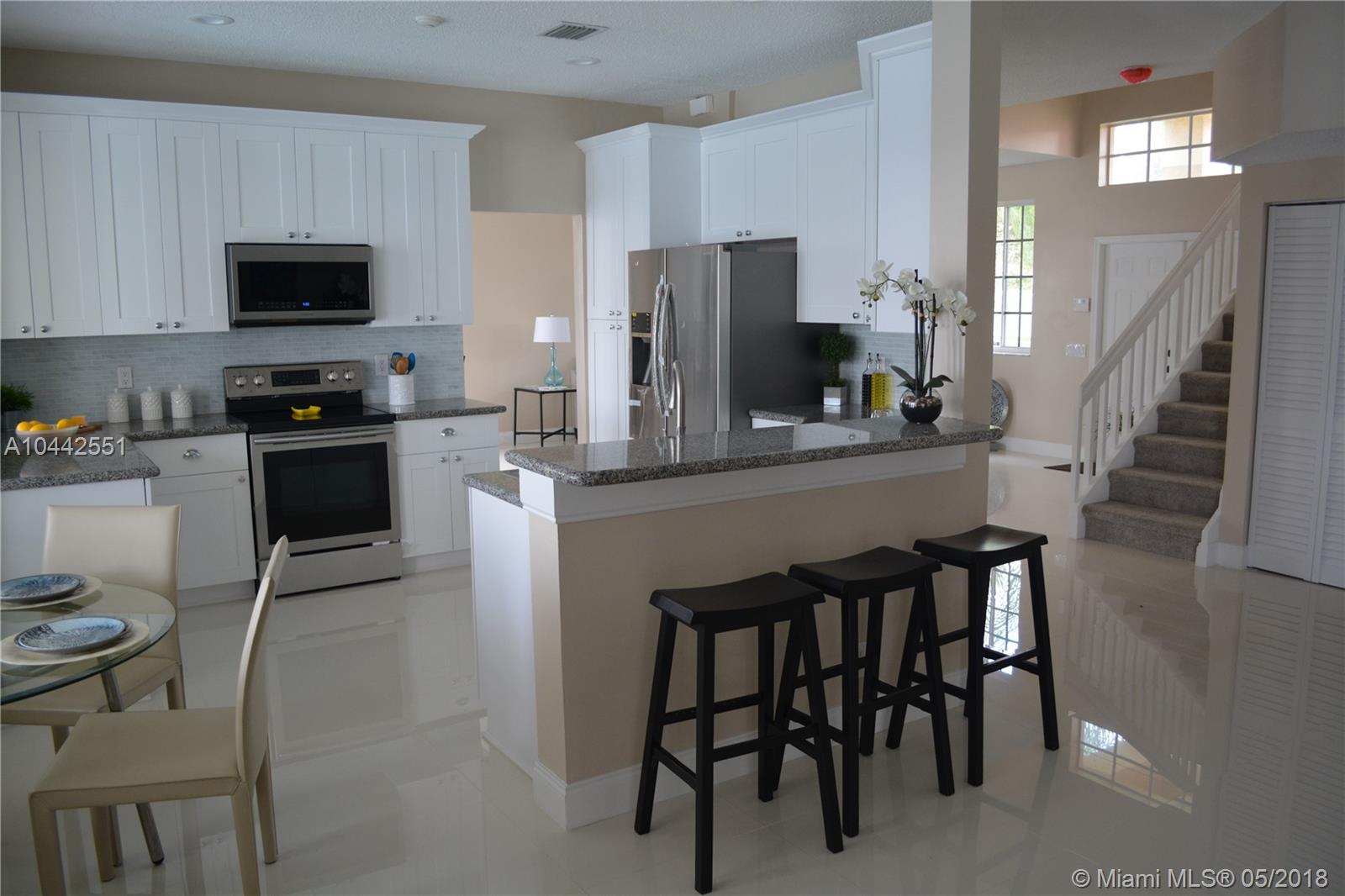 Spectacular and breathtaking lake front spacious 2 story 5/3 with a screened pool in Weston. One of the safest cities in the country. Completely renovated. New kitchen cabinets and bathroom cabinets with soft close doors. Granite countertops. New Samsumg Stainless steel appliances including washer/dryer. New porcelain tile (24x24) throughout the first floor and new carpet upstairs. Huge master bedroom. Open floor plan. LED lighting throughout the entire house. Low HOA and community facilities. Breakfast area with bay window to enjoy the view and lots of light. If top Notch schools and gated communities are a must, this house is for you. Must see!!!