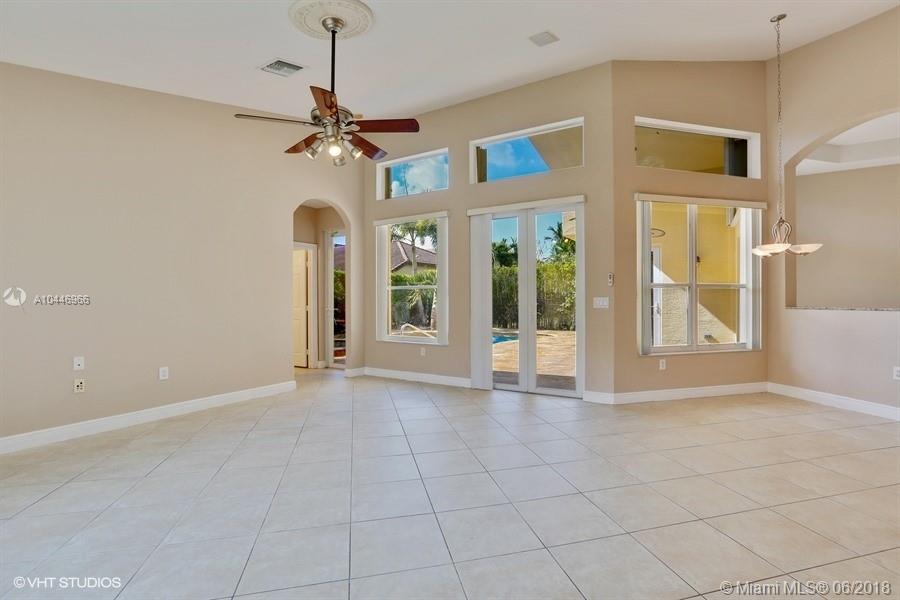 One-story four-bedroom plus large den or fifth bedroom, three-bath home in resort style community of Sunset Lakes is priced to sell. Soaring high ceilings throughout, the huge family room has adjacent breakfast area overlooking the pool as does formal living room. Separate dining room with French doors can be made into another office/playroom. Master suite is on one side of the home, three bedrooms one bath are on the other. Cabana bath near pool. Open kitchen has stainless steel appliances, double oven/convection, granite counter tops, wood cabinetry. Back yard has large covered outdoor living area with ceiling fans. Separate laundry room. Two-car garage. Impact doors. Hurricane shutters. Two a/c. Sunset Lakes community has amazing amenities, including pool, playground, tennis, gym, more.