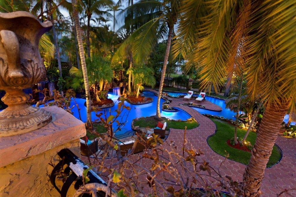 Landmark 0.6 acre (27,000+/- square foot lot) interior point home in private gated enclave of homes. Direct new river views and approx.. 300+/- foot water. Currently docks a 90+/- foot yacht with 18+/- foot beam. Resort style pool and grounds with grottos, caves, dive platforms, slides, and fishponds all canopied by towering oak & palm trees. Classic 1920's old world home with plaster walls, arched doors, wood and in-laid Cuban tile floors, barrel ceilings, impact glass French doors, and guest quarters. In-town location, yet totally private.