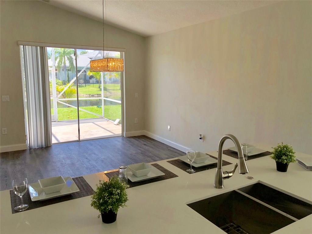 Lovely lakefront home. Completely remodeled with new modern style cabinets, stainless steel appliances, quartz countertops and marble backsplash. Waterproof laminate floors throughout. Spacious, open layout. Screened patio overlooking water. Magnificent sunset views. Both bathrooms completely redone! If you are looking to move into a ready, modern home, this is the one! Gated community of Lennox Isles offers fitness center, tennis courts, pool, playground, basketball courts, walking trail and more!