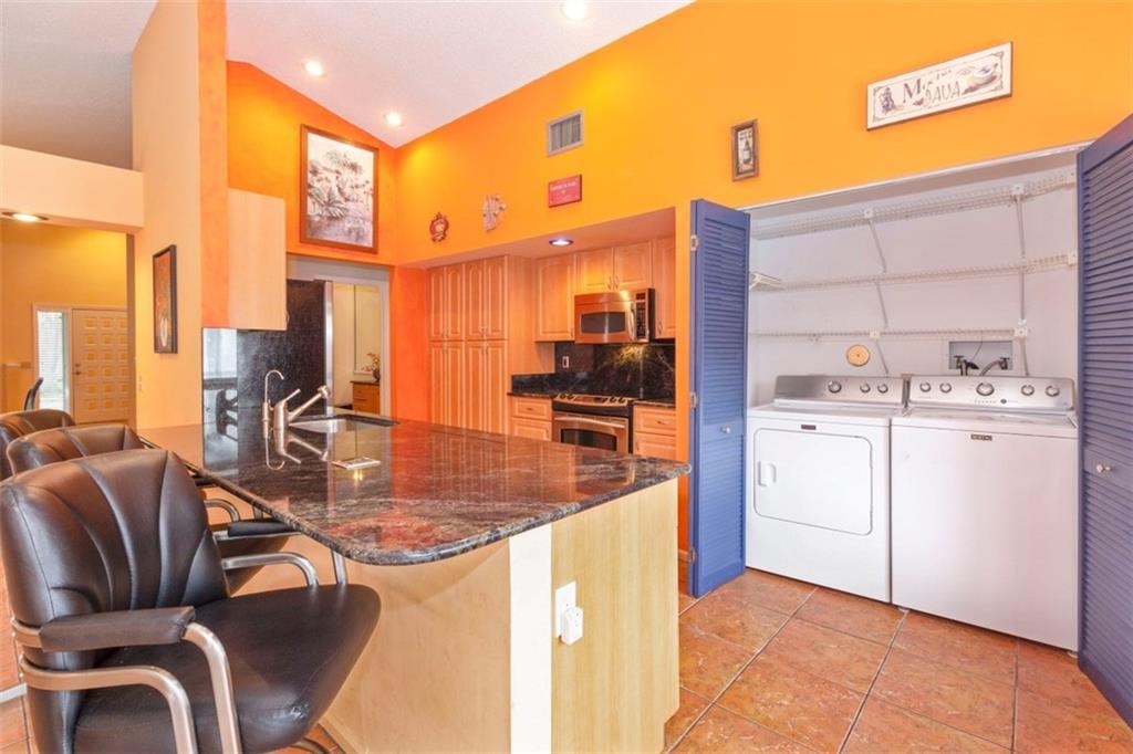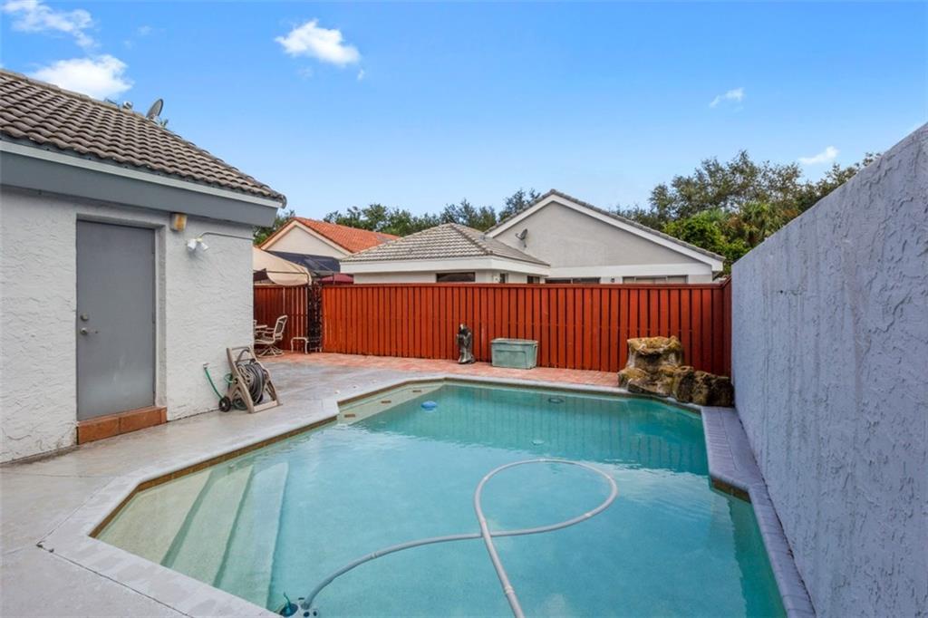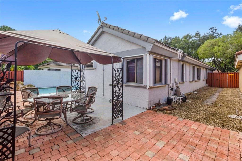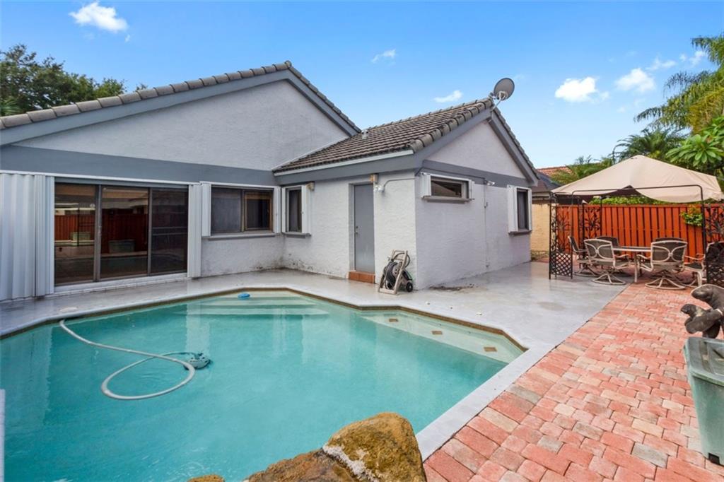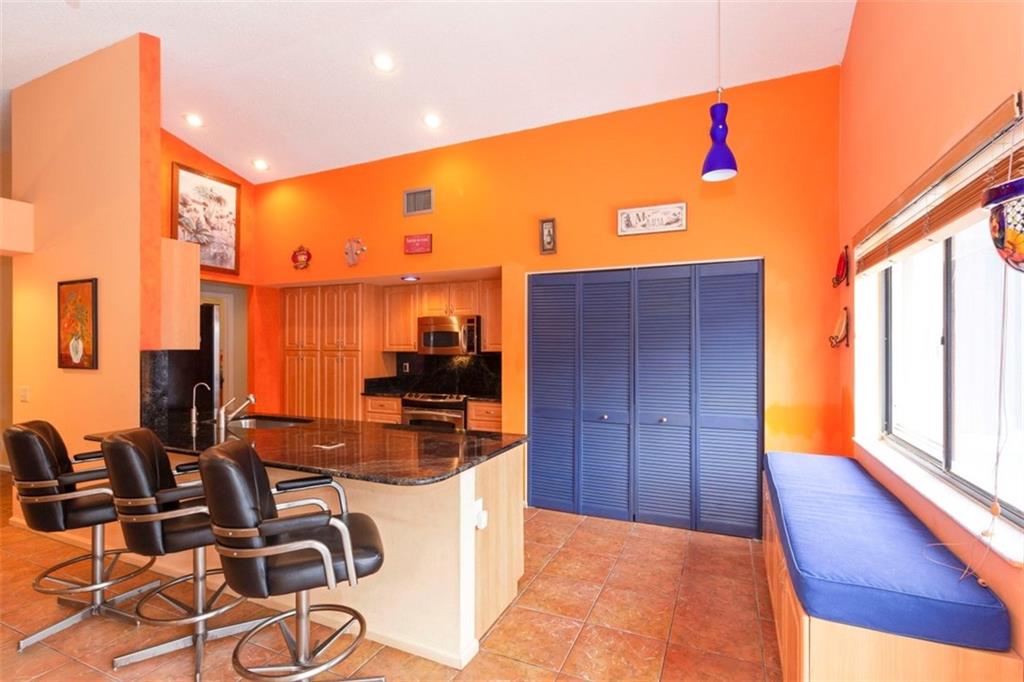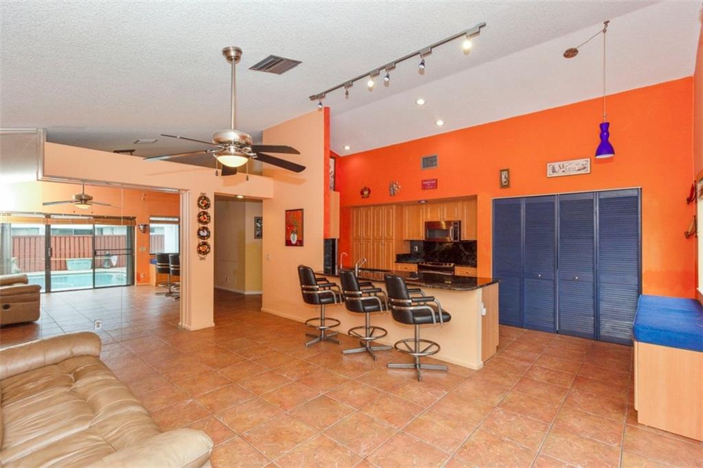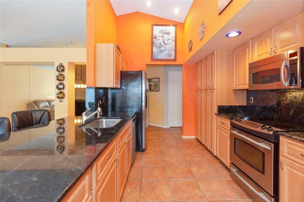 Open concept. Vaulted ceilings in living area. Largest one story model in desirable Cross Creek II. Roof - 2011, remodeled kitchen with granite counter tops & back splash, Stainless appliances, breakfast area, tile throughout except, Master & 3rd bedroom. Master suite: 2 walk in closets, Master bath: roman tub, dual sinks, separate stall shower. Both bathrooms updated. Inside laundry. Accordion Hurricane shutters, heated pool with solar panels & extended patio is perfect for entertaining! Original owner.