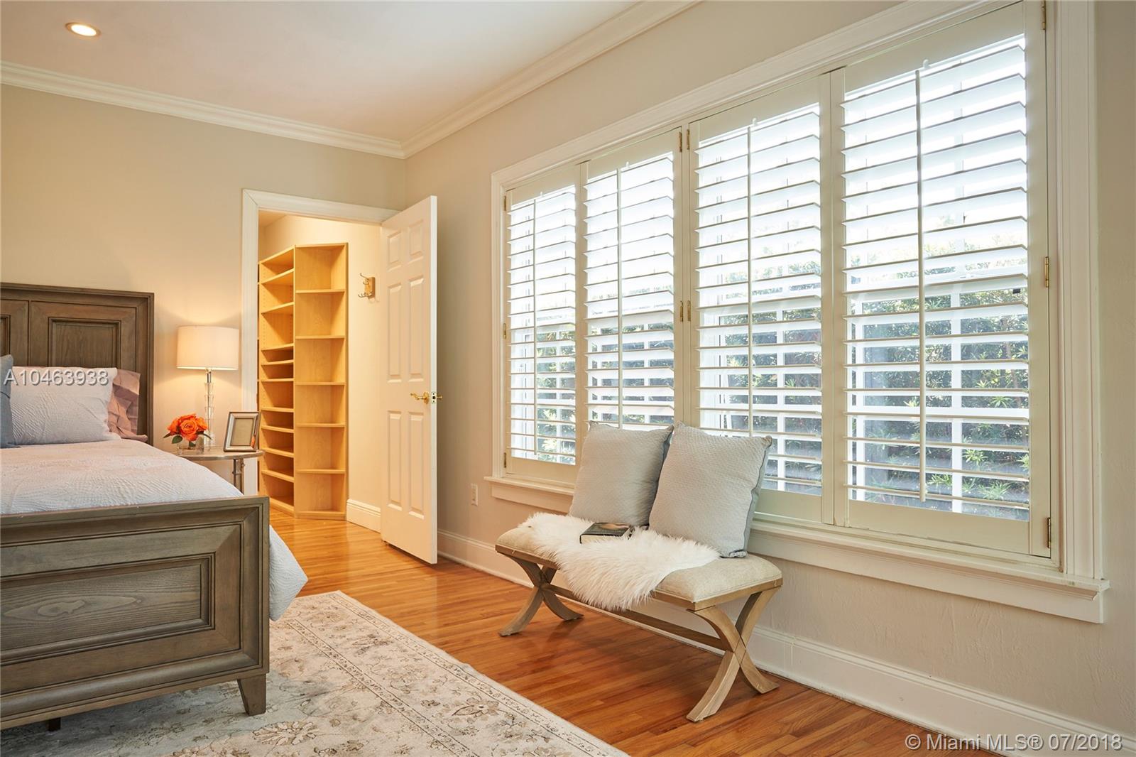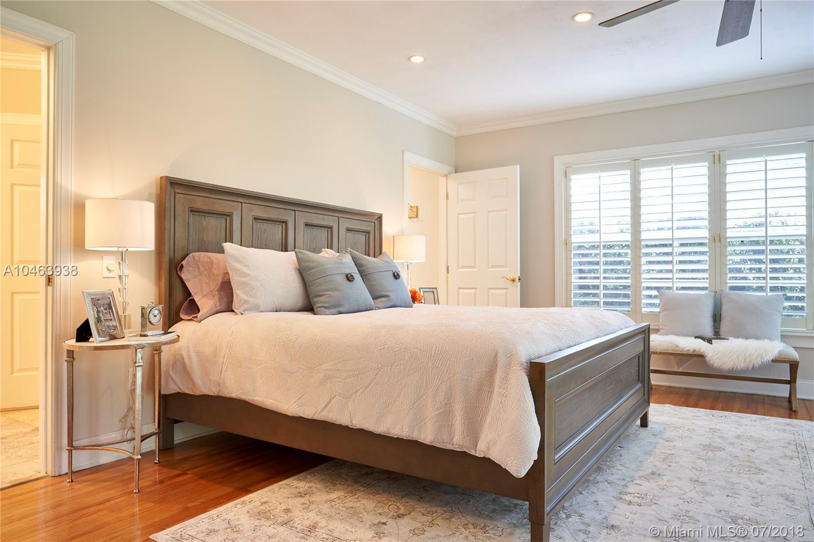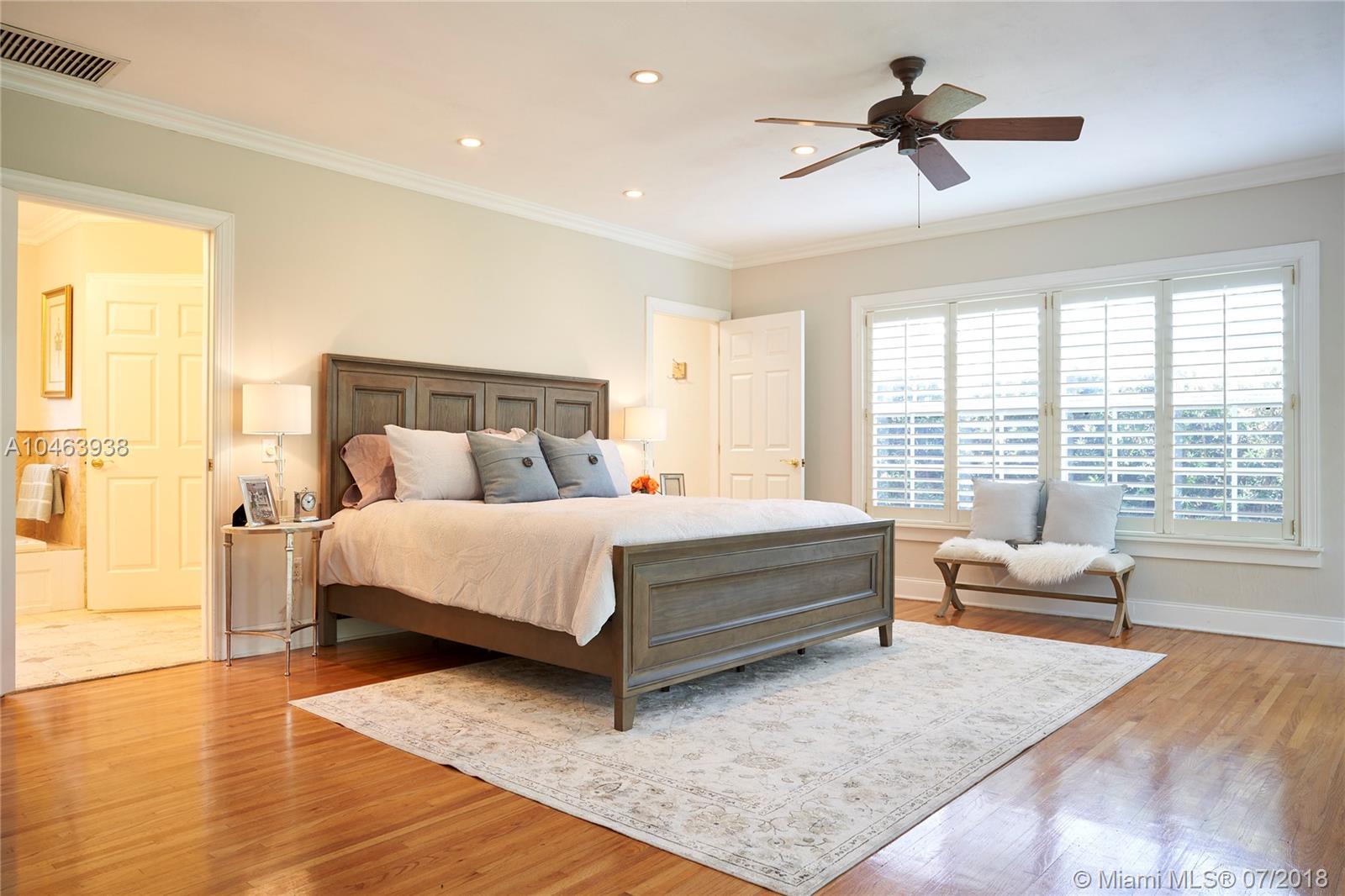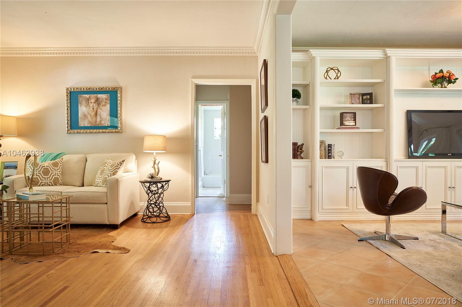 This utterly charming 3 bedroom, 3 bath 2,449 square foot home is one story and situated on the perfect S. Gables street. Enter to an open floorplan w/formal living room & family and dining rooms beyond. Hardwood floors, crown moldings, built ins, partial impact glass and a new roof are just a few of the special features. The kitchen has new quartz countertops, wood cabinets, stainless appliances, and pantry. A gracious master suite was added and features a lovely bathroom with private toilet and large walk in closet. The spacious bedrooms are well distributed and each have their own bath. Lovely, private patio and yard. 1 car garage and indoor laundry room.