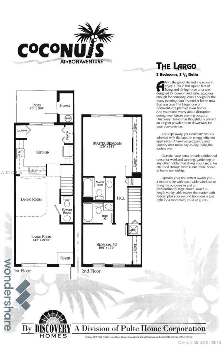 UPGRADED 2 BEDROOM 2 BATH AND A HALF "LARGO" MODEL, TOWNHOUSE IN COCONUTS, BONAVENTURE. THIS UNIT HAS MODERN TILES THROUGHOUT THE FIRST FLOOR, NEW CARPET UPSTAIRS, GRANITE KITCHEN COUNTERTOPS AND STAINLESS STEEL APPLIANCES. PRICED JUST RIGHT, THIS UNIT WON'T LAST. ASSOCIATION COVERS LAWN AND BASIC CABLE.
