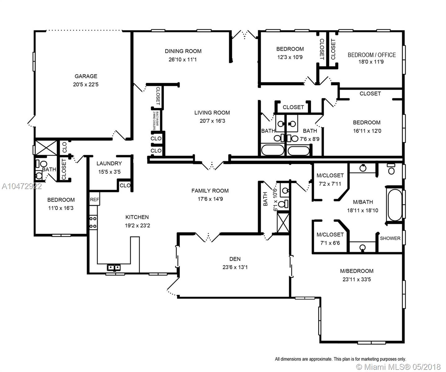 Palm Beach/Bermuda Classic Elegance! located in Central Gables close proximity to Biltmore, Youth Center , Venetian Pool & Schools! This beautiful 5 bedroom/5 Baths turn key updated home boasts all the most discerning buyer is looking for! From the moment you enter the double plantation French doors it welcomes you to spacious open social areas with views of open pool and lush private back yard! Featuring: Island wood/granite gourmet kitchen perfect for entertaining! Separate Master Suite and luxe master bath plus split bedroom wing/ large indoor laundry/ 2 car garage/ 2017 tile roof and much more!