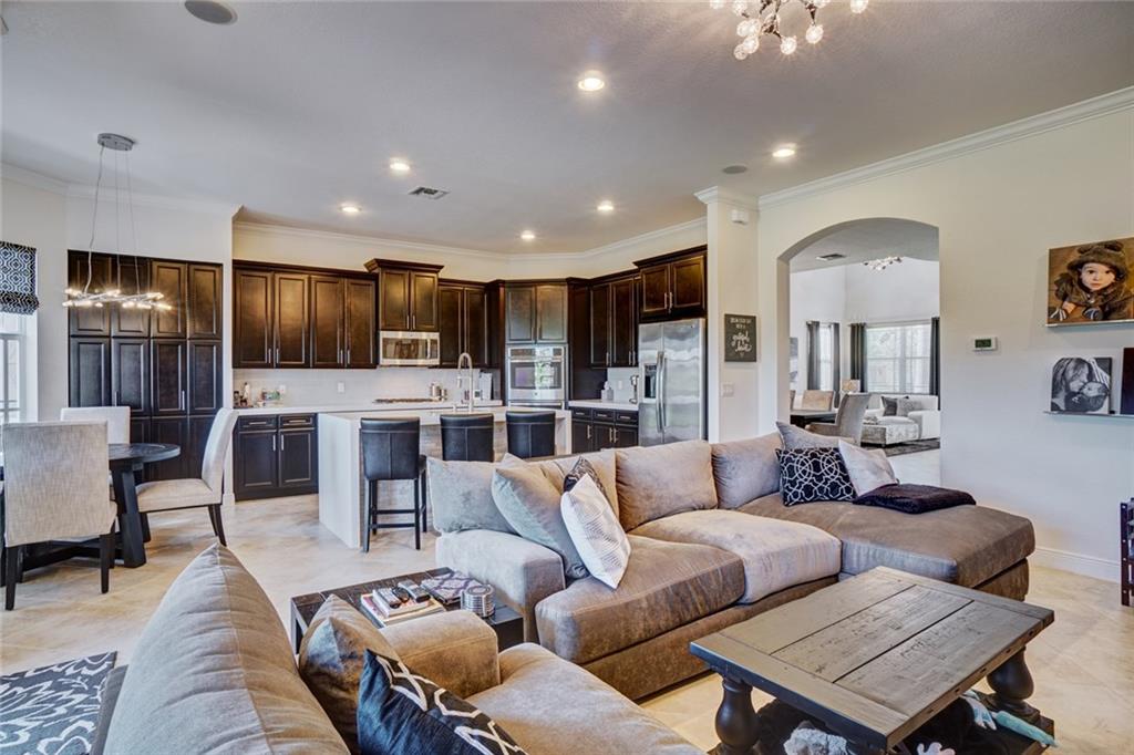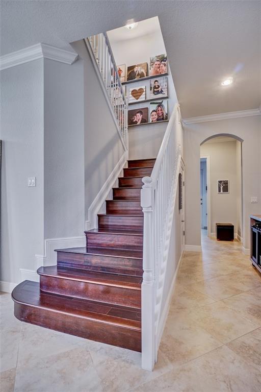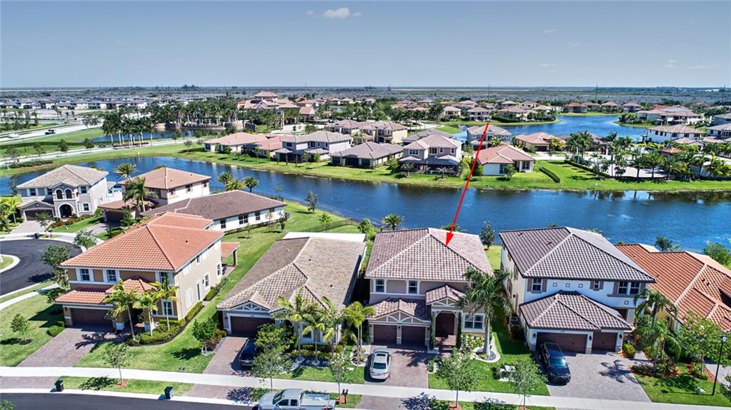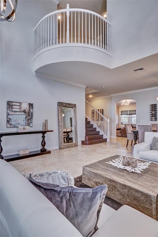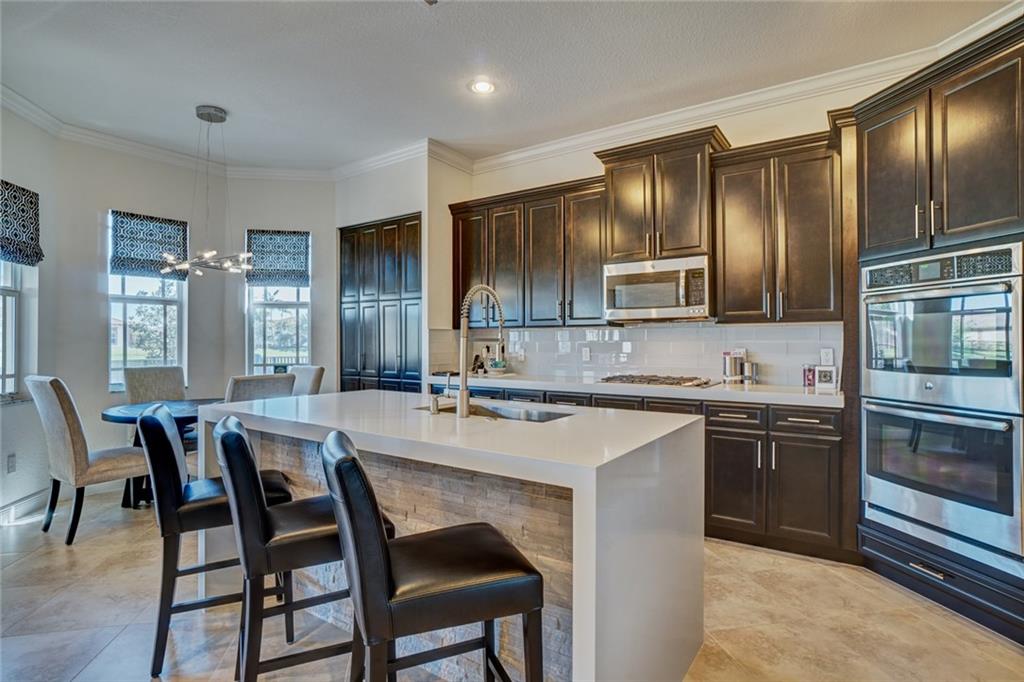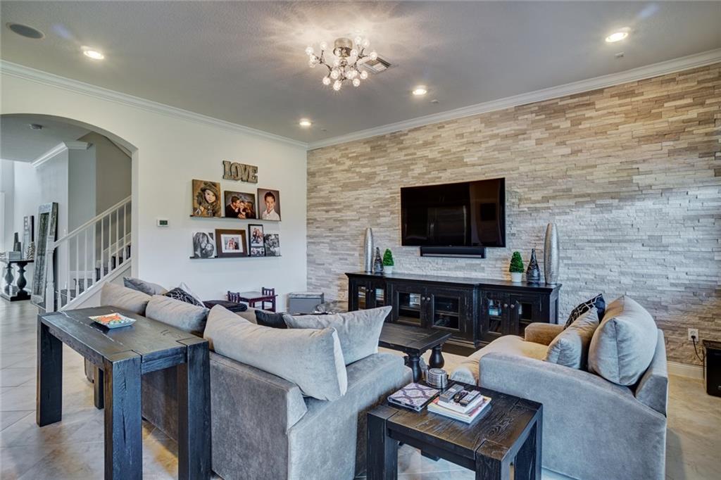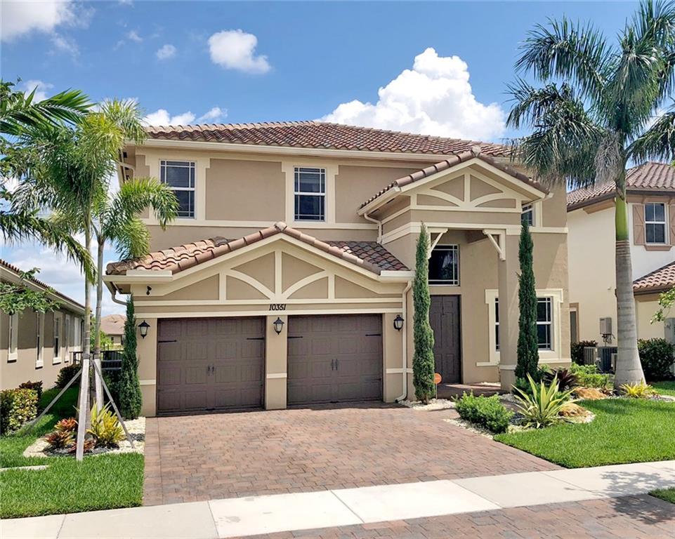 Simply Stunning upgraded home in MiraLago. Gorgeous 20" diagonal porcelain tile, designer colors, crown moldings, quartz kitchen countertop, custom kitchen fixtures & pantry doors, under-stairs closet, extended patio with extra gas hookups for fire pit & grill, gutters, beautiful landscaping, 2nd floor all hardwood, living room stone wall + wired for surround sound & outdoor speakers. This home shows better than a model. Amazing community with resort-style amenities. A+ schools.