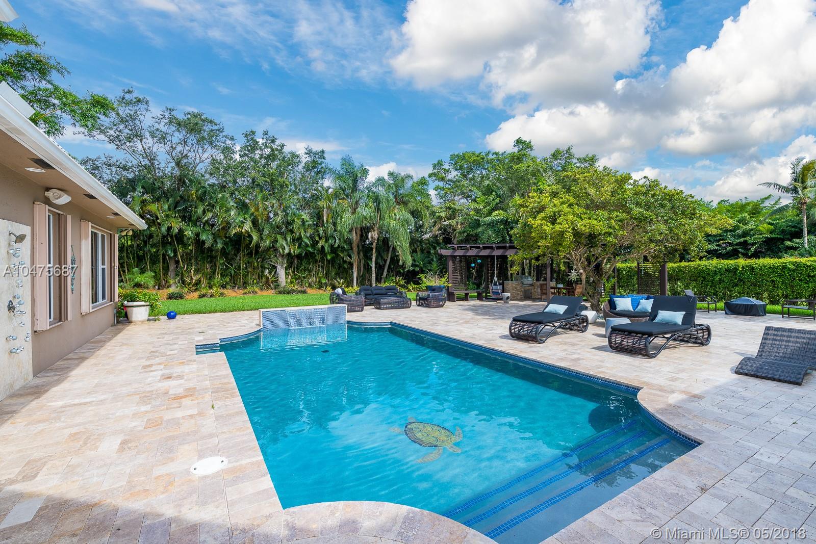 Sprawling 1-story triple split over a builder’s acre within exclusive guarded comm completely remodeled (2014-15) front-to-back. Appointments of sleek marble counter tops, Brazilian hardwood floors, Bosch/KitchenAid stainless steal appliances, living room bar, theatre room, grand floor-to-ceiling windows showcase outdoors boasting poolside, travertine stone, summer kitchen. The addition towards the back of the home extended the Derby model by a third wing, (1000 SF 2 bedrooms | 1 bathroom). Outstanding poolside/summer kitchen encased in sculptured light brick finish, amidst extensive travertine stone flooring. Located off Nob Hill close to A+ schools, quick commutes shoppes and malls, ball fields, and 20 minutes to Fort Lauderdale Airport, and beaches.