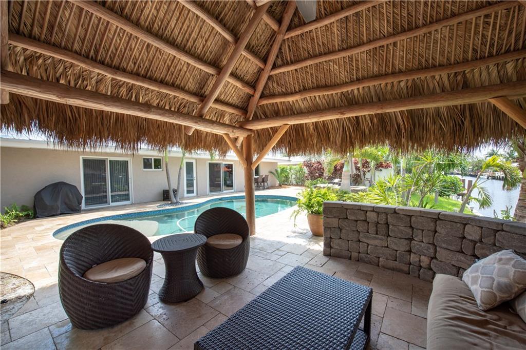 17' BOSTON WHALER INCLUDED w/full price offer! Ocean access waterfront. Open concept w/sliders blending indoor & outdoor. Stone flooring throughout. Chef's kitchen w/Wolf range, Subzero & breakfast bars. New baths. Recessed lighting & custom Hunter Douglas blinds. Private fenced Pebble Tech heated pool w/LED lighting & south exposure, ample travertine deck & large Seminole Tiki. New Dock & 10,000lb lift. Trane HVAC. Paver circular drive, metal roof & impact glass. Close to best beaches, nightlife & shops!