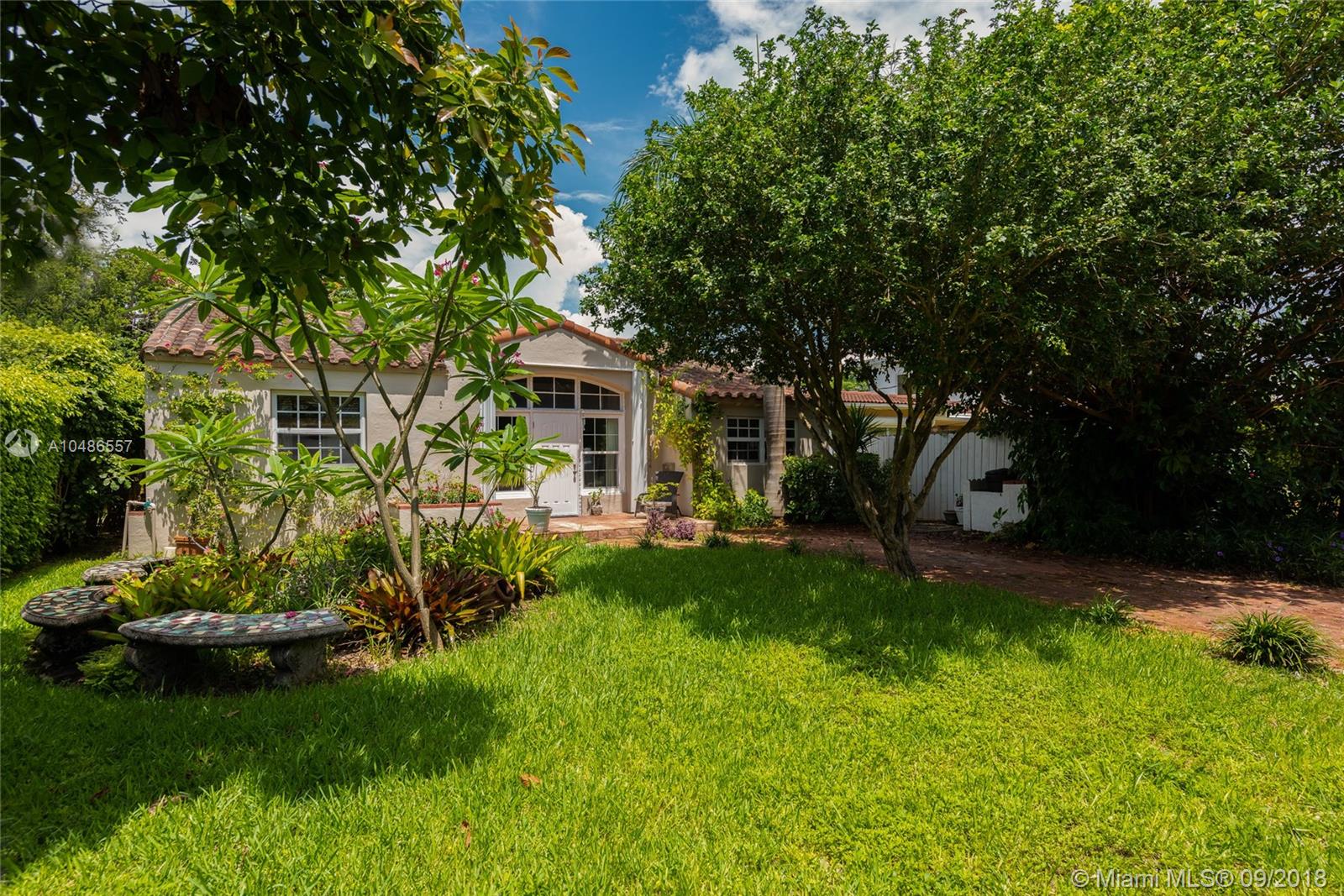 One of Carlos Schoeppl's masterpieces, this charming 4 bedroom 3 bath Mid Beach pool home offers spectacular architectural details with a modern flair. Featuring original hardwood floors, fireplace, plus cathedral and volume ceilings throughout. Updated kitchen flows effortlessly into the formal dining space overlooking pool and garden. Large master suite featuring a large walk in closet and easy breezy access to the outdoors. Open, bright, and spacious with natural light flooding the entire household. Private pool and patio surrounded by lush tropical landscaping make this house the perfect home.
