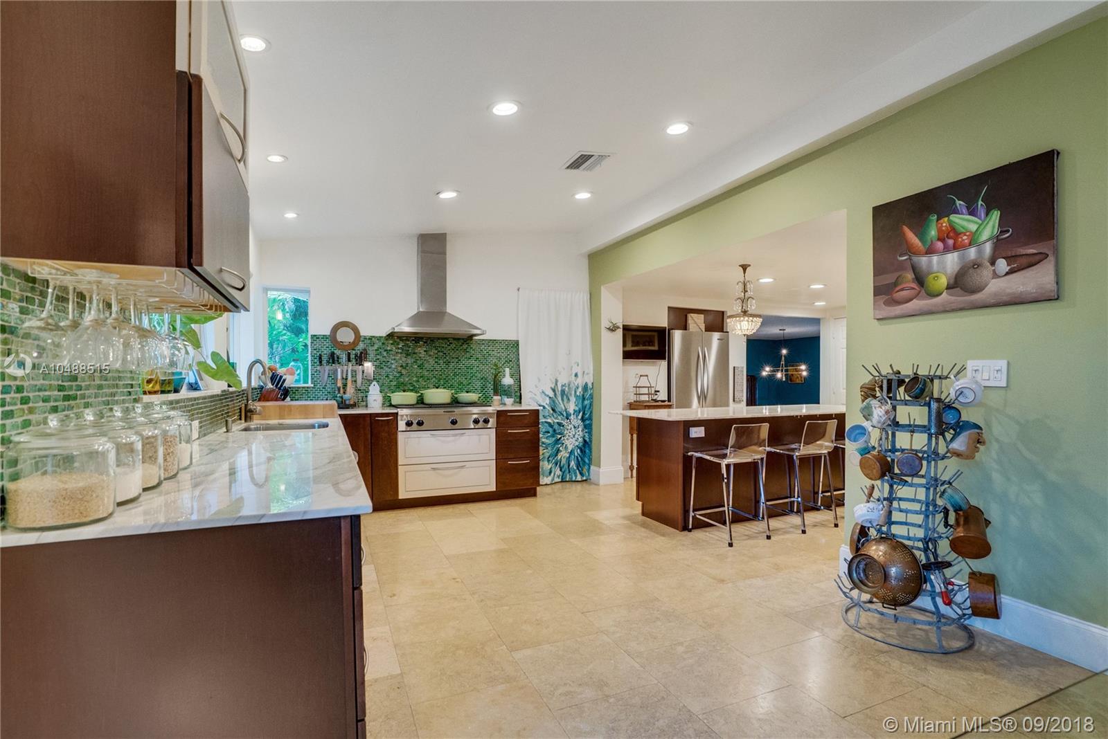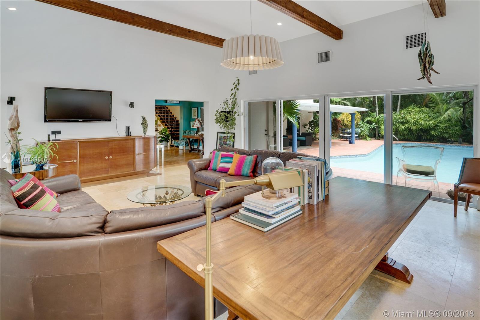A Tropical Grove-style Oasis awaits you! This one-of-a-kind Pinecrest home is situated on a private corner lot & has been tastefully renovated w/ an artist’s touch. Spectacular Living Room w/ vaulted ceilings overlooks lush pool area. Enjoy cooking in Gourmet Chef’s kitchen w/ gas range. Large Island w/ Calacatta Gold Marble countertops. Open concept w/ high ceilings. Walk out of your master on to pool terrace. 3 spacious bedrooms + den/library upstairs. Limestone & Dade Pine wood floors throughout. Large covered patio. 2-car garage. Impact windows/doors. Mature mango trees & exotic variety of tropical foliage. A Slice of Paradise in Pinecrest!