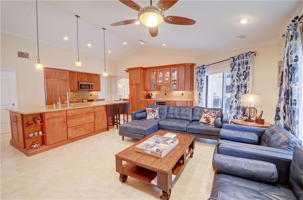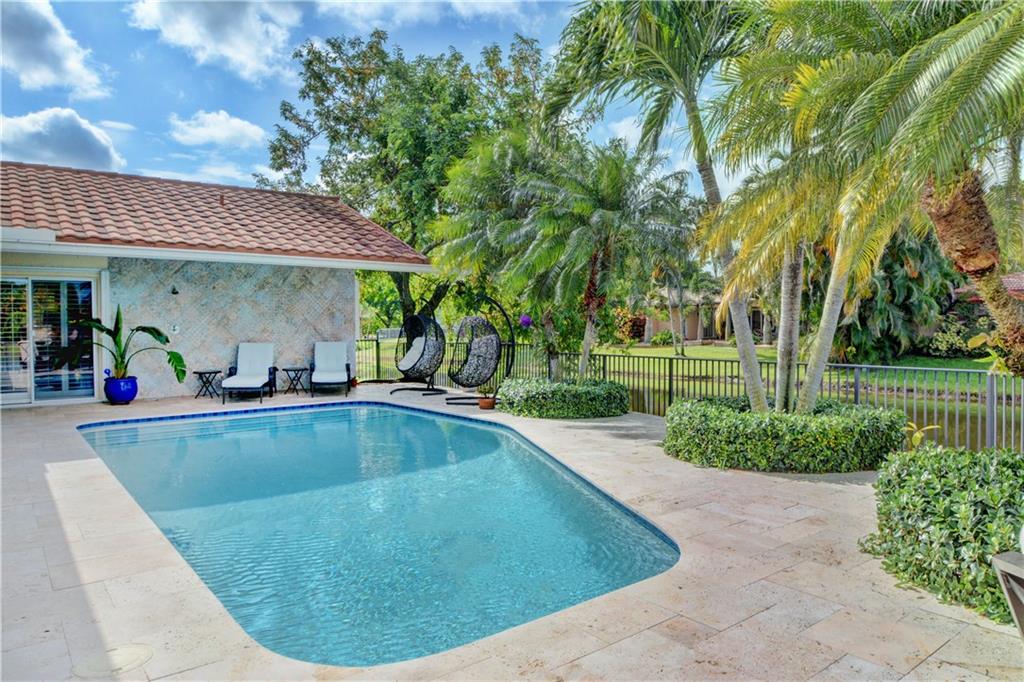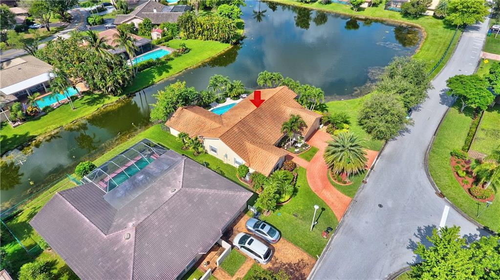 South Florida living at it's finest. Breathtaking 180' degree point lot with lake views from master & all living areas. Totally upgraded executive home with vaulted ceilings, crown moldings, neutral 16" porcelain tiles. Designer Bathrooms, Gorgeous custom wood and granite kitchen with massive island, Sub Zero fridge, Built-in office in 4th bedroom. Pool area is an entertaining dream. Marble patio tile, Updated heated pool, fully fenced yard, outdoor TV for watching movies in the pool! Hi-end Stone on Steel Roof with warranty, Accordion shutters, Hurricane front doors, Circular drive and more.