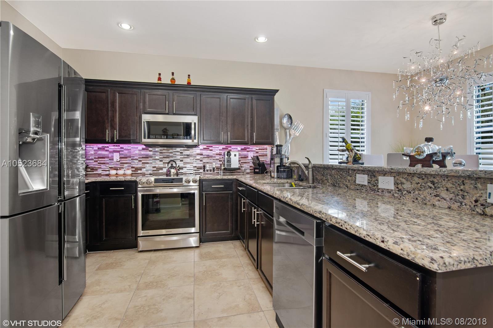 An absolutely charming home in the Bellagio subdivision of the walled and gated Aragon complex. This three bedroom home features beautifully upgraded Samsung appliances and gorgeous granite countertops in the fully upgraded kitchen, spectacular crystal light fixtures, lovely window treatments, three bedrooms, two and a half baths, living room, family and dining room and a lovely open floor plan. All three bedrooms are upstairs and the front loading extra large washer and dryer are conveniently located upstairs as well. This home is a gem located in a fabulous community with every amenity including, lakefront club house and community pool. Just reduced! Make an offer!