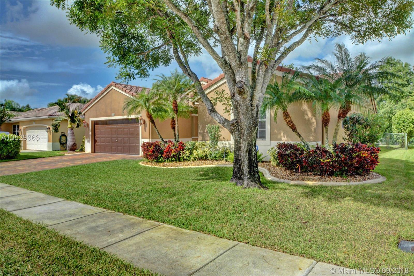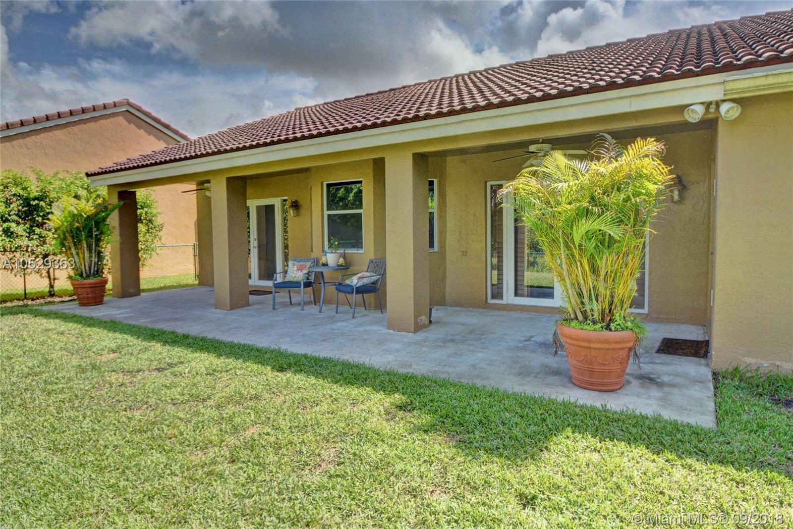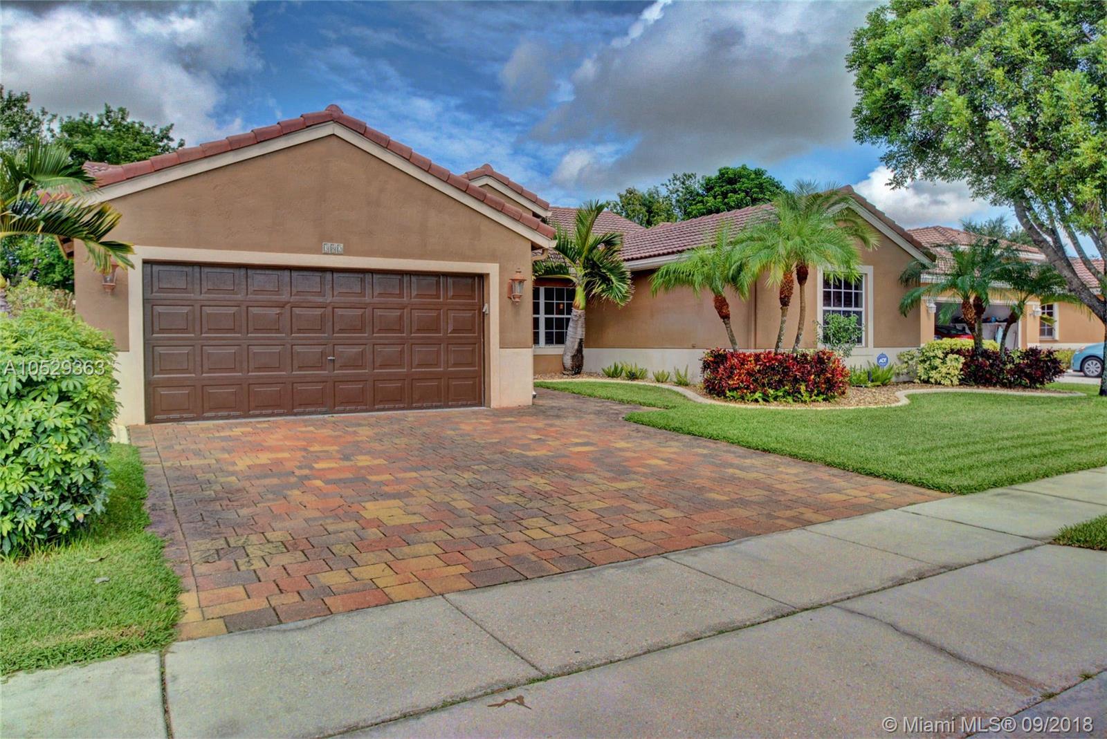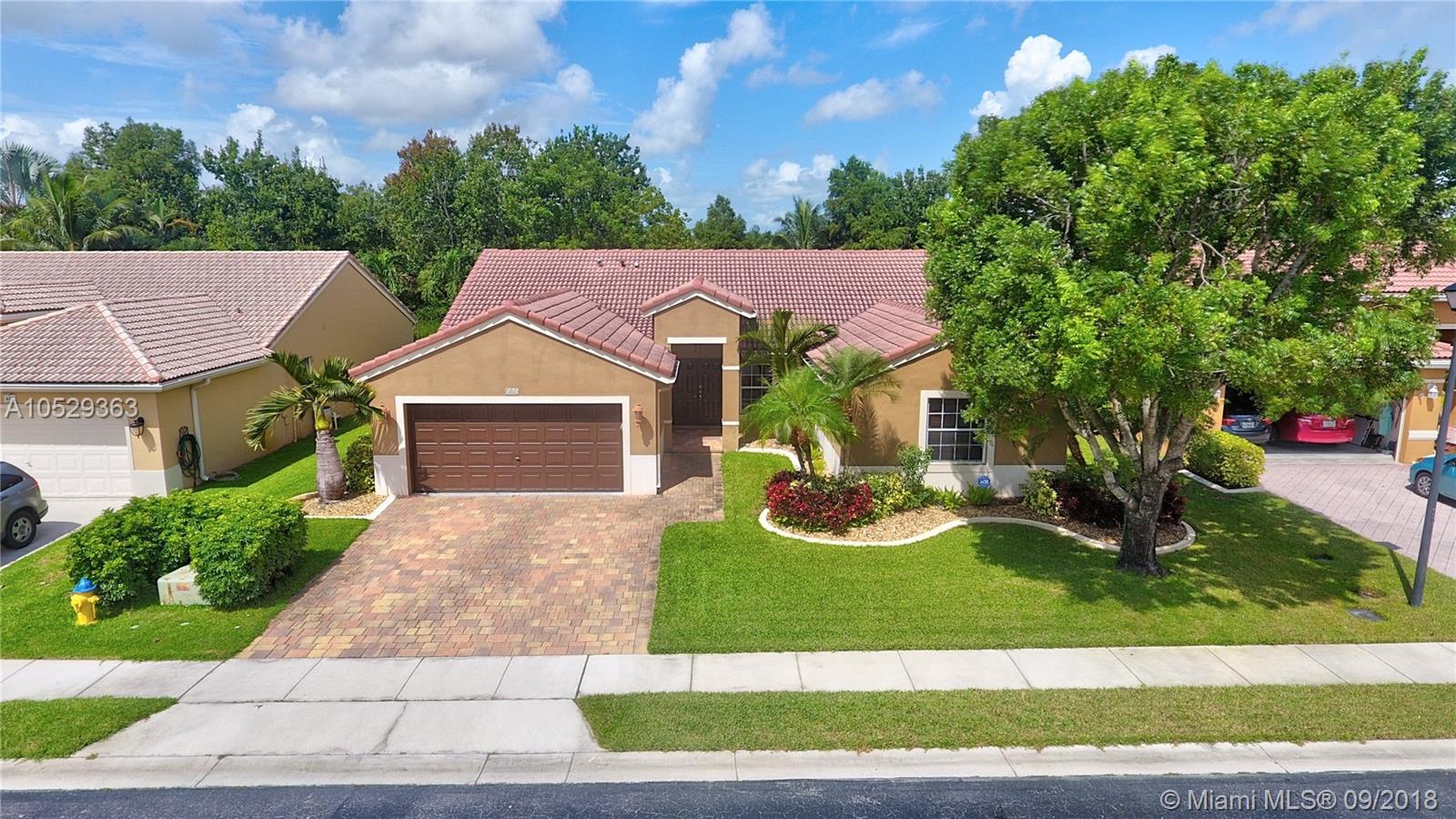 Rarely available house in Alhambra community in west Pembroke Pines. House is a one story on a large lot with no back neighbor. House has a covered back yard patio great for entertainment or just relaxing. House is very spacious and open with high ceilings. Home features a upgraded kitchen with custom wood cabinets and granite counter tops and stainless steel appliances. Both bathrooms have been upgraded. Master bathroom has double sinks with tub and shower with frameless glass and marble floors. Large master bedroom with high ceilings and large walk in closet. This house is a must see before its gone.