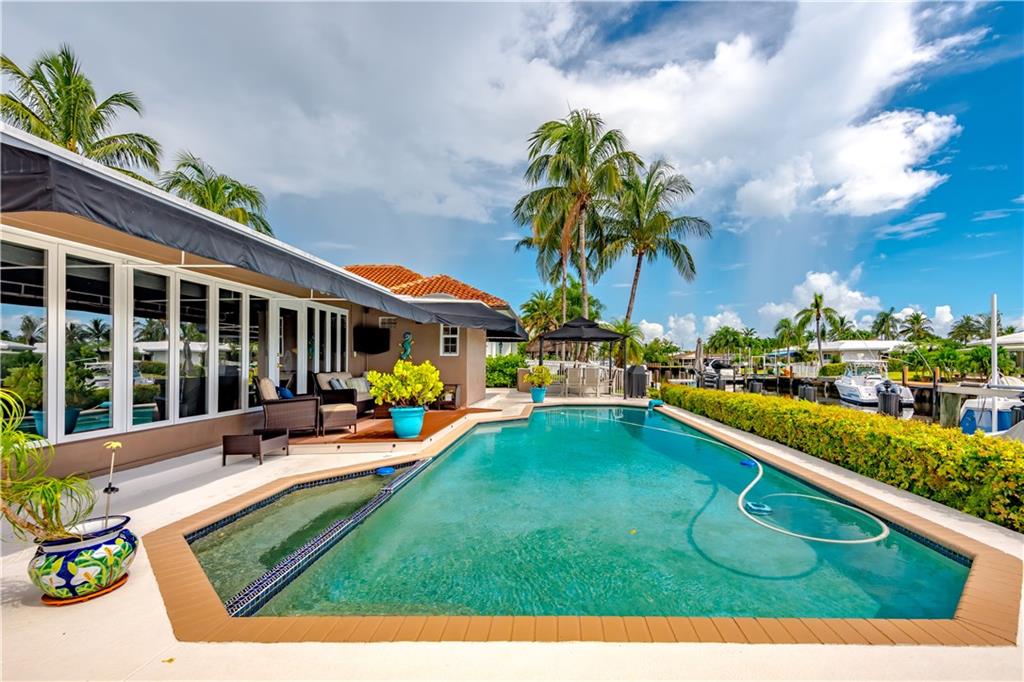 Enter this beautiful waterfront home to a wall of windows overlooking the oversized pool and jacuzzi, new 70' TREX dock with 10,000 pound boat lift, 800 pound jet ski lift, water and 50/30 AMP electricity at dock. A boater's dream with 1 high fixed bridge at Federal Hwy. Impact windows and doors, whole house backup generator, electric and plumbing have been updated. Open floor plan! Gorgeous updated/upgraded kitchen with breakfast bar and wine chiller, oversized pantry with pullouts. 2 upgraded bathrooms, one cabana bath with a sky light, his & hers master bathroom. 3 big bedrooms (split plan), tons of storage. V-MAX 6 zone camera system. Everything you could want in your new home! Truly a special home that must be seen!