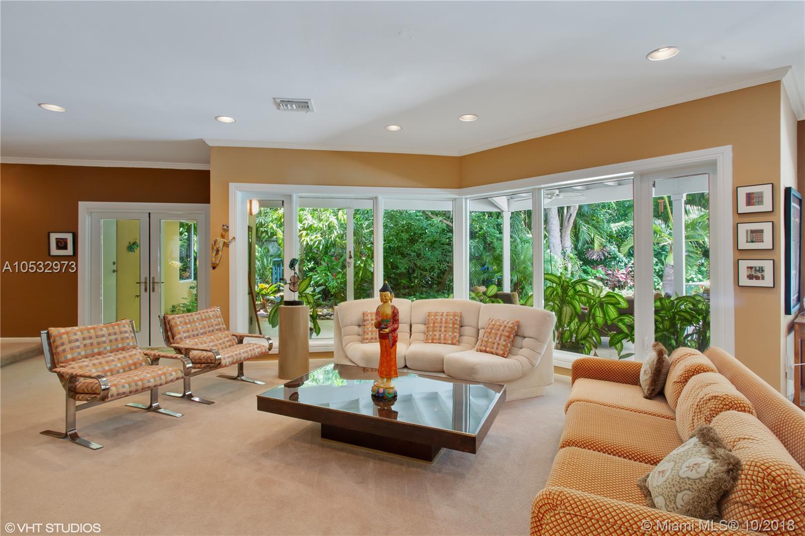 An amazing 3 bedroom 3 bath pool home located in desirable South Coconut Grove. Situated on a large 11,632 sf tropical lot inside a quiet cul-de-sac that is accessed only on a no-thru street. This architecturally interesting home has oversized impact windows & doors inviting grand vistas of lush landscaping surrounding the private fenced yard and pool. Moonlit nights treat all to quite a romantic event. Enter thru a foyer to the dramatic open living room, w/ fireplace, and formal dining room; allowing for free-flowing entertainment to the large covered patio,pool, & grounds or to the open kitchen & family room. The Master bedroom is huge, featuring large bath w/ marble/Coral Rock accents, & 3 double-sized walk-in closets. Two additional "split" bedrooms & garage complete this magical home!