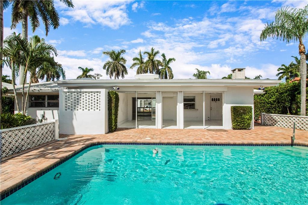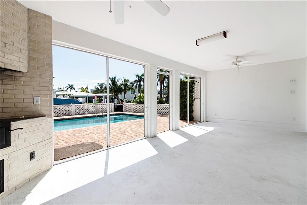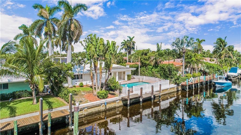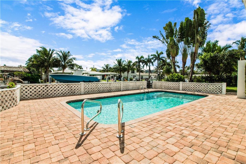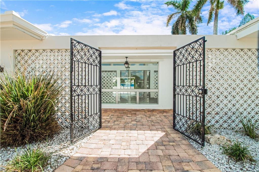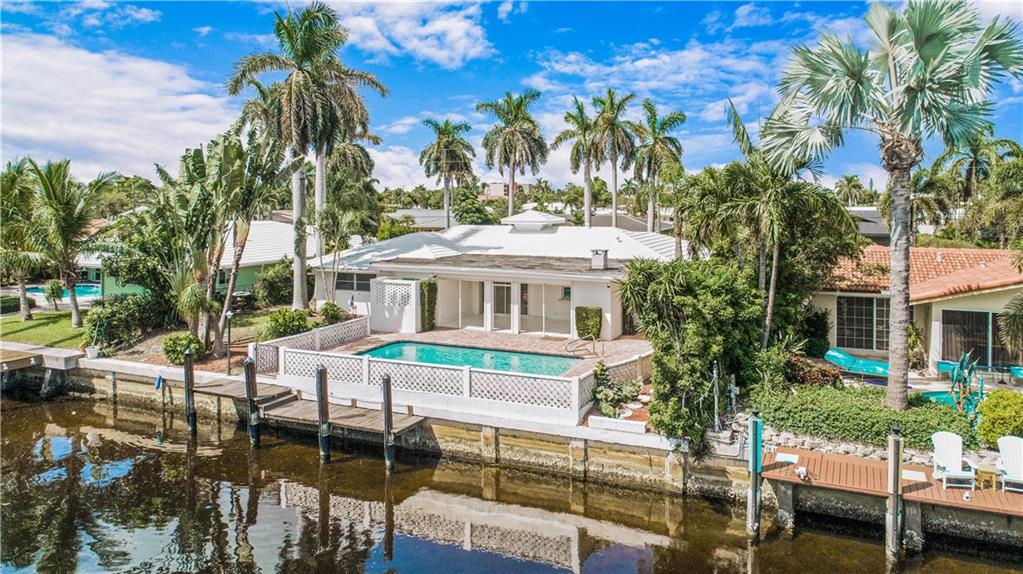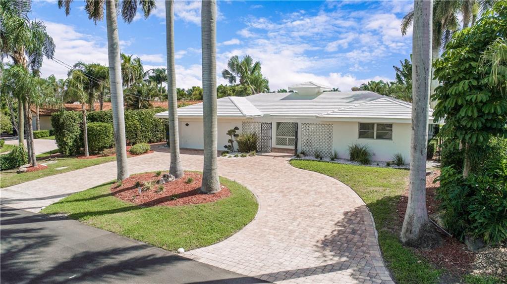 This deep waterfront home is situated on a private island with a gated entry. A day at sea is truly as close as your back door, only minutes to the Intracoastal Waterway & no fixed bridges to the Atlantic Ocean. This residence enjoys an east exposure from the back and tropical breezes over the pool and patio area. The back of the home features a covered loggia with electric hurricane shutters and a built-in bbq. The open floor plan boasts a large great room, 3 bedrooms 2 full bathrooms, a den/office, kitchen and large 2 car garage. This is an outstanding opportunity to update and make this your deep waterfront dream home. Seller has complete set of architectural & engineering drawings ready to submit. Sq. ft. from IMAPP.