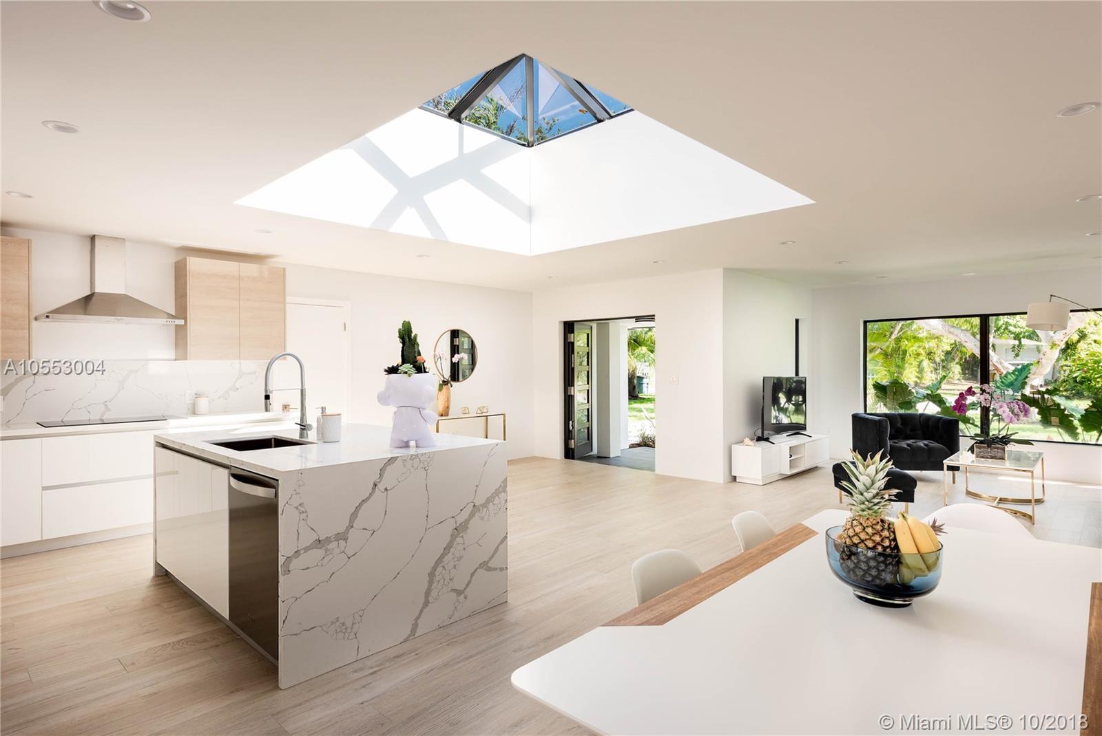 Dream house in Miami shore. Fully renovated with a unique 100sq/f Skylight on a quiet cul-de-sac street. Come to see this European style house made by a french designer. This stunning house features new roof, new high impact windows and steel double front doors, new A/C system and many more. The porcelain wood look tiles add a welcoming touch on this huge family room and integrated kitchen. The skylight, the numerous and large sliding doors transform the space into a true in/outdoor living experience. Come to see this breathtaking, modern and exclusive house. Other features: master suit with double shower and walking closet, big wood deck, outdoor patio, new garage, new pool resurfacing Inside tiles and stone, new sprinkler system, new driveway, and new inside and outside lighting system