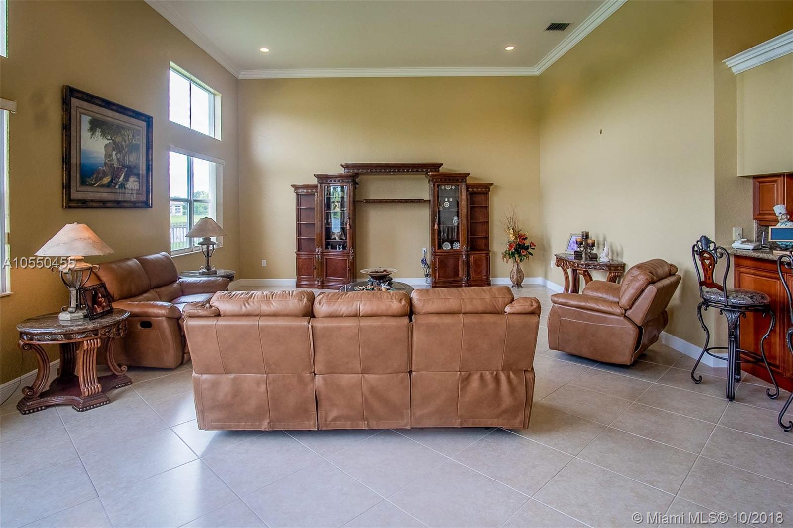 ABSOLUTELY SPECTACULAR HOME A MUST SEE!!! This home has all the imaginable upgrades including crown moulding in every room, tray ceiling in master, built-in sound system, wet bar, gorgeous tile floors, full guest/pool bathroom, all recessed lighting, walk-in kitchen pantry and much more. The 5th bedroom can be used as a den/office. The home has abundant natural light throughout. 3 zone a/c system in perfect condition as well as a new HWH. The home is situated on an expansive lot with a 180 degree lake view. All openings have shutters in the event of a storm. The home has never been lived in since originally purchased and perfectly maintained.