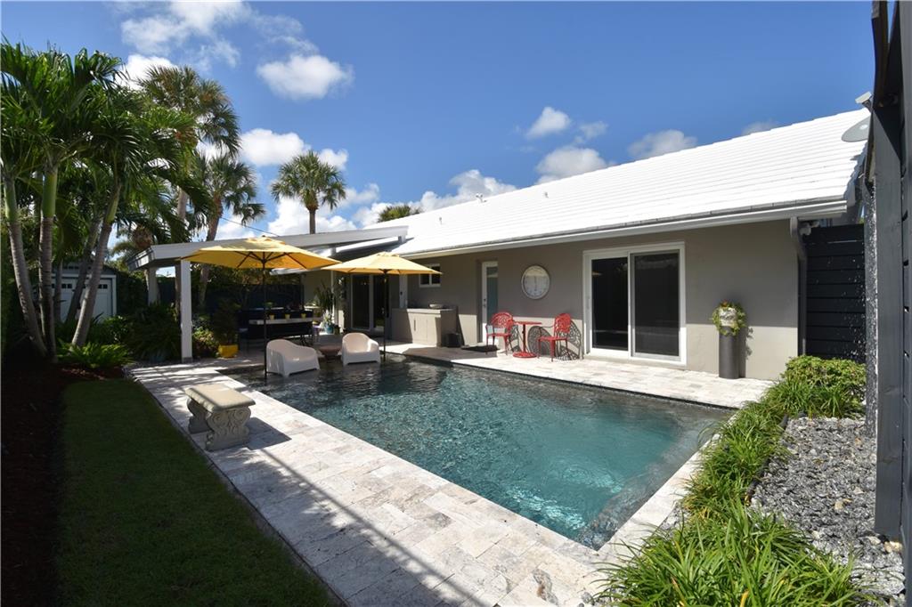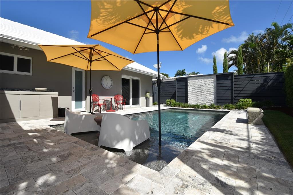 Designed by renowned South Florida Mid-Century Architect Lester Avery completely renovated pool home features a open floor plan and professionally restored gleaming terrazzo floors throughout. Freshly painted and exquisitely landscaped offers superb curb appeal. Kitchen with walk-in pantry, quartz counters, stainless steel appliances, and large center peninsula. Dinning room opens to separate outdoor dinning space with living room overlooking covered lanai and tropical garden. Master suite boast of inviting pool & garden view, walk in closet and bath with pool access. Spacious and beautifully landscaped outdoor area pool deck with water-fall wall feature makes for perfect entertaining. Salt water pool has auto-fill. Separate laundry room and storage including a walk-in attic. A Must See!