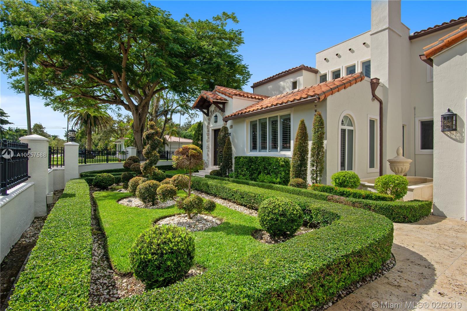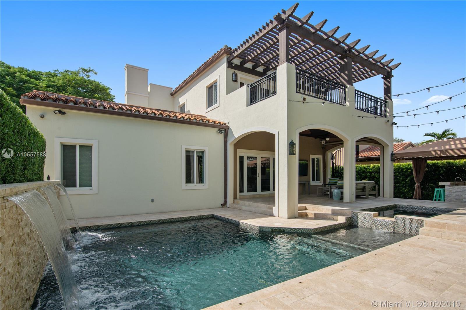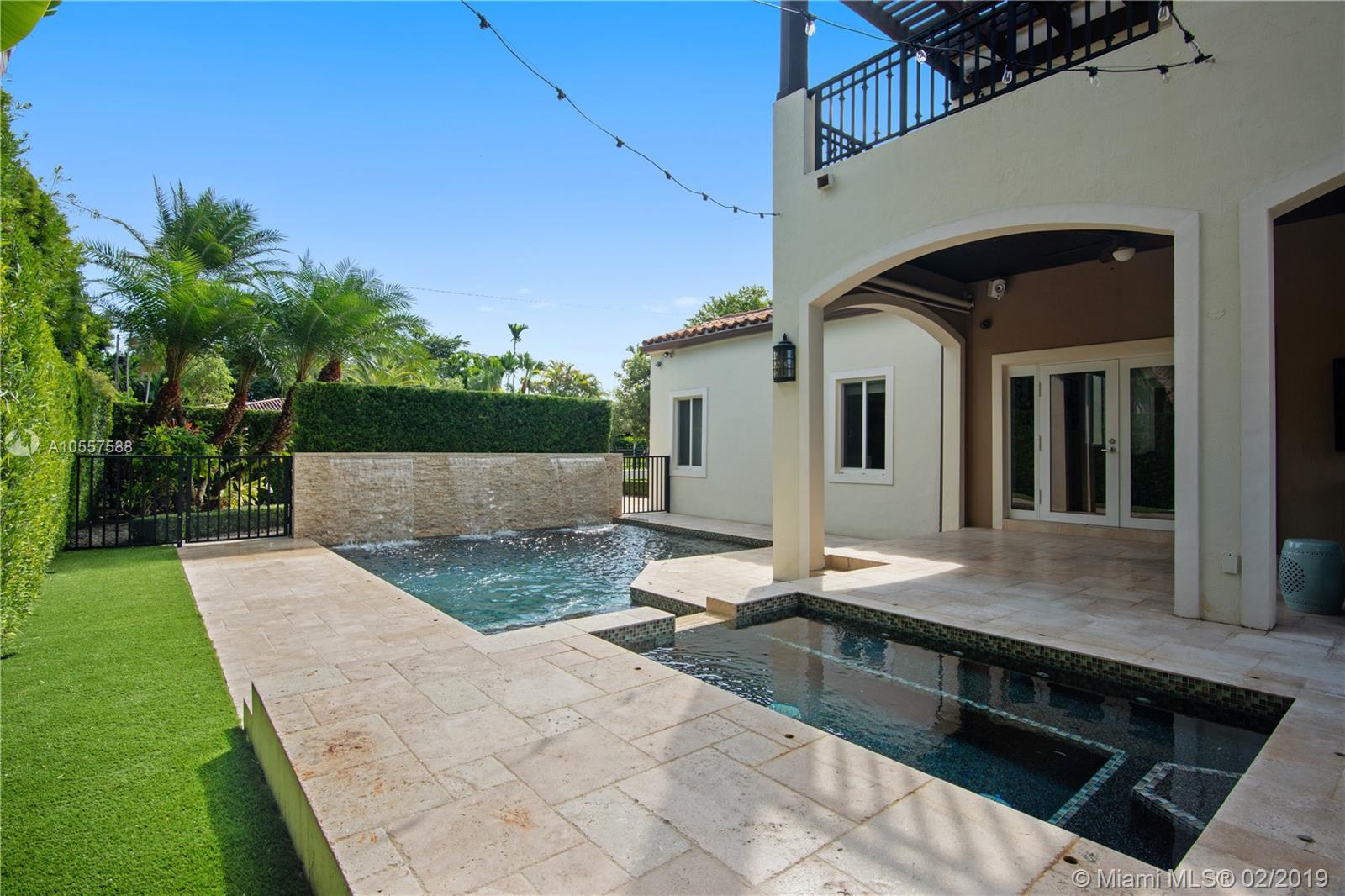 Completely renovated Mediterranean masterpiece, with a seamless 2010 addition,offering a classic contemporary modern design.Brimming with architectural beauty such as a grand foyer entrance, delicately refinished wood floors,Calacatta marble fireplace,recessed ceilings enhanced with state of the art lighting, security,sound,camera and irrigation systems.Upstairs,a spacious & dramatic master suite with custom vanities, quartz countertop,metallic paint,venetian mirrors,a glorious terrace + an additional bedroom with ensuite bath. 3 bedrooms,2 baths downstairs.Pretty pool and spa w/ remote waterfall, fountain, a tranquil covered lanai & summer kitchen. Walled & gated for privacy, this residence offers immense curb appeal near Riviera Country club, fine dining, theaters, neighborhood parks..