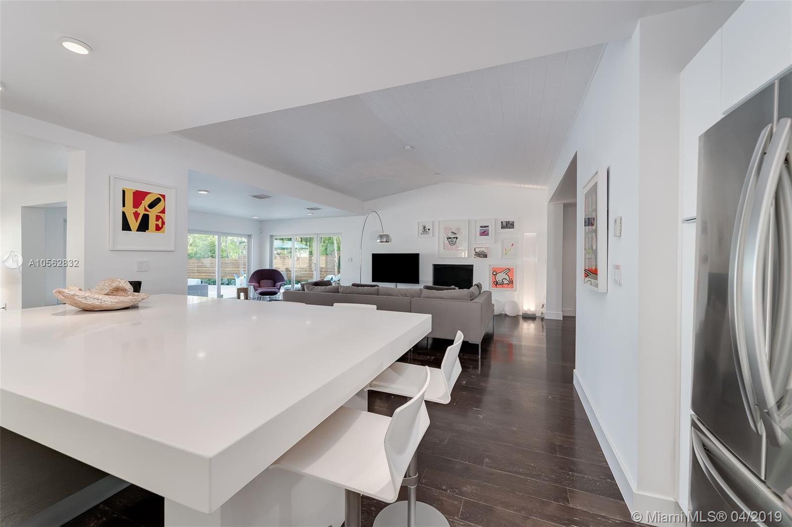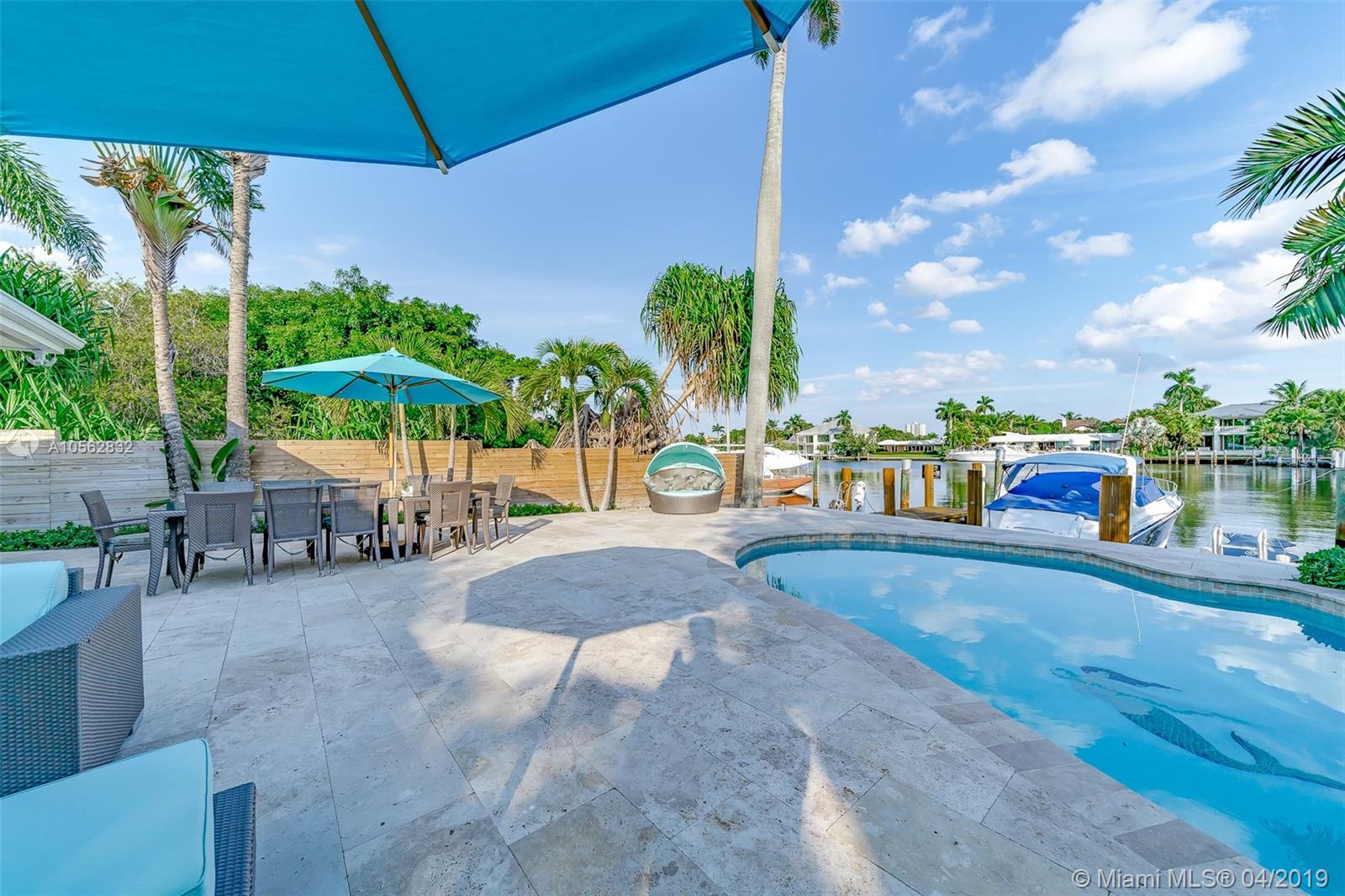 Amazing and unique "MIMO" waterfront home on prestigious Bayview Drive in Fort Lauderdale. Walk or bike to Coral Ridge Yacht Club, Galleria Mall, Dining/Shopping, or the Beach! As you enter through the artfully chosen stainless steel double front doors, the oversized windows and glass doors facing the east reveal a stunning back patio/pool area with an extra wide view of the canal 'lake' from the backyard. Private dock for up to 65' vessel; ocean access with no fixed bridges. Light and bright modern interior design: clean lines, warm natural wood floors, vaulted ceiling in living area, Duravit and Hans Grohe in all bathrooms, Bosche/Siemens kitchen appliances, original "Midcentury" wood spiral stairs to master bedroom. Hurricane impact windows, fenced yard, and seawall recently renovated.