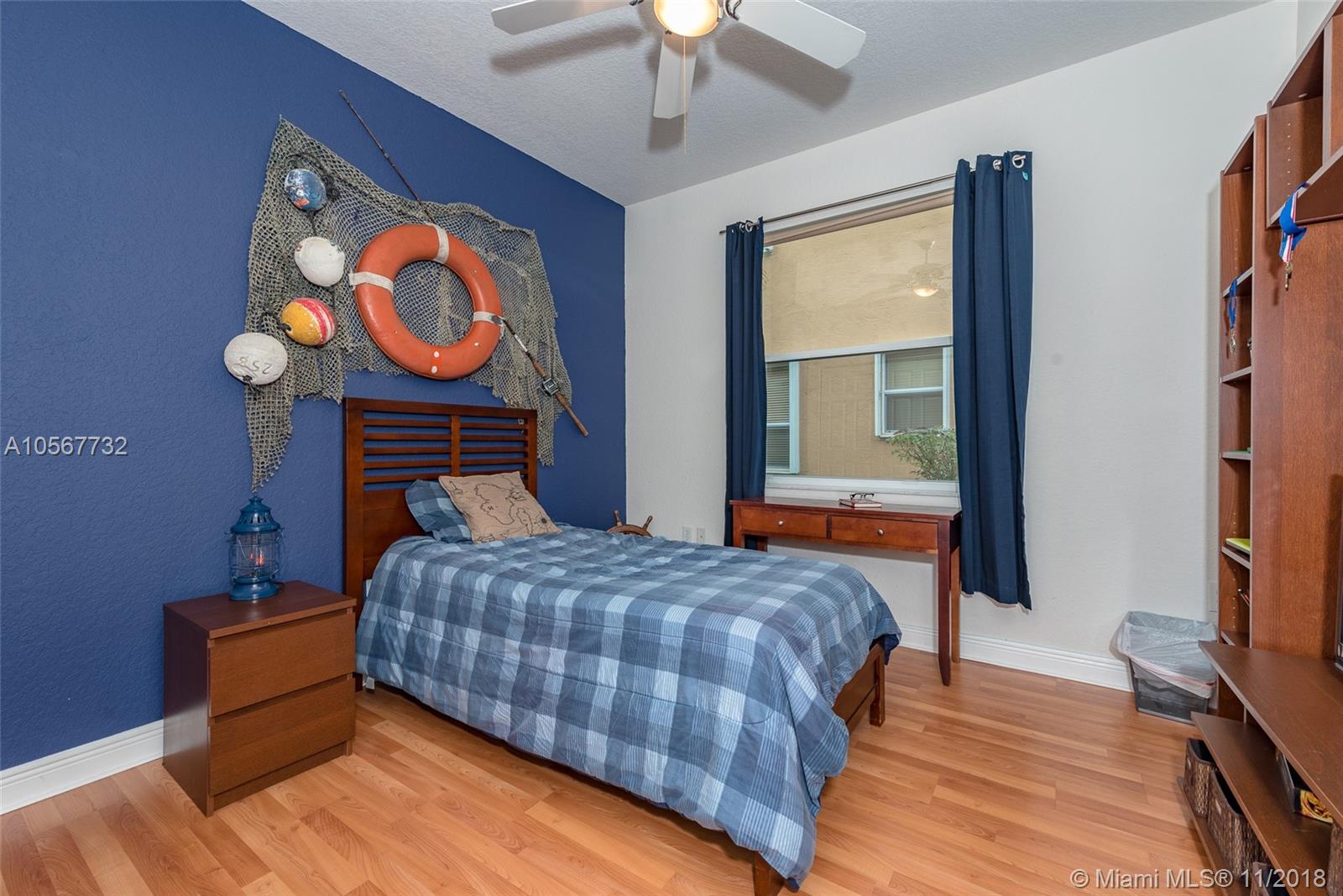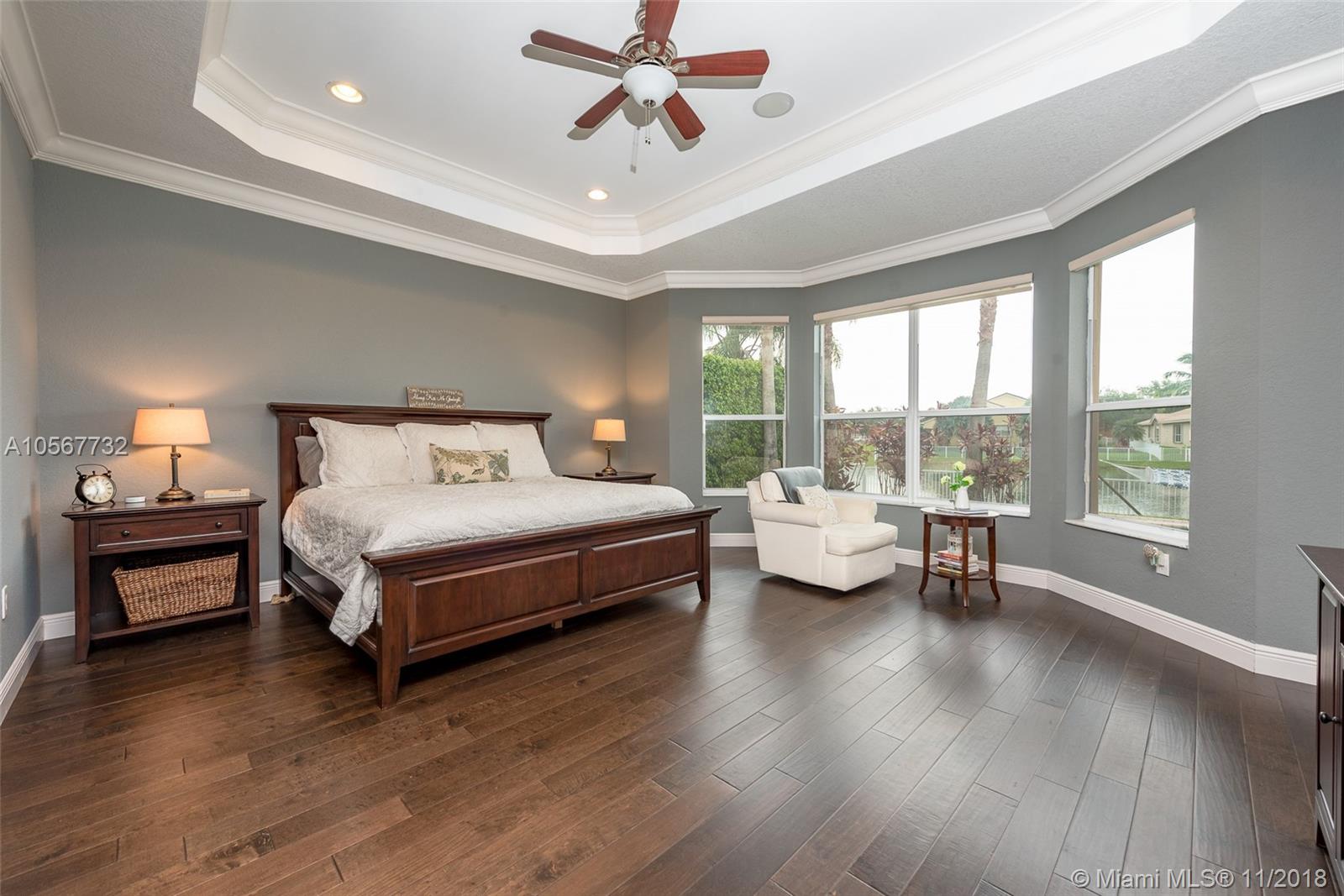 Spectacular Sofia Model home with stunning pool and great Lake view in Sunset Lakes. Home features 5 bedrooms, 3 full bathrooms, laundry room, and 2 car garage. Completely upgraded with high ceilings, tile throughout living area, wood flooring in the bedrooms, quartz countertops, and cherrywood cabinetry in the kitchen , and baths. Home is equipped with surround sound, intercom, and exterior speakers. Brand new appliances were recently installed in 2015, including 2 a/c units, double ovens, dishwasher, refrigerator, washer & dryer. Enjoy beautiful living in this lovely community at Sunset Lakes which includes, guarded gate, clubhouse, pool & spa, 8 tennis courts, exercise room, along with ADT security system, and Xfinity cable included with the HOA.
