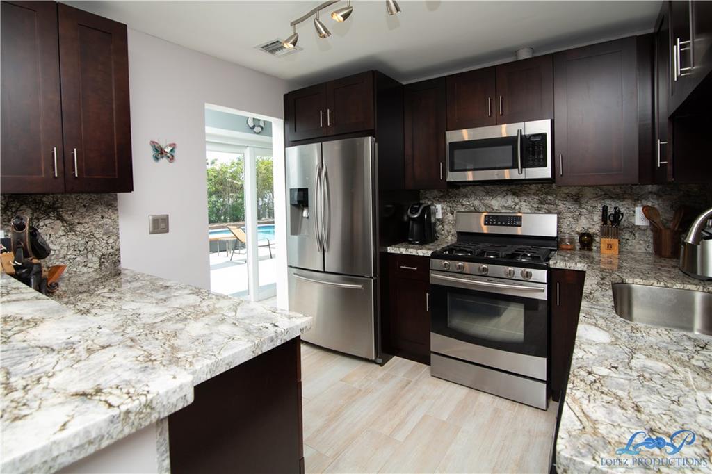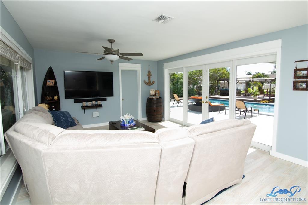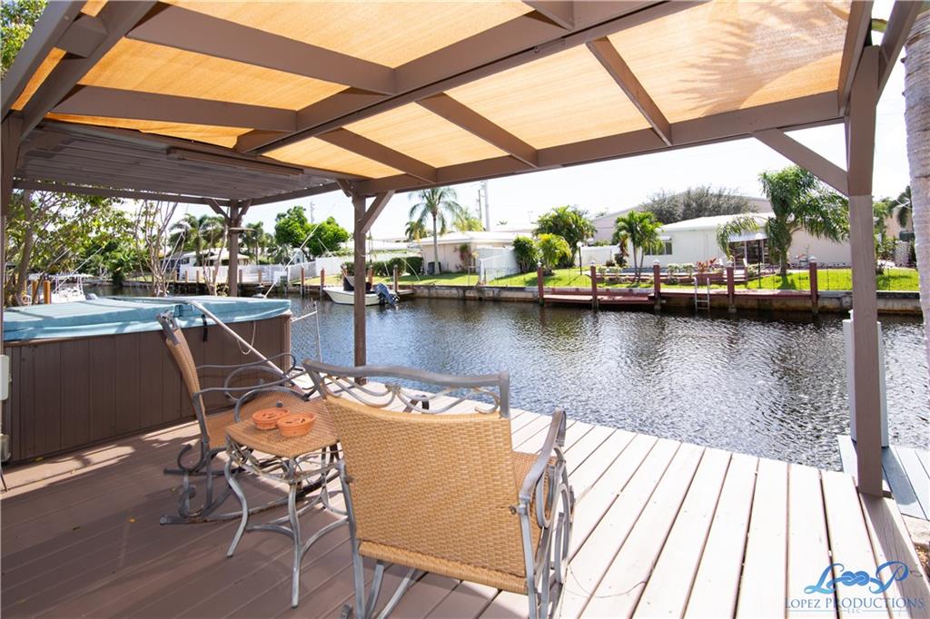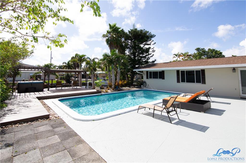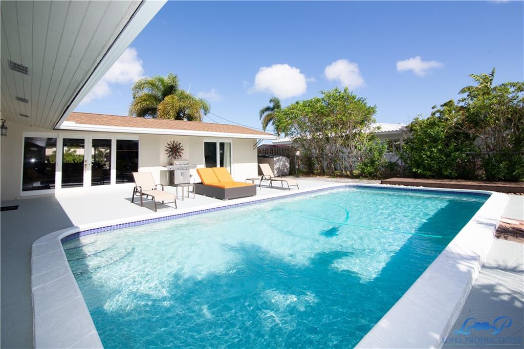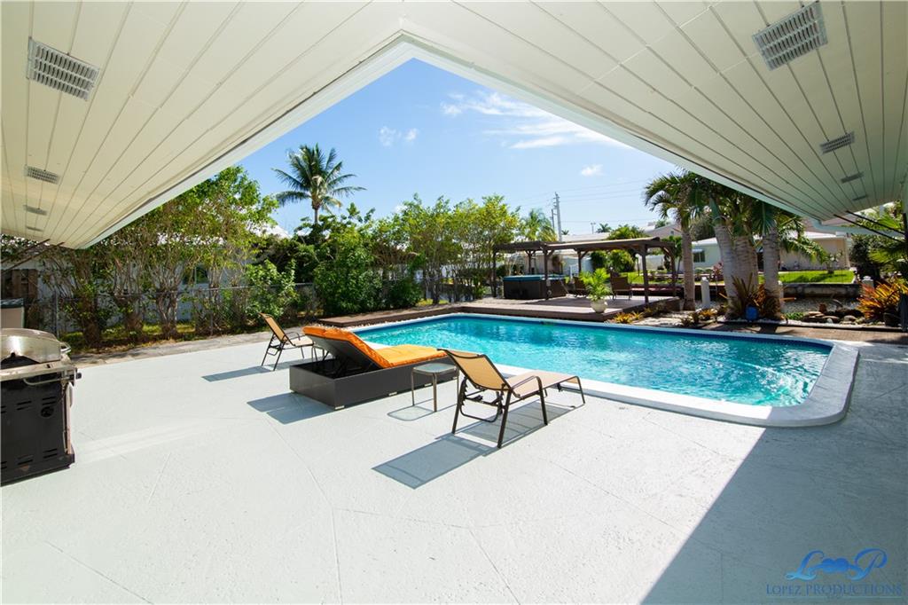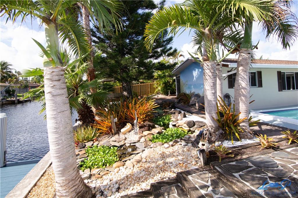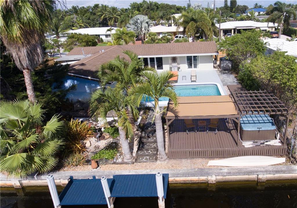 This move-in ready home is a beautifully renovated waterfront property with ocean access east of 95! Many features of this home have been updated, including kitchen, flooring, bathrooms, newer appliances, and partial impact windows (full panel covering for other windows). The backyard is an incredible space for entertaining, with a pool, hot tub by the water, coi ponds, and multiple sitting/lounge areas. The stove and water heater are gas, back yard is fenced in, extra storage area outside, dead-end street, built-in office, and a circular driveway with great parking space. This home is currently configured as a 3 bedroom with a den, but can be used as a 4 bedroom