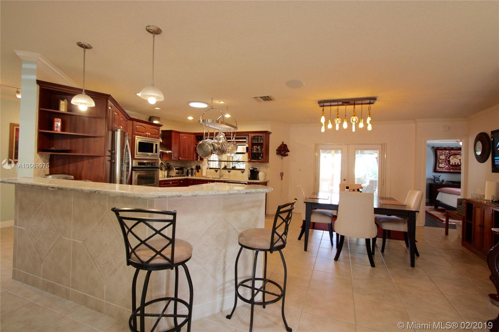 Gorgeous waterfront home with pool and ocean access. Split bedroom layout and huge master suite. Newly remodeled master bath has Italian tile, Toto WASHLET toilet, freestanding Neptune bubble tub and dual sinks. Huge walk-in closet has California Closets. Open gourmet kitchen has wood cabinets, granite counters, stainless steel appliances including wine cooler. Lots of nice details throughout home like crown molding, wood-scraped tiles, designer ceiling fans. Multiple French doors open to enclosed, screened lanai. Heated pool has waterfall and salt water chlorination. Newer 60’ seawall and 40’ permitted, composite wood dock. Ocean access with one fixed bridge. Accordion hurricane shutters, portable generator, alarm system, speakers, sprinkler system, new roof in 2006. Large 2-car garage.