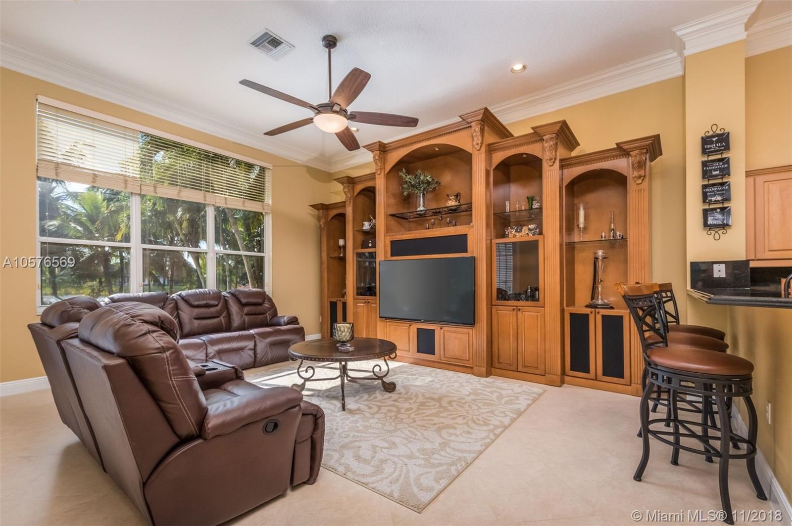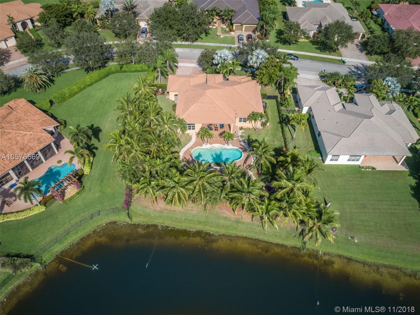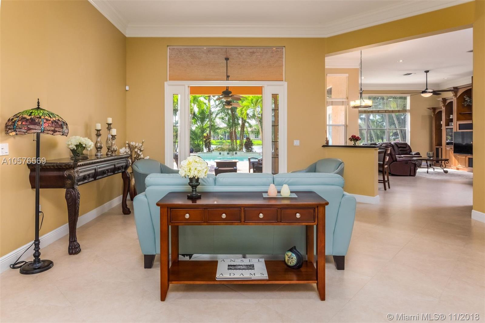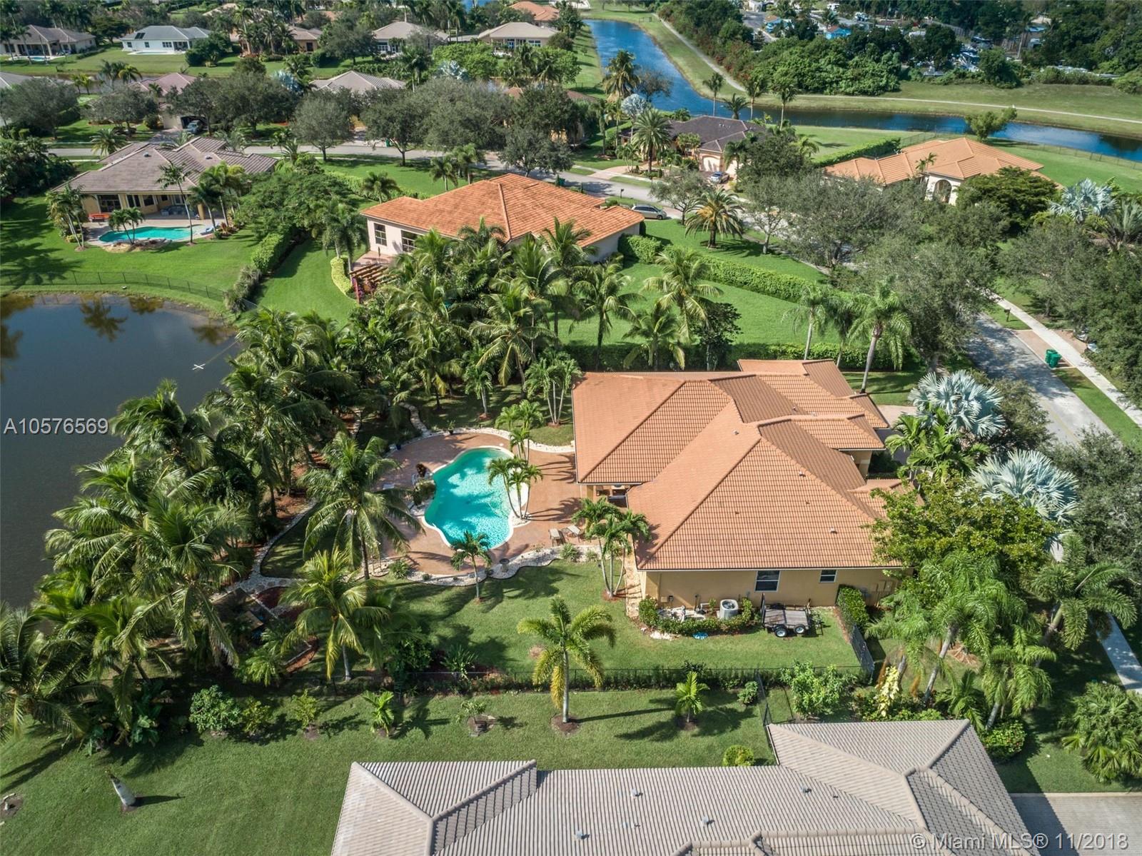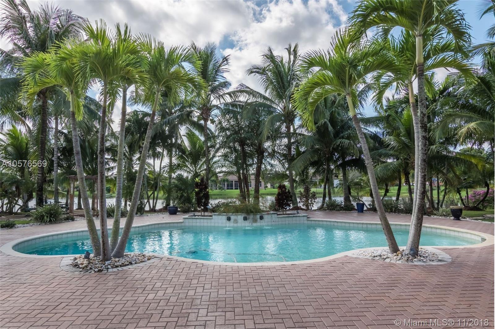 Imagination Farms is a west Davie outstanding community. On the NE corner of I75 and Griffin Rd, major highway access is a huge bonus. "A retreat in the burbs" is situated on a 43,308sf waterfront lot. Imagine your family enjoying this amazing space. Inside, find updates like elegant crown and chair rail moldings, oversized baseboards, neutral porcelain tile and real wood flooring, granite tops/backsplash, newer stainless appliances, cabinetry in pantry and a master closet. Salt system pool with new pump and waterfall. Also alarm, water filtration system, wall unit, all ceiling fans, light fixtures, garage openers and pool equipment stay. Natural light is abundant. Just feels like HOME. Office furniture is negotiable. Take a moment, view the video and photos of this inviting home.