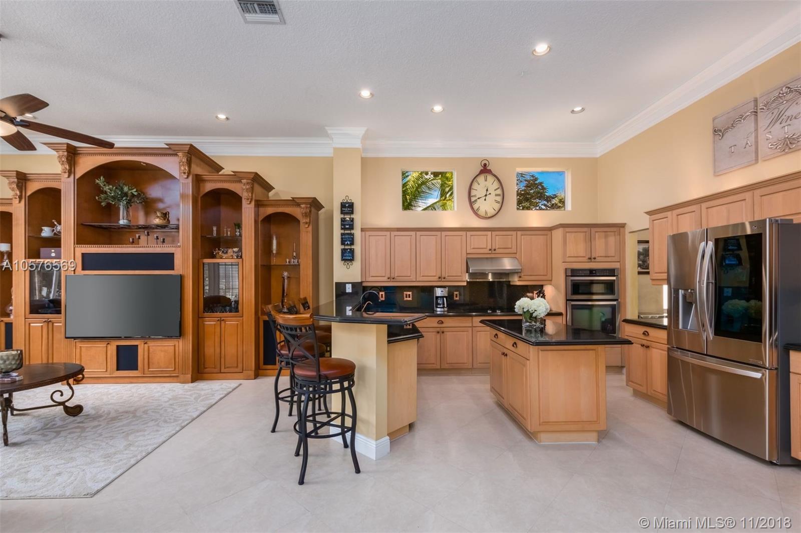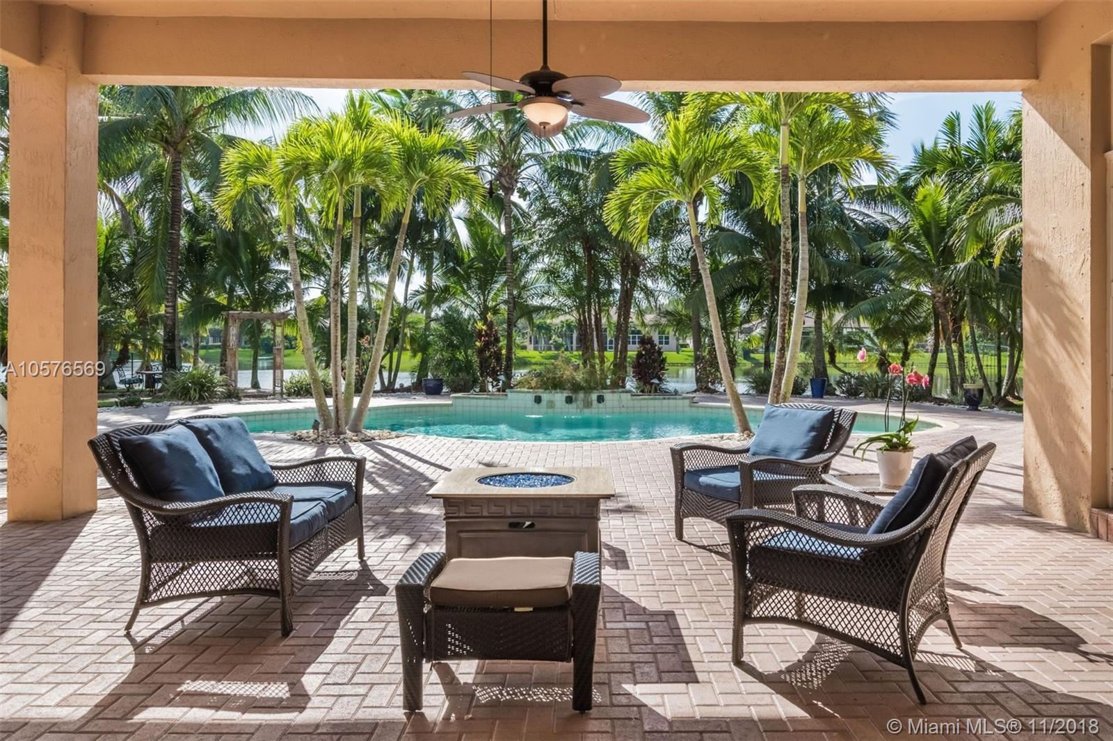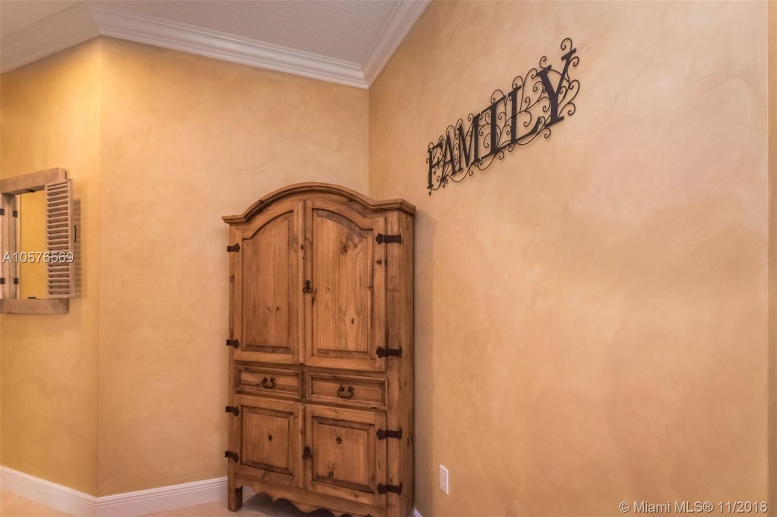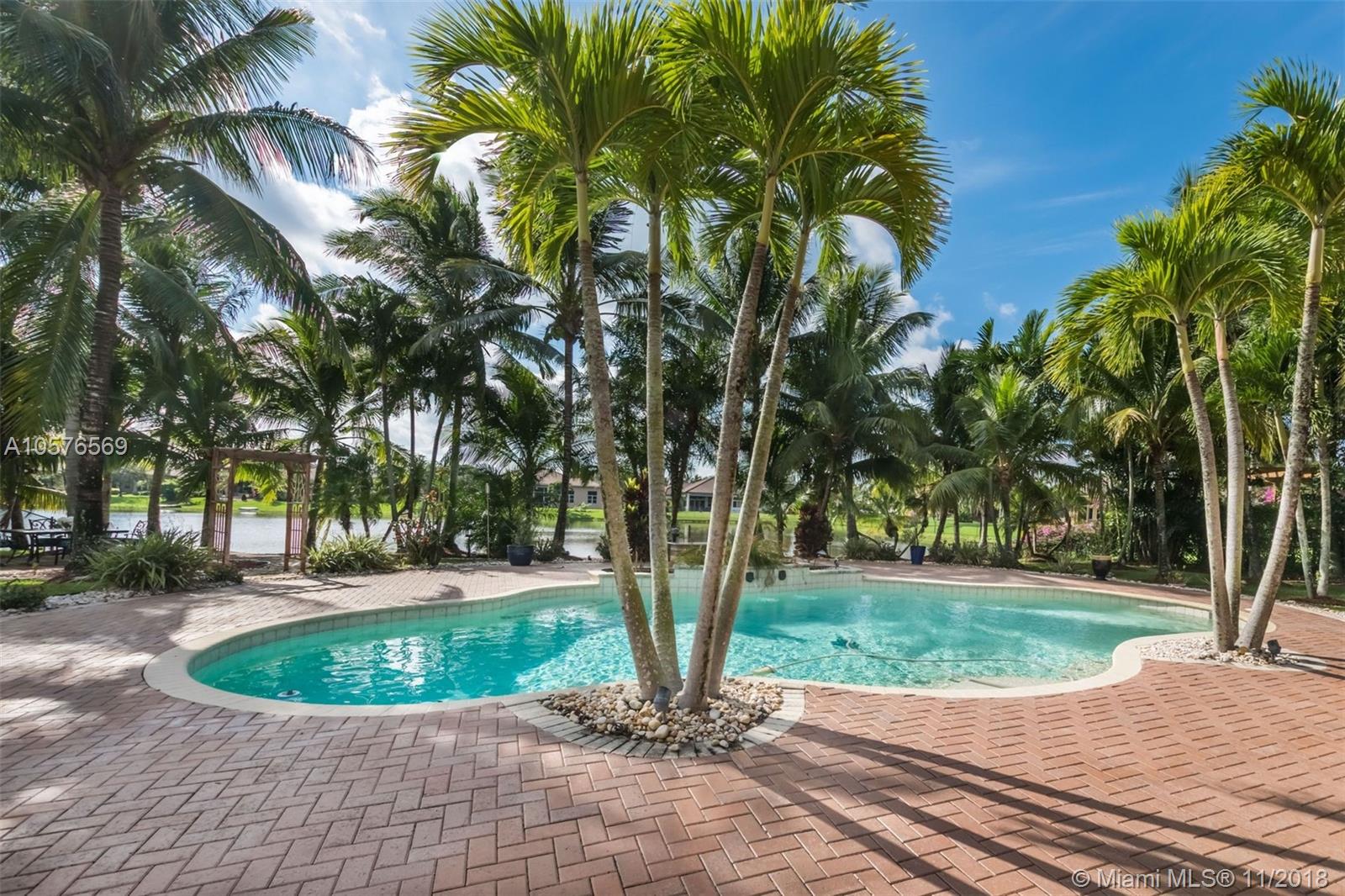 Imagination Farms is a west Davie outstanding community. On the NE corner of I75 and Griffin Rd, major highway access is a huge bonus. "A retreat in the burbs" is situated on a 43,308sf waterfront lot. Imagine your family enjoying this amazing space. Inside, find updates like elegant crown and chair rail moldings, oversized baseboards, neutral porcelain tile and real wood flooring, granite tops/backsplash, newer stainless appliances, cabinetry in pantry and a master closet. Salt system pool with new pump and waterfall. Also alarm, water filtration system, wall unit, all ceiling fans, light fixtures, garage openers and pool equipment stay. Natural light is abundant. Just feels like HOME. Office furniture is negotiable. Take a moment, view the video and photos of this inviting home.