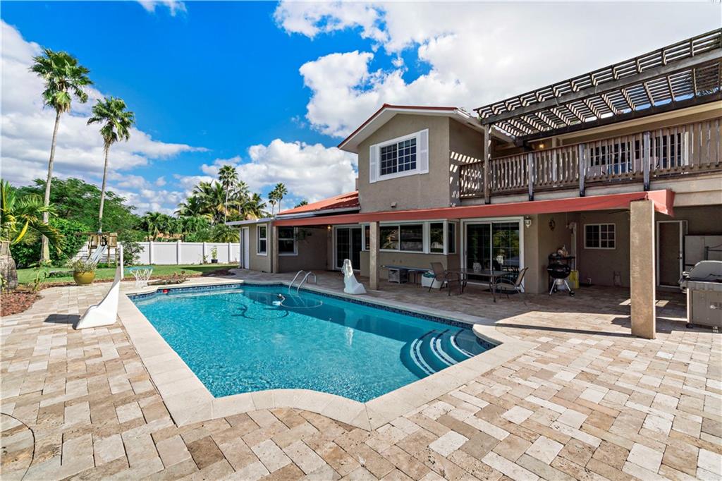 Largest lot in Cypress Run! Rare 2-story, 4-BR, pool home on lake. Major improvements incl a newer Key West-style metal roof, 2-zone A/C, impact glass windows & doors, diamond-brite pool. Remodeled EIK w/SS, lrg center island w/cook top, range hood, wine fridge, granite & butler’s pantry! Interior offers a formal DR, LR w/exposed wood volume ceiling, reading rm w/wood-burning fireplace, family rm; extra storage rm; ½ bath 1st fl; sep laundry rm. Tile, carpet; hardwood bamboo in spacious Master w/sliders to terrace for amazing wide-water views; volume ceilings, WICs. 3 lrg BRs, dual sink 2nd bath. Plantation Shutters, flat screen in EIK & all blinds stay! HUGE backyard w/pool, true cabana bath, outdoor shower, covered barbeque area, fire pit, fruit trees, tons of green space & more. NO HOA!